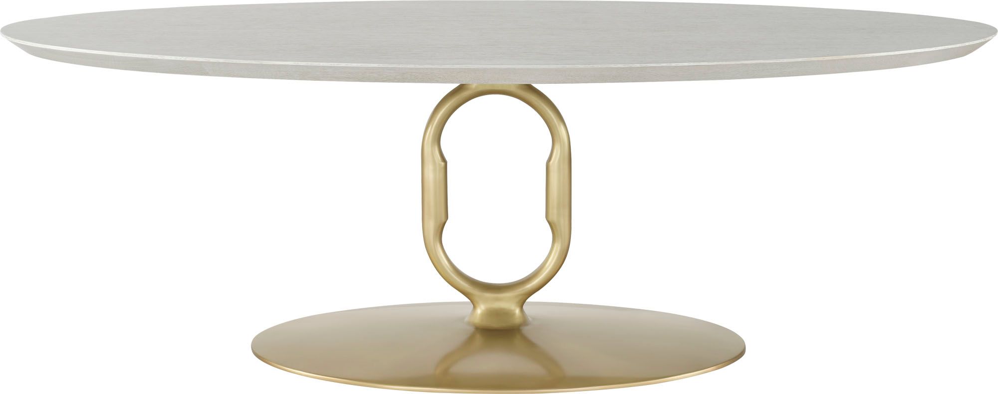 The Link Oval Dining Table is an oak and bronze masterpiece with a remarkable silhouette. Its bronze base is inspired by the clasp and cuff detailing of luxury fashion and jewelry.