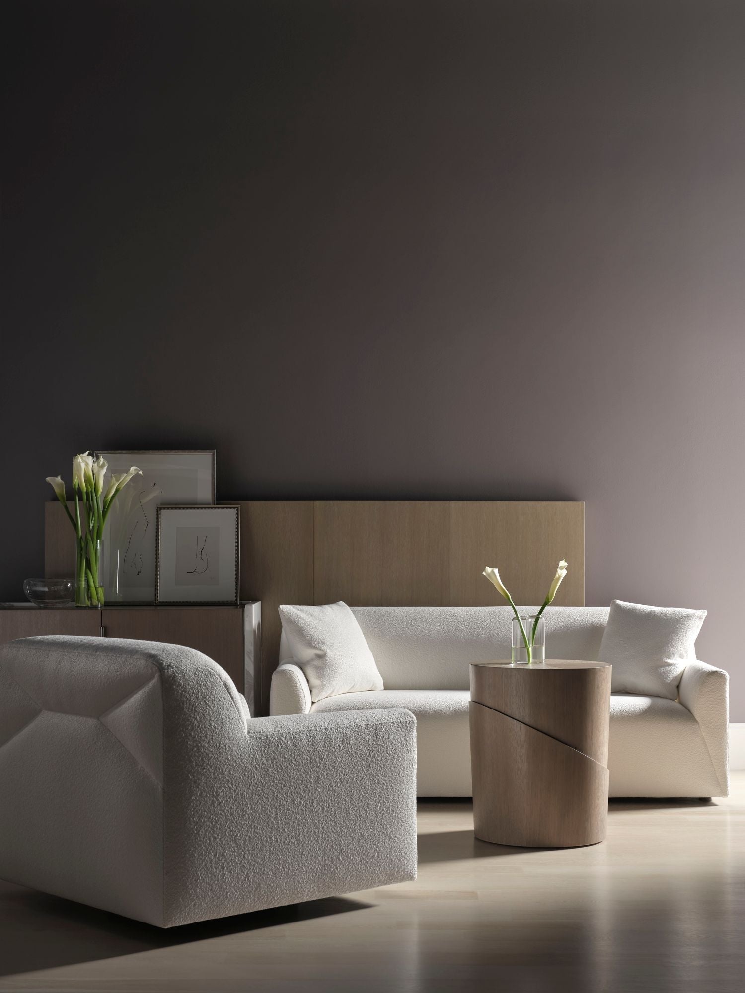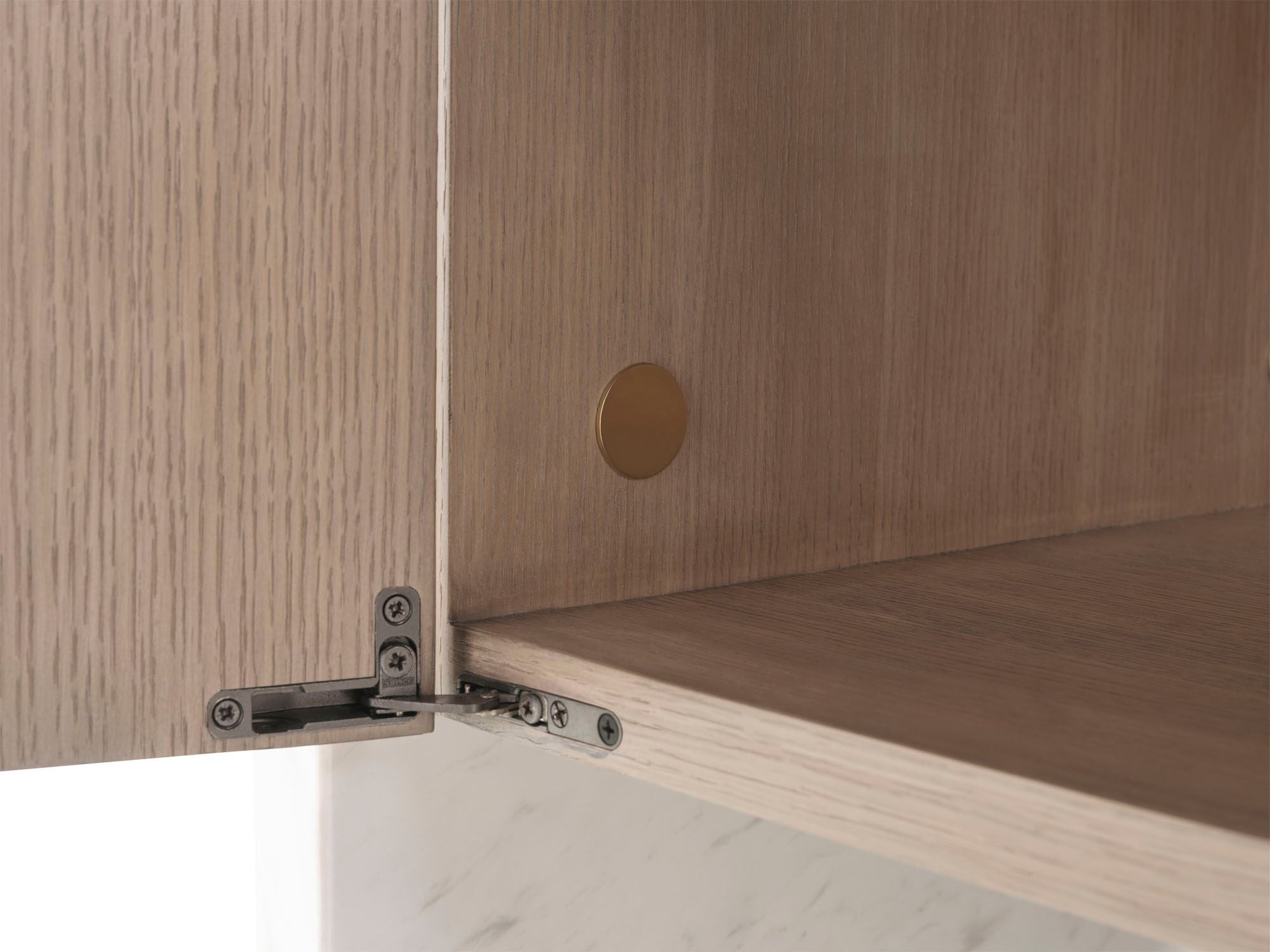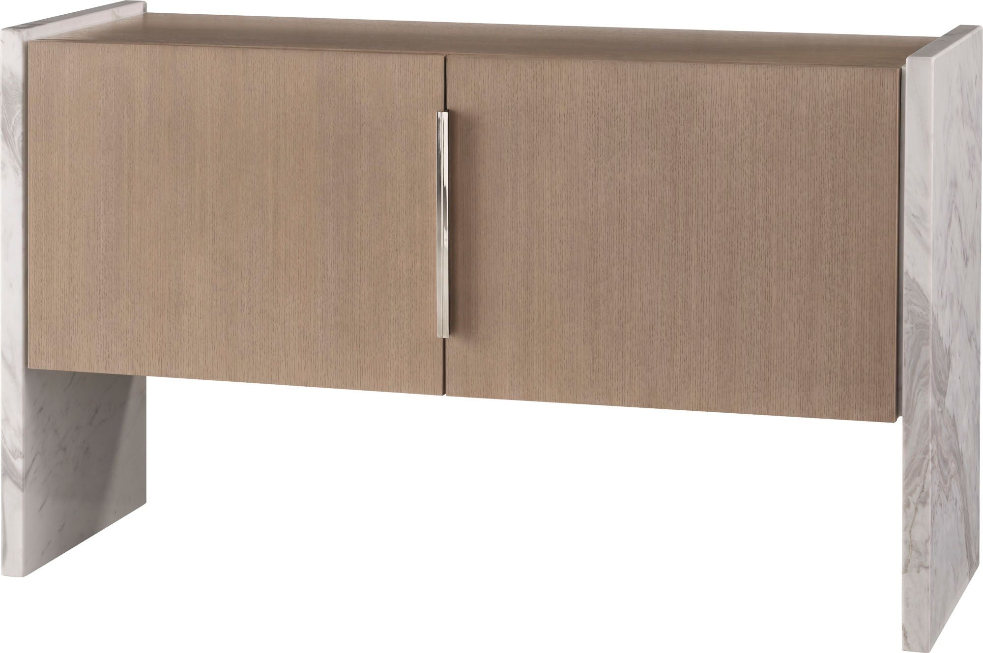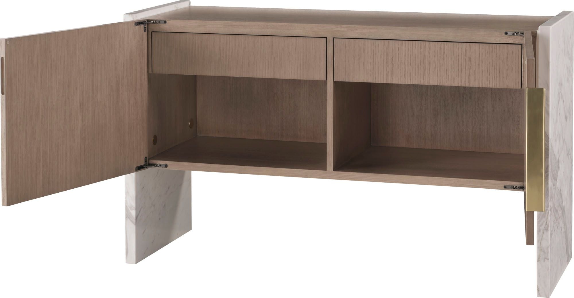 The Sage Sideboard is a study in modern materiality, with an elevated pairing of wood and stone elements. Side and back panels are enveloped in polished Hena White marble, while the case features quartered oak veneer and hardware in Nickel Plated Brass or Pure Brass.