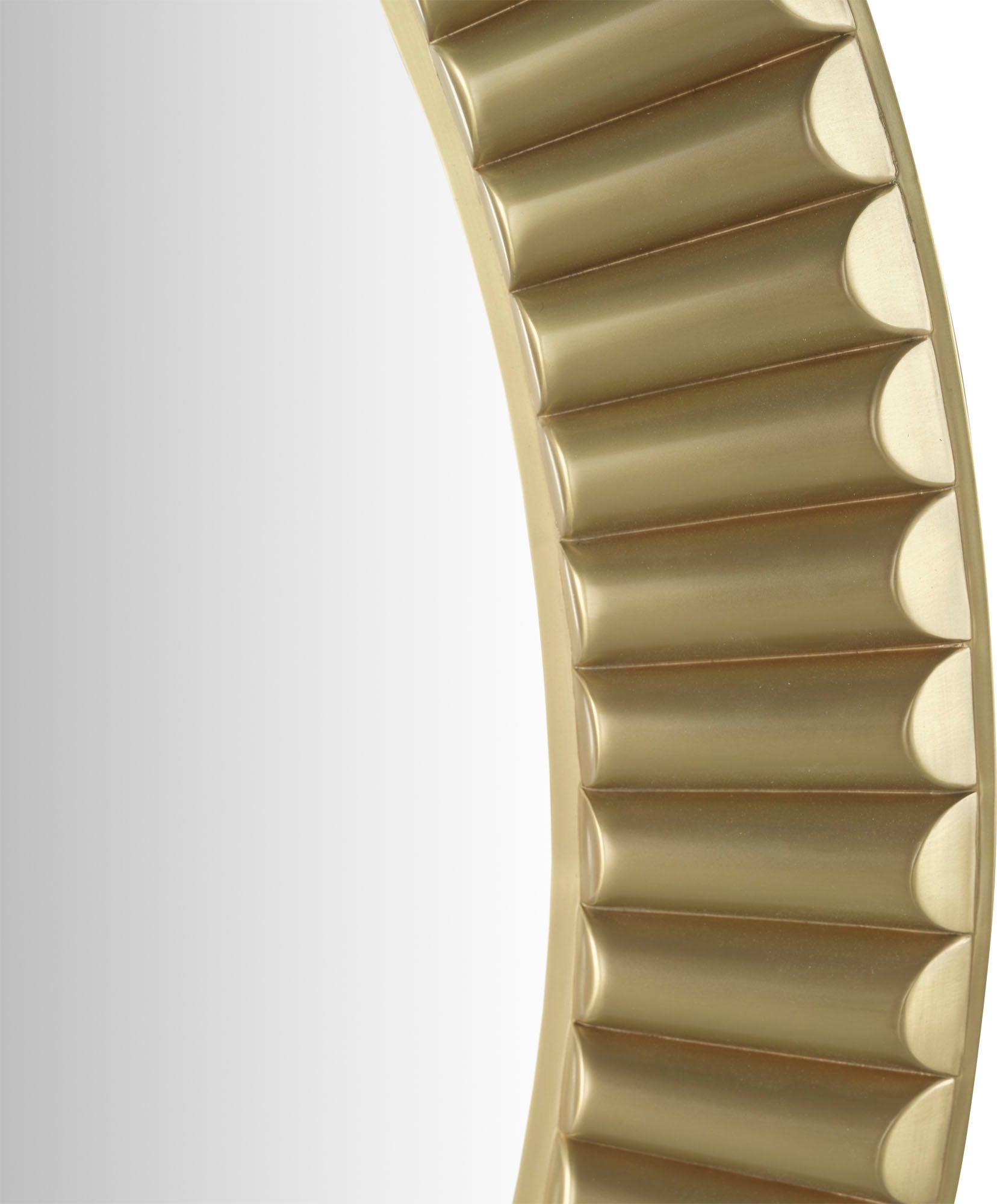 Like the bezel styling of a classic wristwatch, the Summer Solstice Mirror is surrounded by shimmering material. A bronze frame holds a clear mirrored surface.