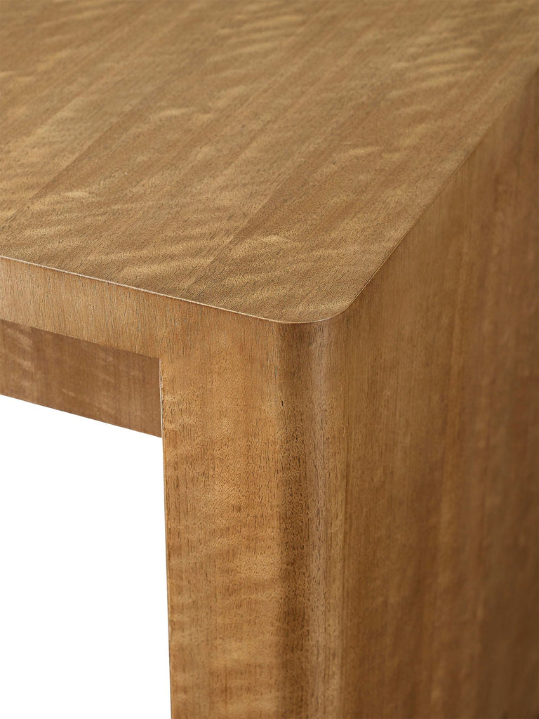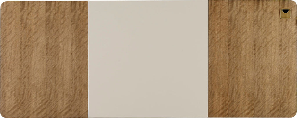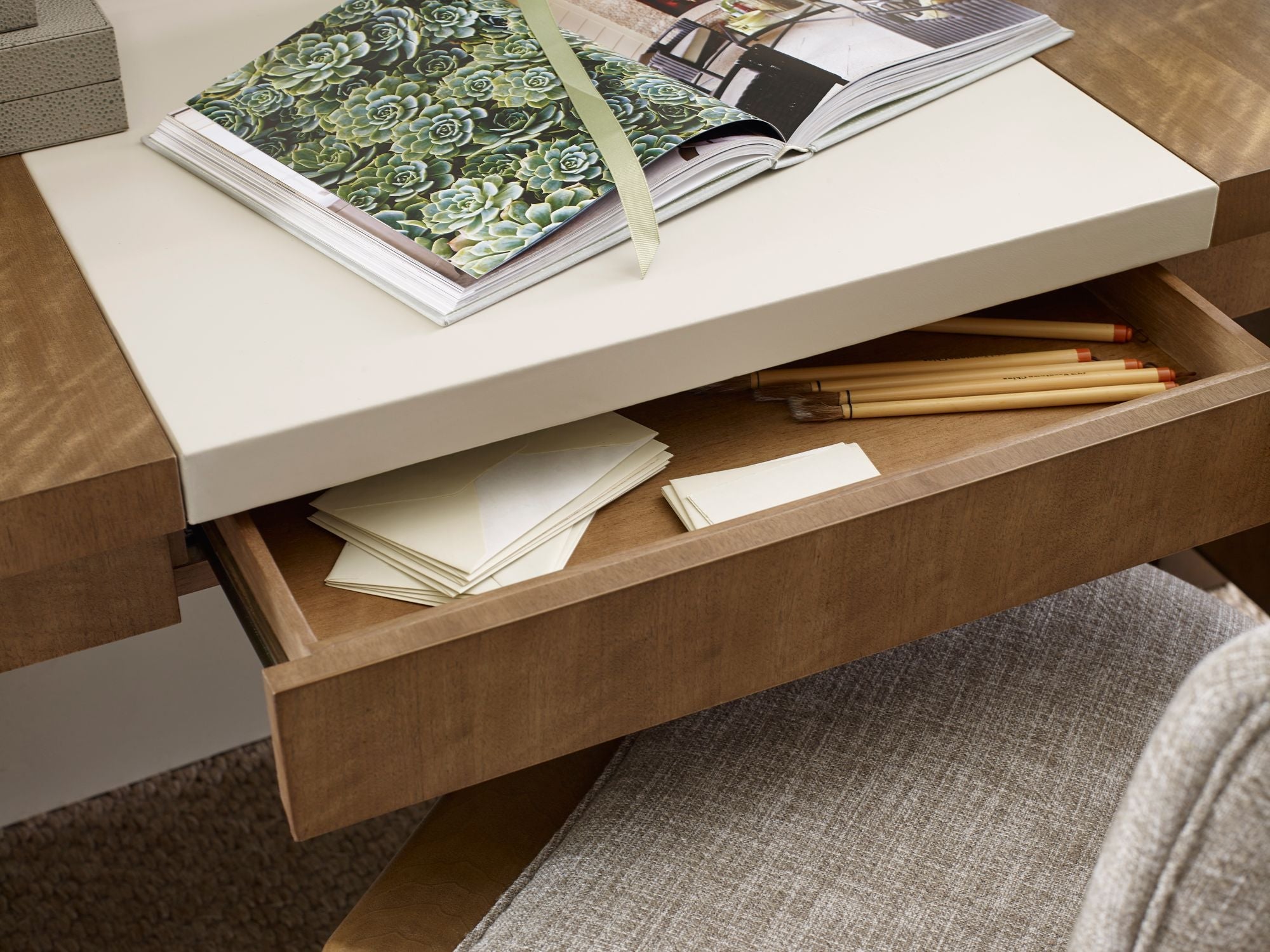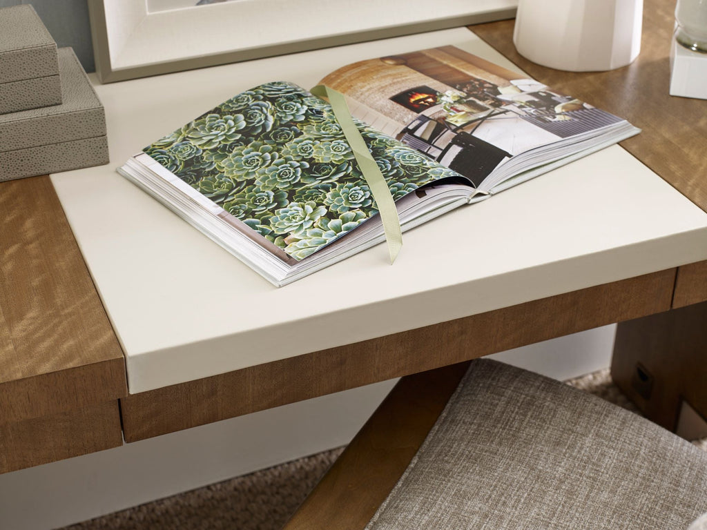 The Waterfall Desk is a modern desk profiled in quartered figured walnut with a center ivory leather top and 3 wood drawers. The desk has warm bronze grommets with a cover and rests on a Warm Bronze base.