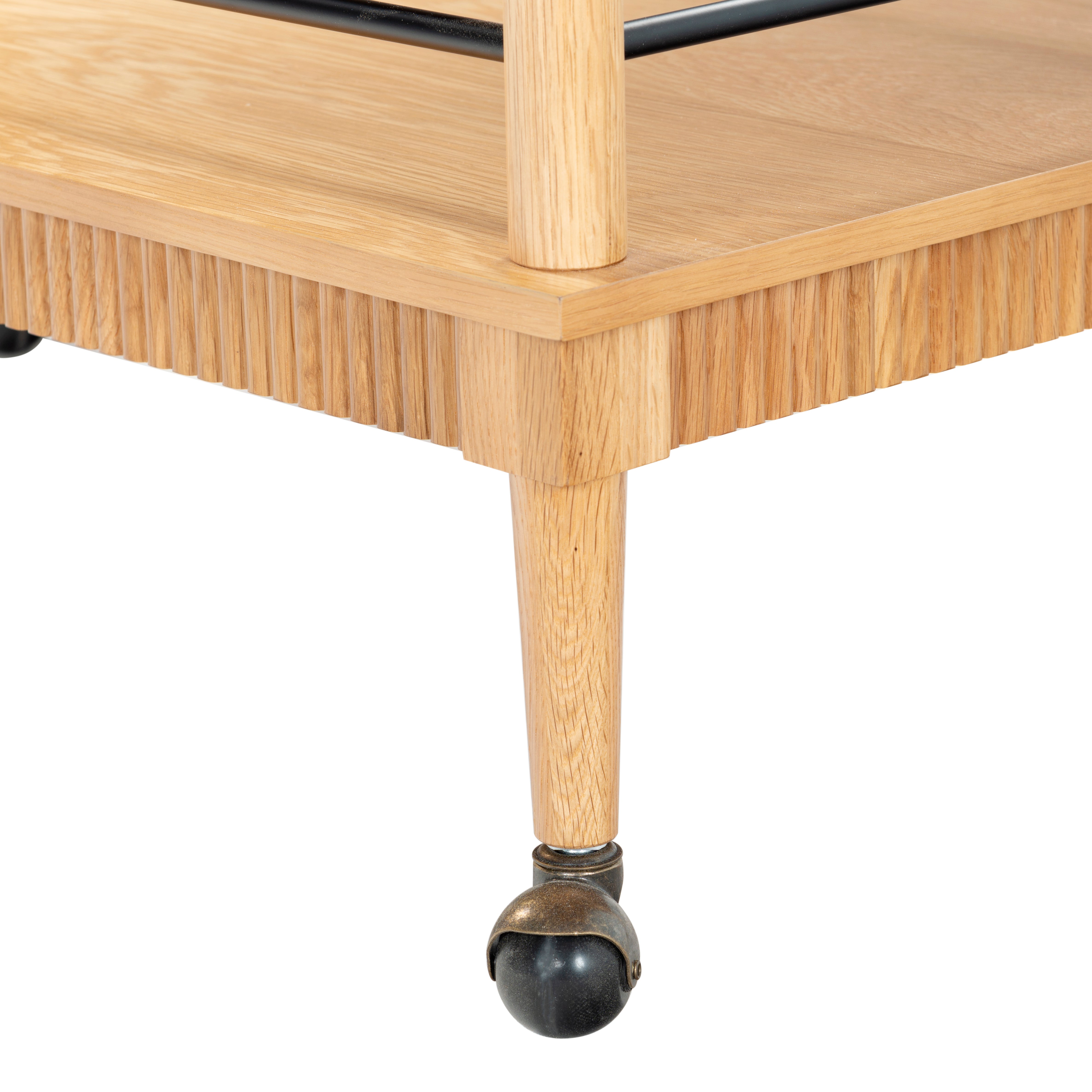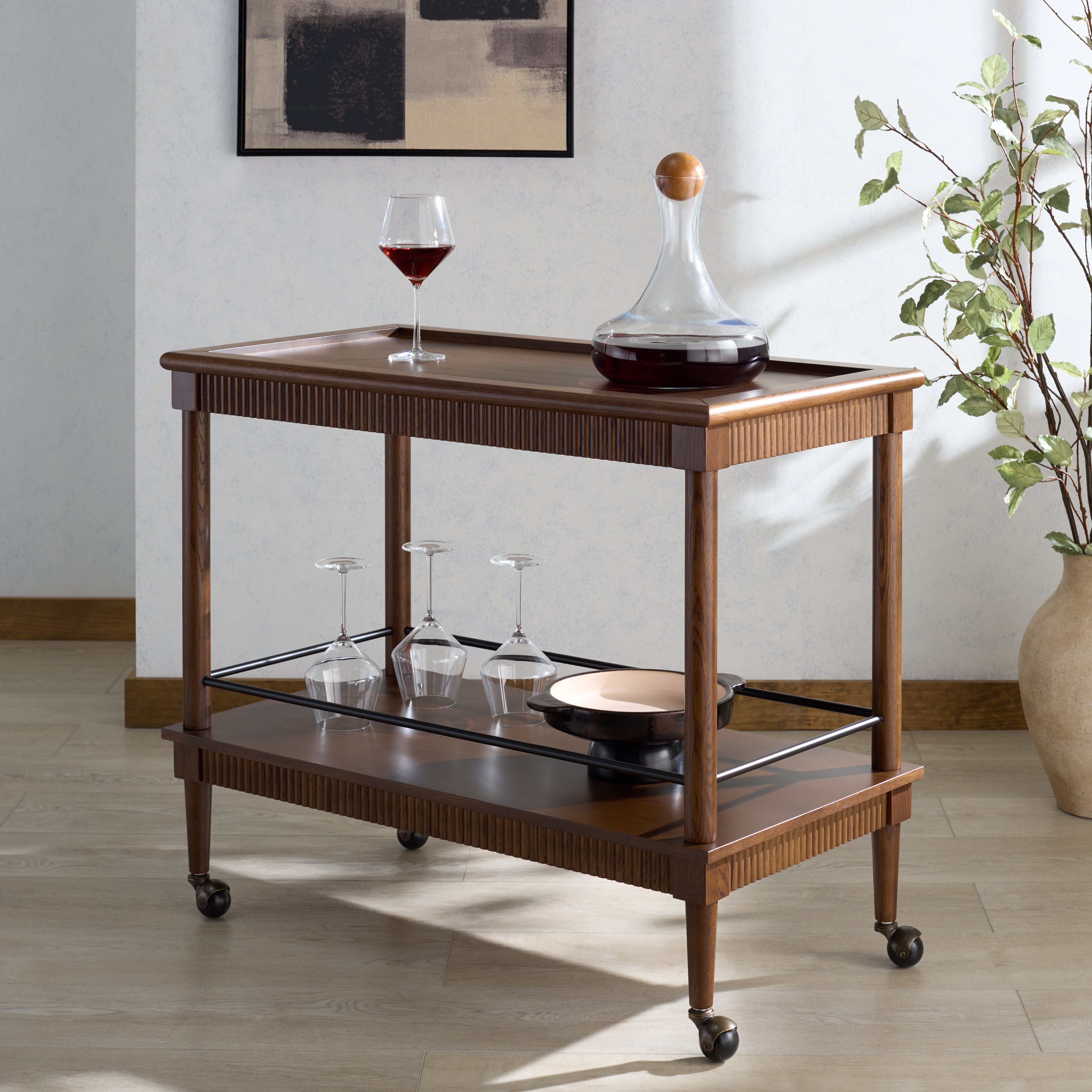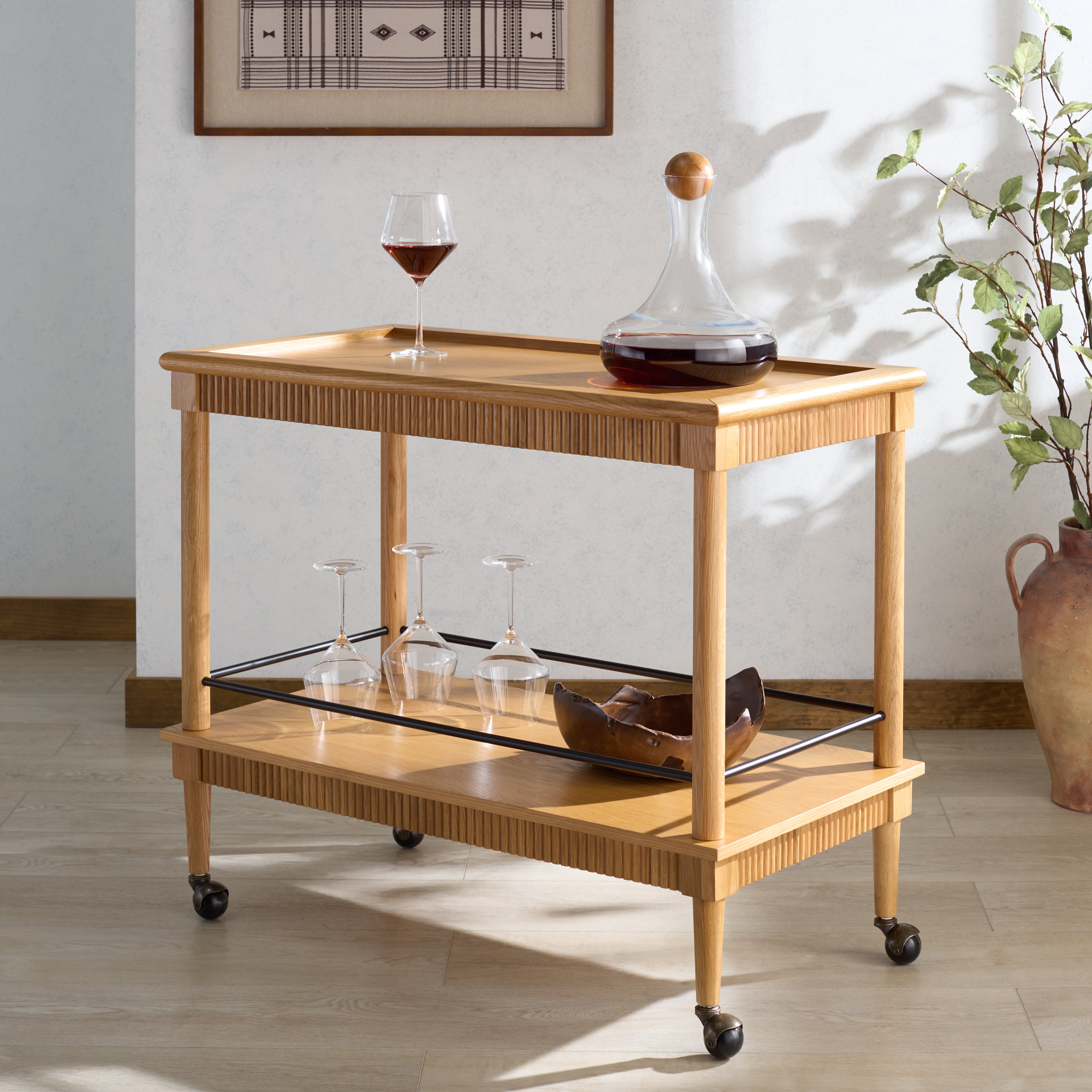 Introducing the elegant Donnabrielle Wood 2 Shelf Barcart in a finish, where functionality meets design. Crafted from a blend of wood and metal, this barcart is as useful as it is stylish. Its hue complements any decor, whether it is a cozy nook or a modern loft. The two spacious shelves provide ample room for your favorite spirits, glassware, and essentials, making entertaining effortless and enjoyable. Its smooth wheels ensure mobility, allowing you to serve your guests with ease. Whether used for a festive gathering or a quiet evening at home, this barcart adds a sophisticated touch to any occasion. The fusion of wood and metal not only brings a warm aesthetic but also offers sturdy support for your collection. Celebrate every moment with a touch of natural charm at your fingertips. Elevate your hosting experience with the Donnabrielle Wood 2 Shelf Barcart, a perfect blend of style and comfort in one stunning piece.