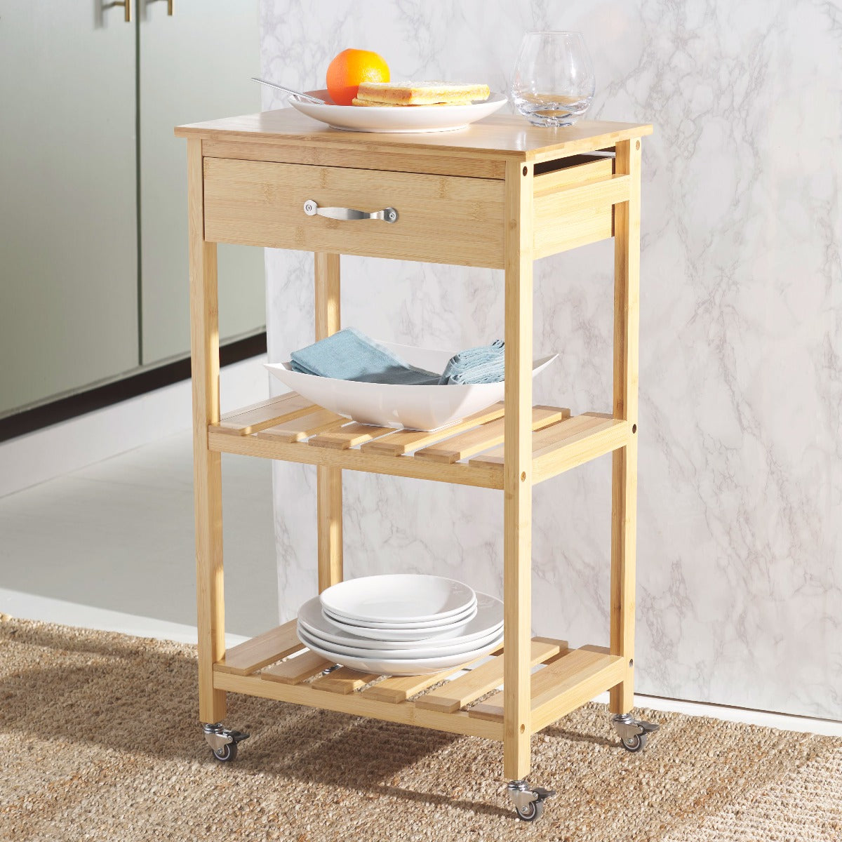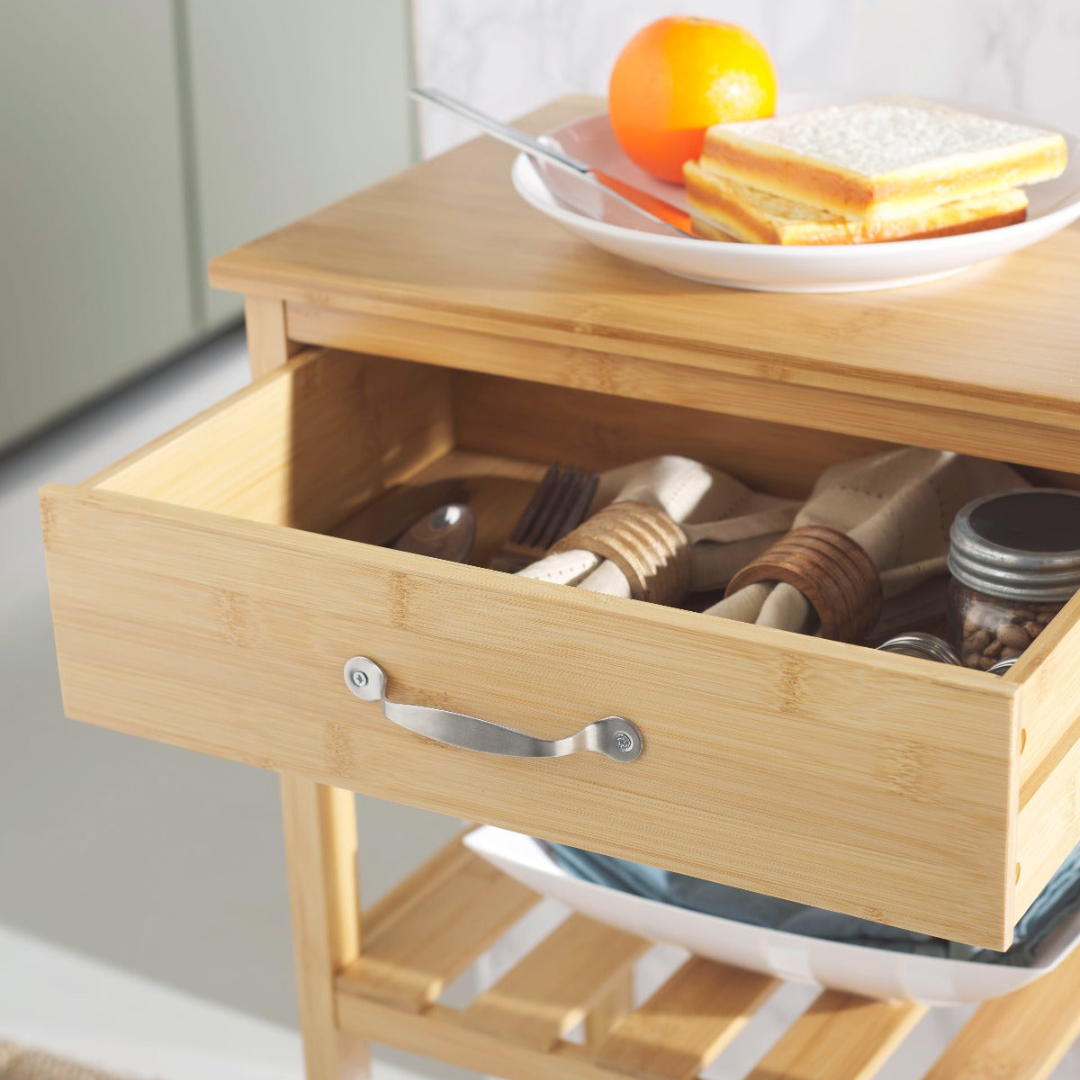 Embrace the most versatile and handiest addition to your home with our Corteau kitchen cart. Crafted in bamboo with an elegant and clean-lined design, our cart features a warm and versatile appeal to complement your kitchen. It features two slatted shelves and a drawer to organize and keep all your kitchen essentials within easy reach. From enjoying breakfast in bed to serving the guest in the living room, our versatile kitchen cart is ready to roll into any room.
