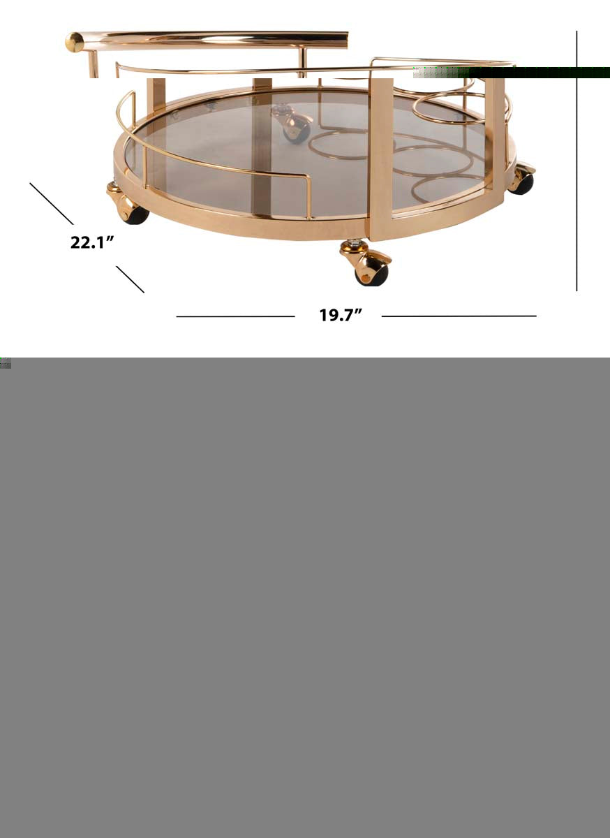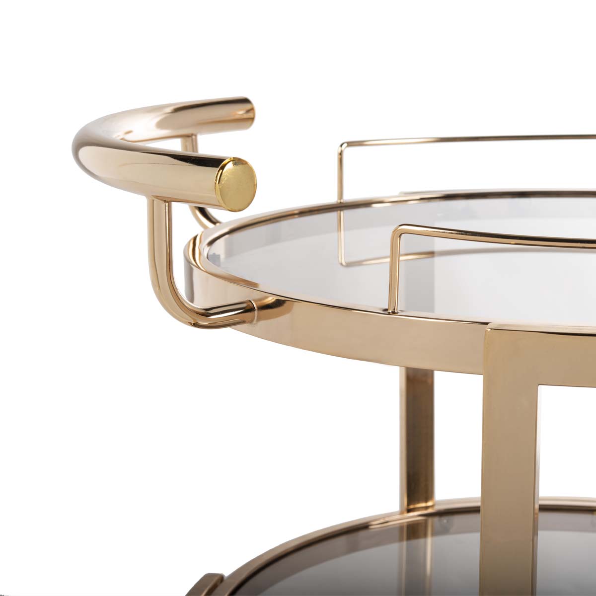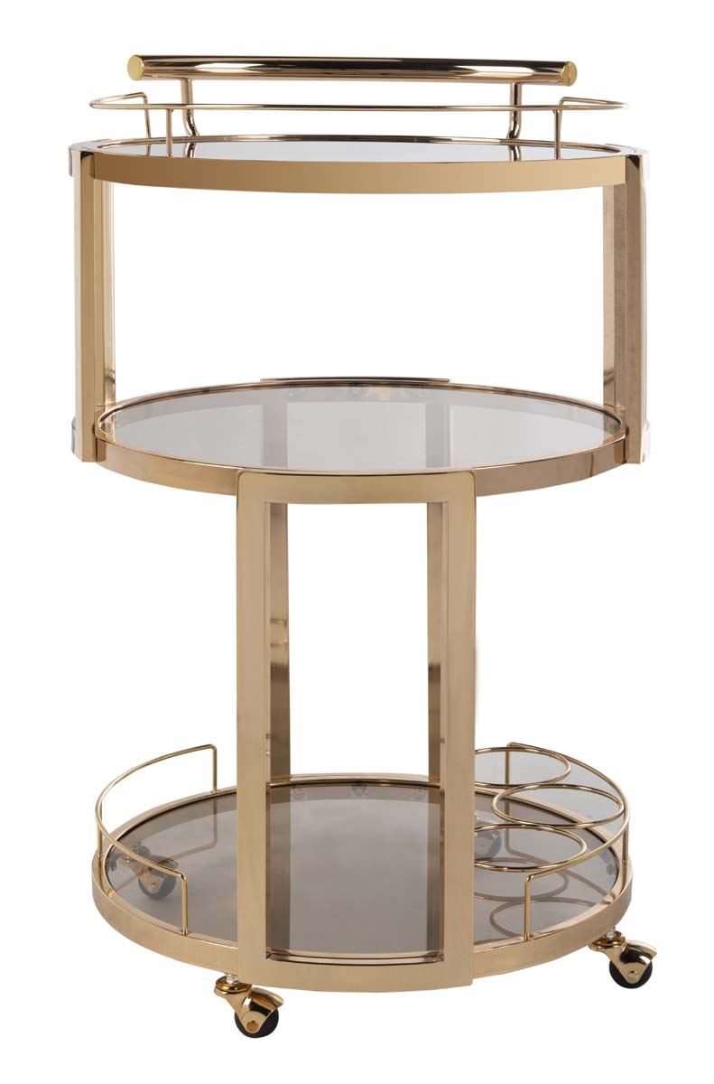 Add instant glamour to any room with this deluxe 3 tier round bar cart and wine rack. Its contemporary design features a shimmering gold finish and tinted glass for depth and drama. Designed for ample storage, it’s the perfect way to start any soiree.