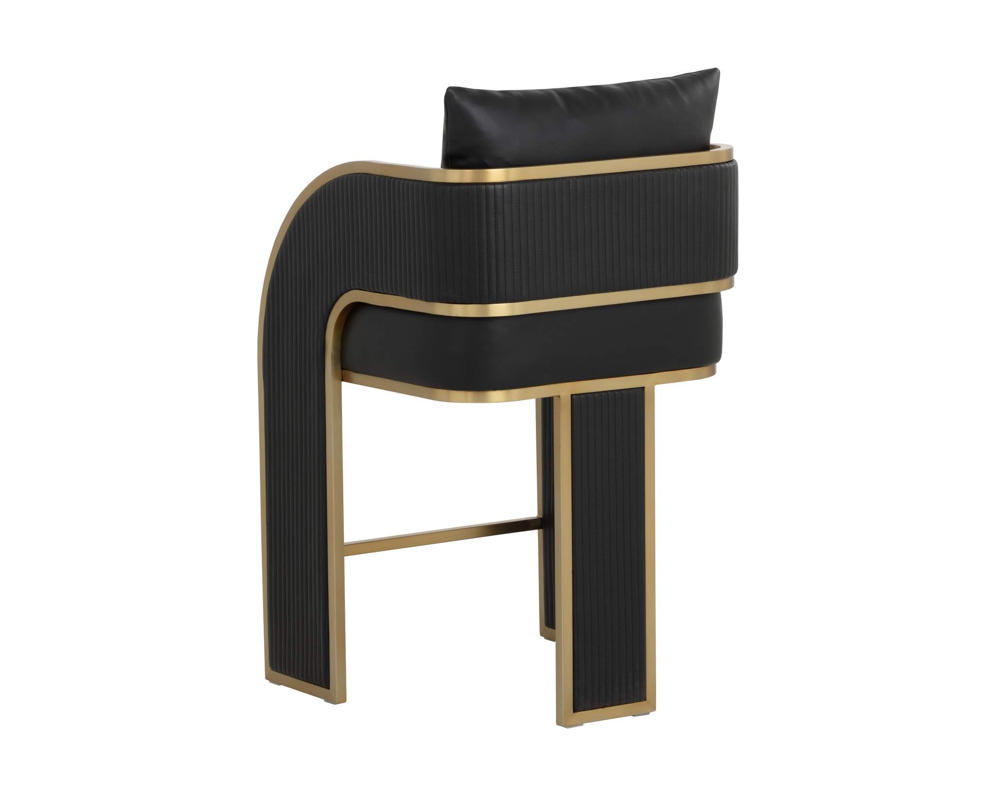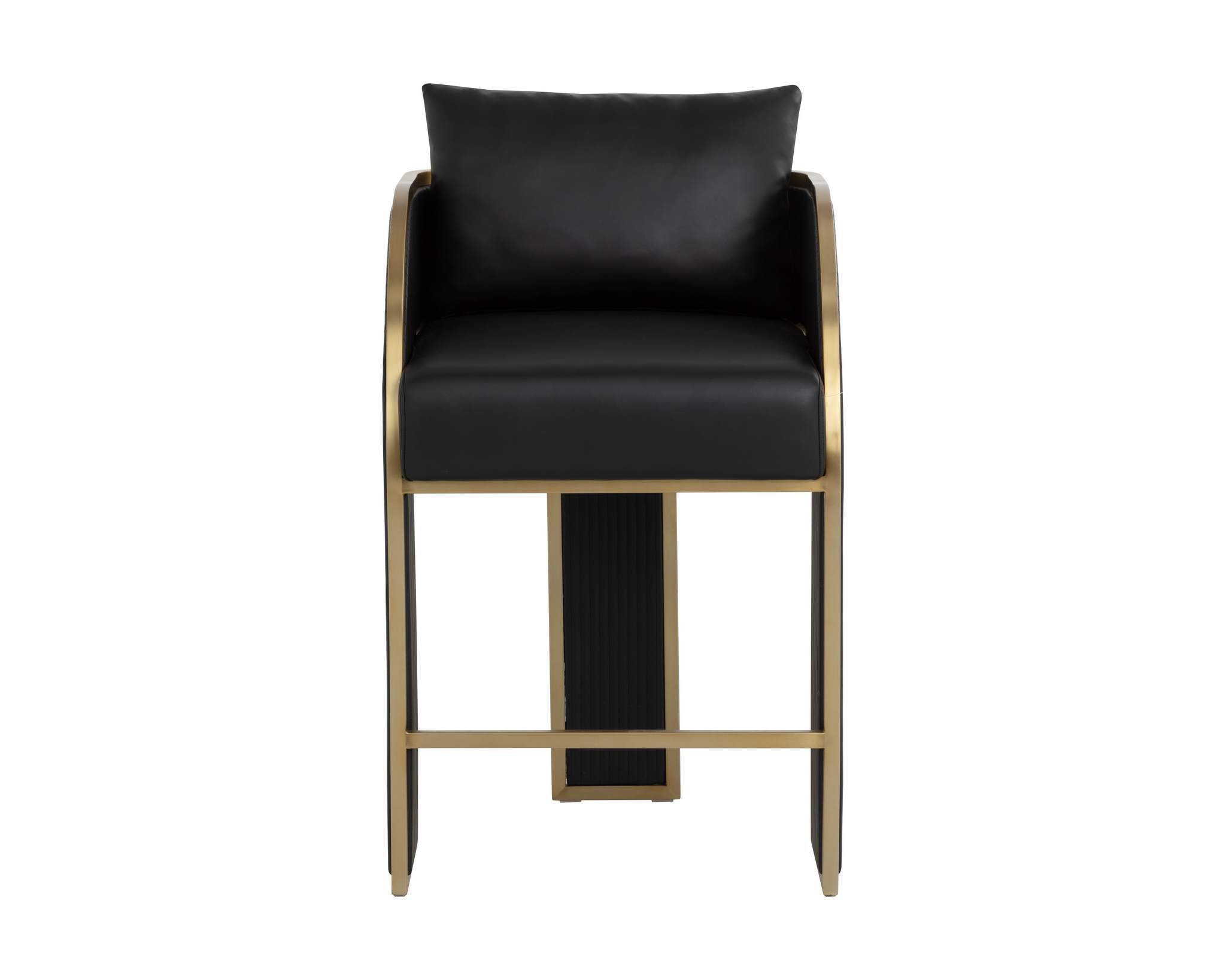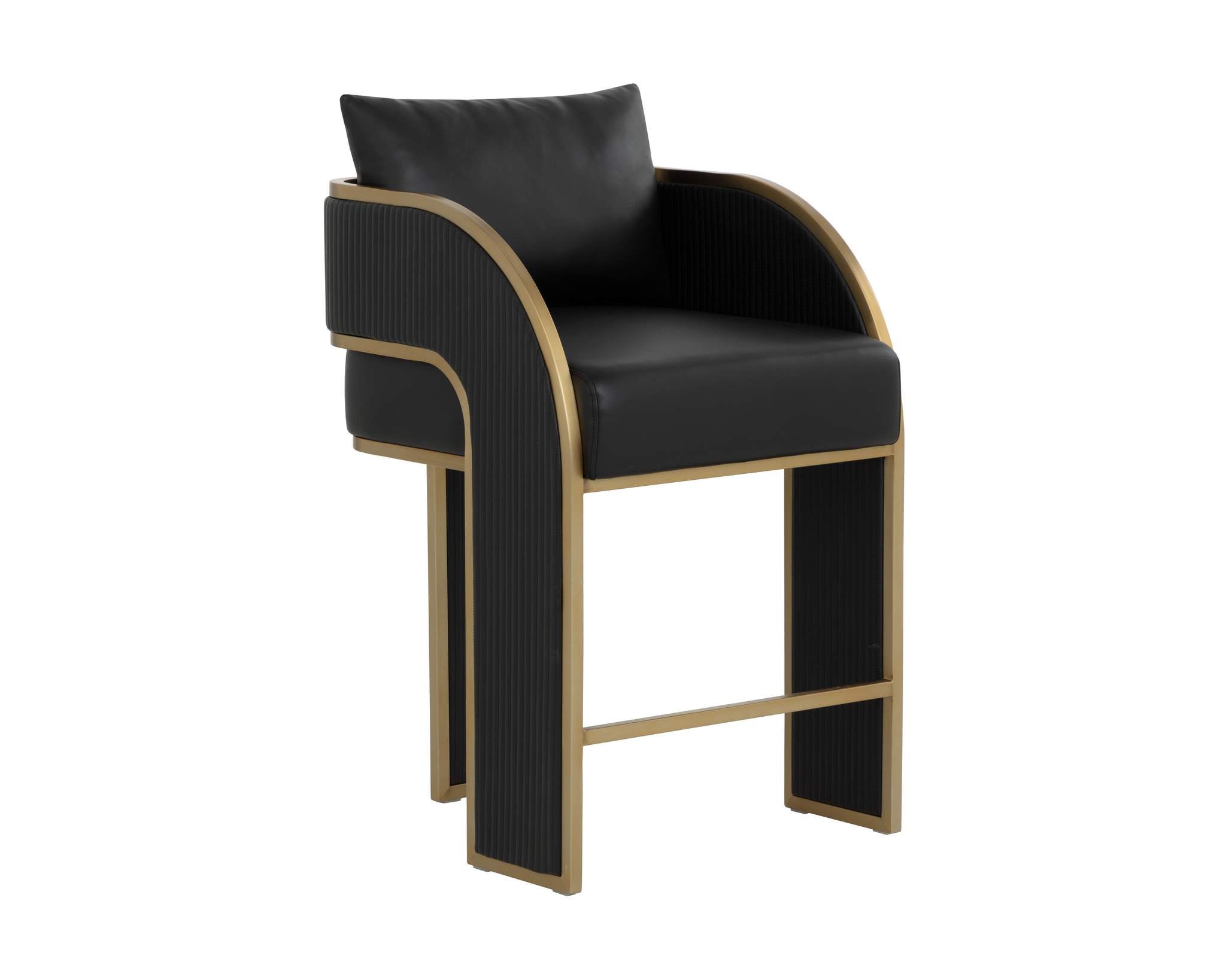 Bold and stylish, the Baz Counter Stool is sure to turn heads. Featuring a daring silhouette upholstered in napa black faux leather. Gold stainless steel detailing and channel stitching add depth and visual impact to the overall look of the piece.
