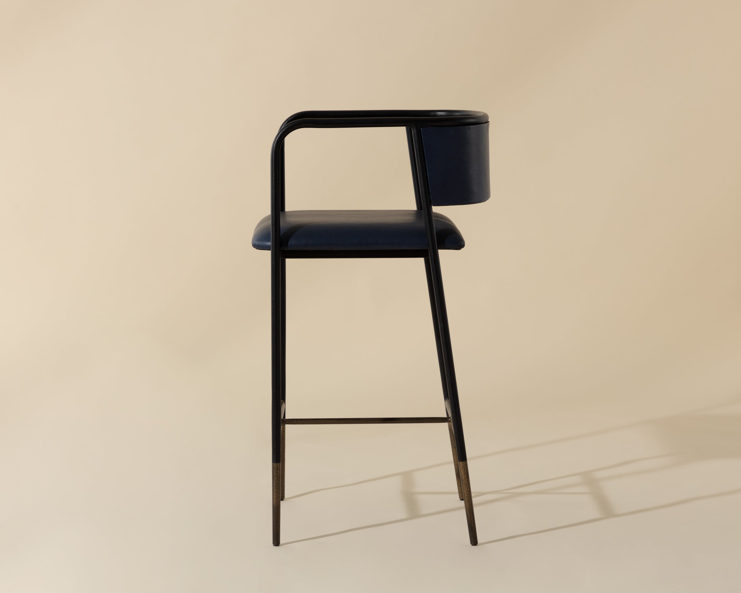 Simplicity is key with this effortlessly elegant counter stool that features a curved backrest. Stocked in bravo admiral and cognac faux leathers, and completed with a black metal frame and legs with antique brass foot caps. Made in India. With refined craftsmanship, this design was brought to life by skilled local artisans. By nature, these materials develop unique imperfections such as fissures, markings and colour variations for a truly one-of-a-kind piece. Handle With Care: This design has been crafted with faux leather. Faux leather is manufactured to reflect the natural characteristics of leather; as such, colour variations, markings, wrinkles, grooves, and light scratches are appreciated characteristics. No two pieces will be alike. Visit our Product Care page for more information on how to ensure the lasting beauty of this piece.