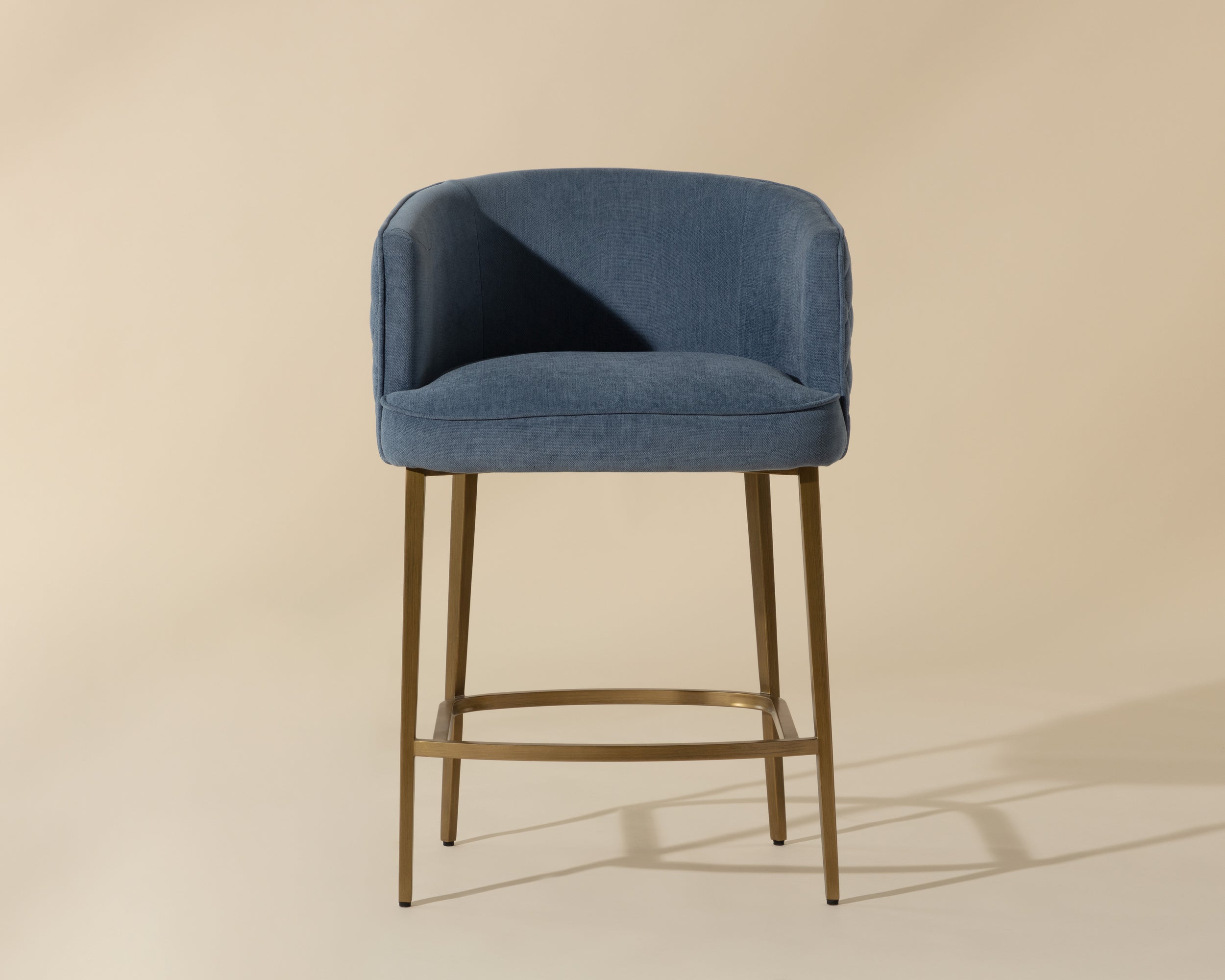 Feminine flair comes to life in this modern counter stool. Stocked in danny iceberg fabric with elegant diamond stitching on the exterior seatback. An antique brass steel frame completes the look.