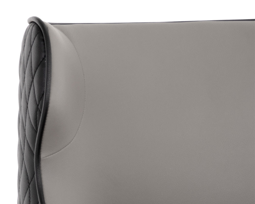 A classic counter stool featuring a substantial seat upholstered in contrasting dillon stratus and black faux leather. Diamond stitching on the seatback adds a hint of elegance while black wood legs and brushed gold foot caps complete the look. Handle With Care: This design has been crafted with faux leather. Faux leather is manufactured to reflect the natural characteristics of leather; as such, colour variations, markings, wrinkles, grooves, and light scratches are appreciated characteristics. No two pieces will be alike. Visit our Product Care page for more information on how to ensure the lasting beauty of this piece.