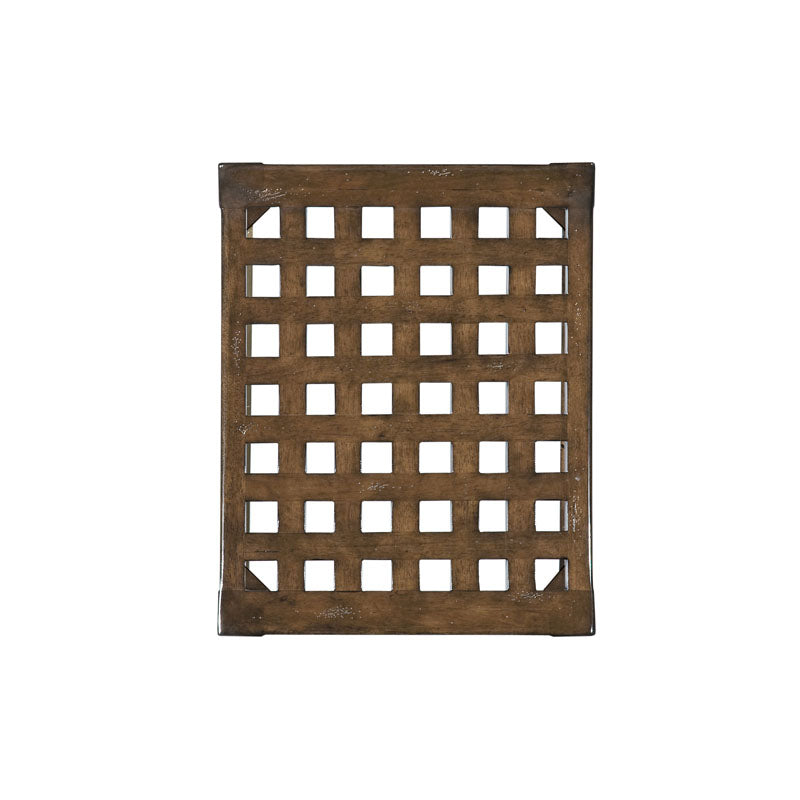 A curved, pierced lattice work seat is raised by splayed, tapering legs that are joined by a box stretcher.
