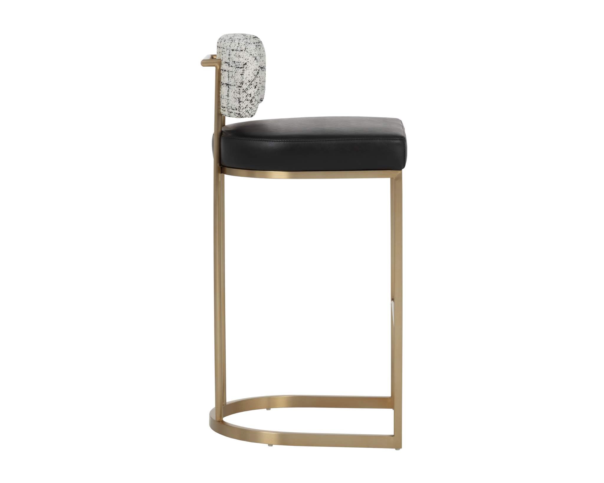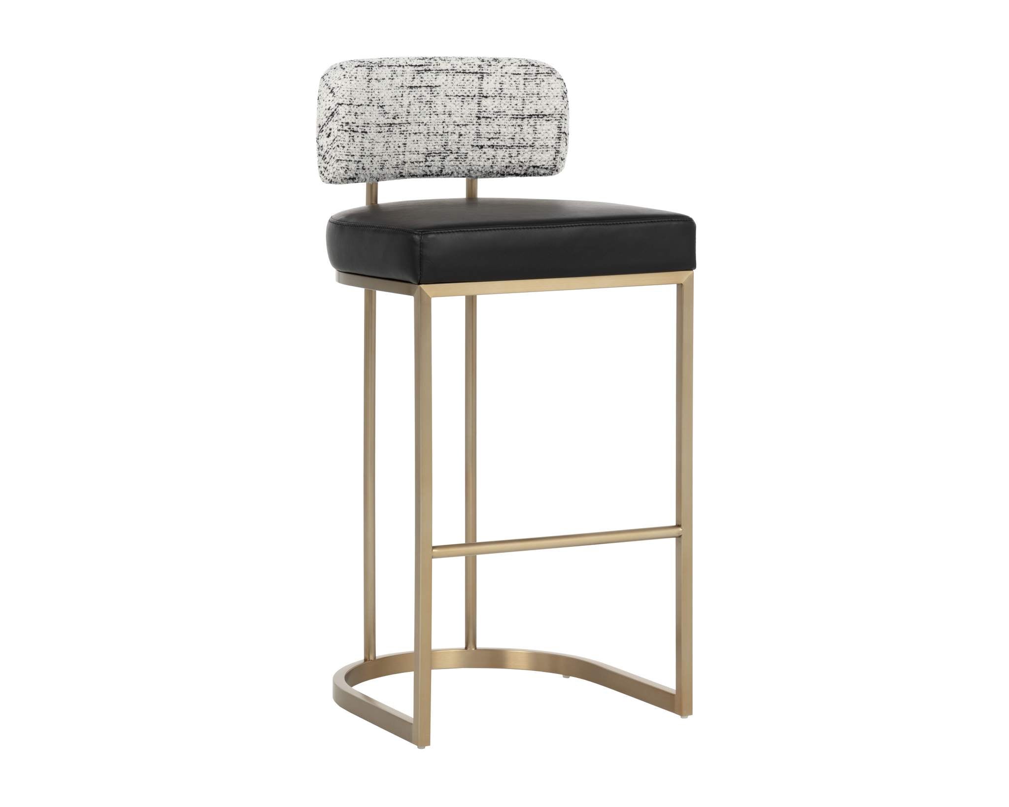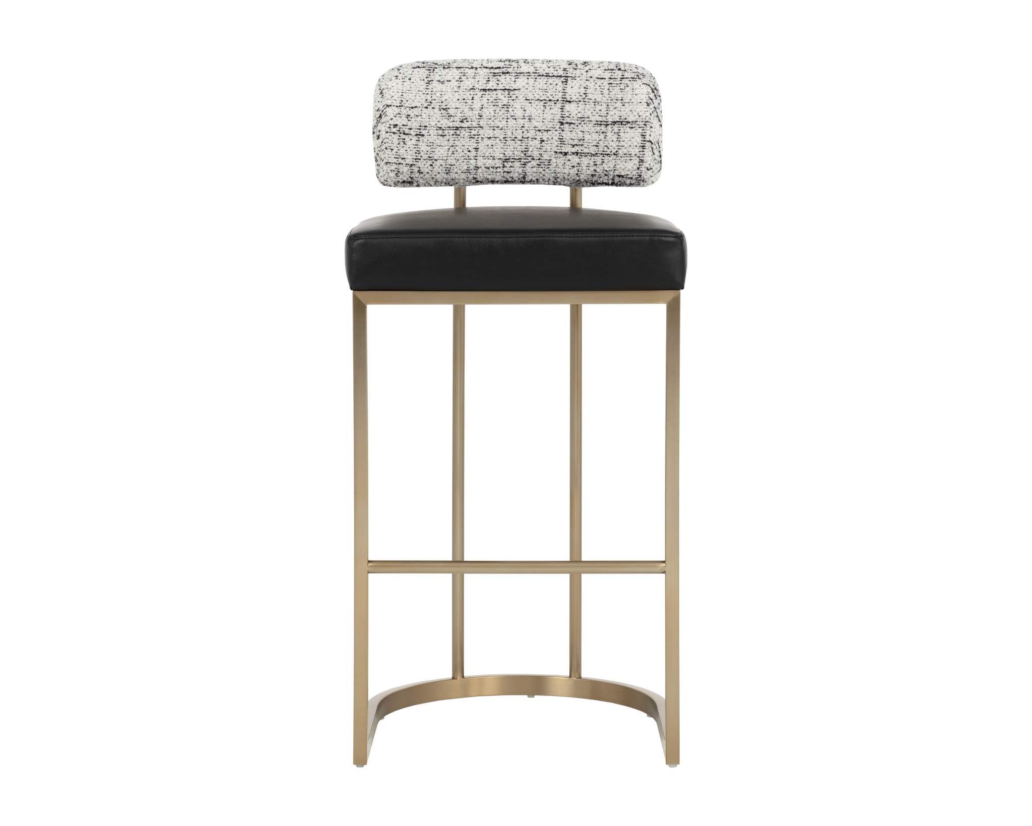The Larissa Barstool brings together a beautiful display of mixed materials. A low seatback upholstered in halton birch fabric contrasts the dark tones of the seat upholstered in bravo black faux leather for an elevated aesthetic. The antique brass stainless steel frame features a handle on the back for a functional and stylish addition.