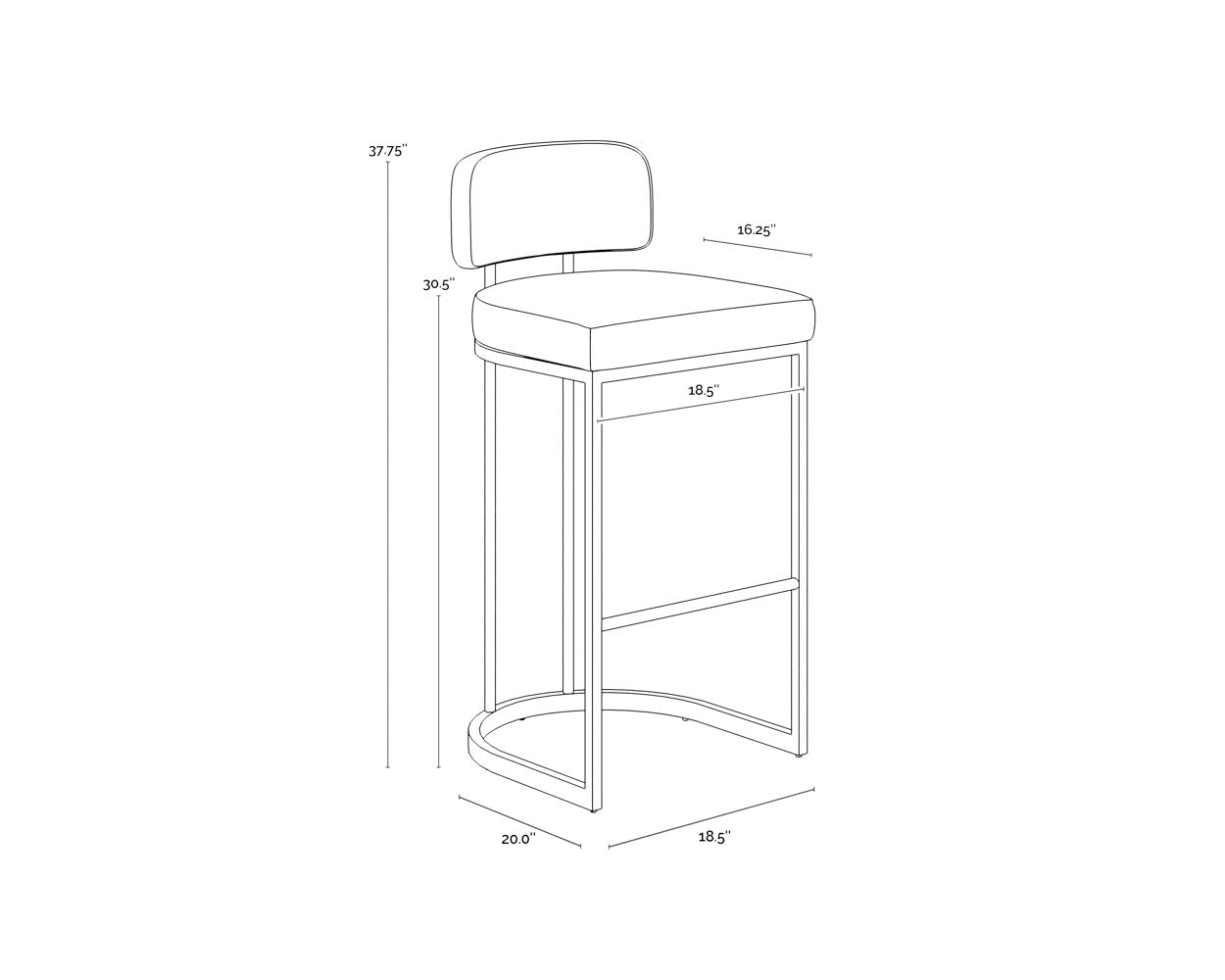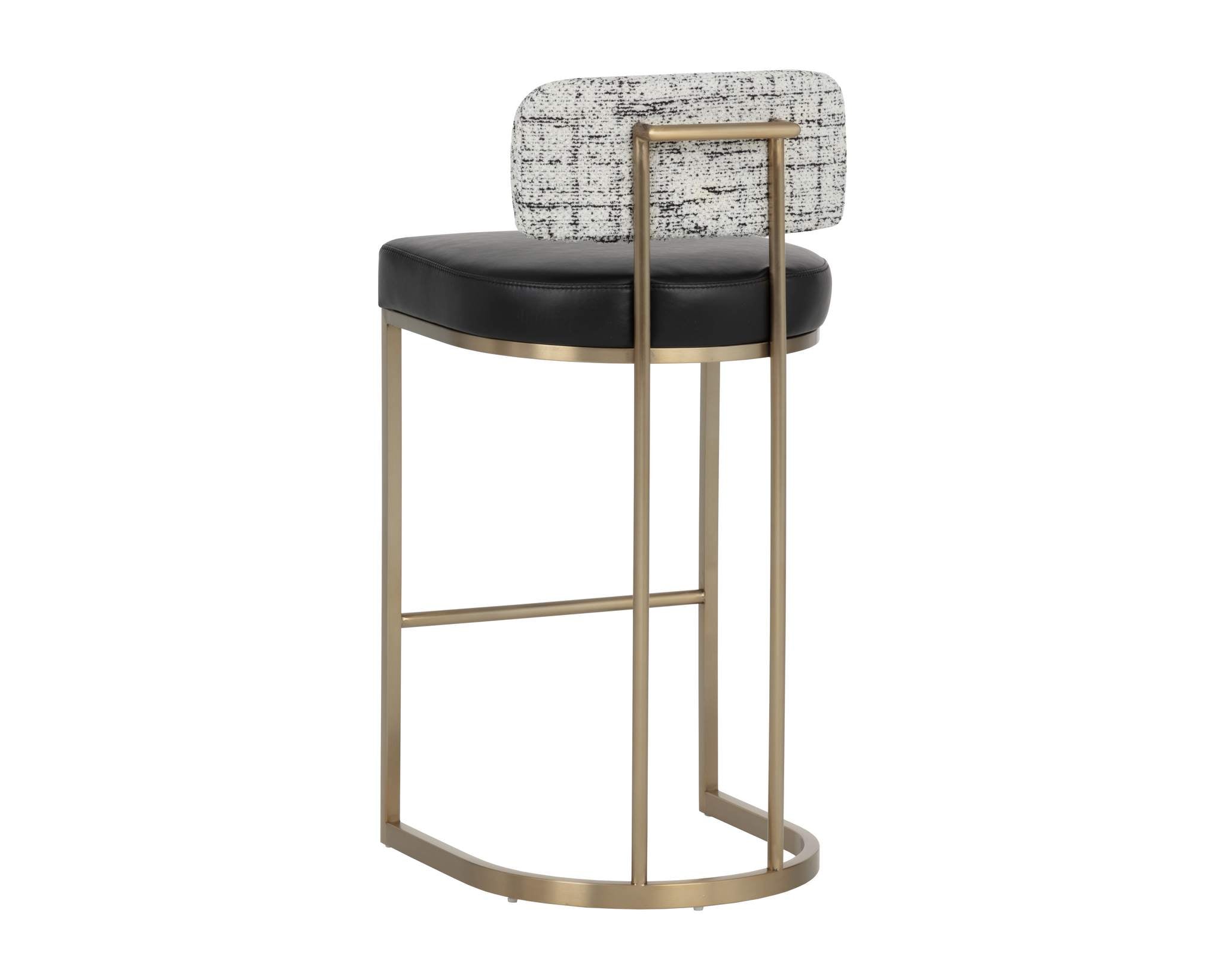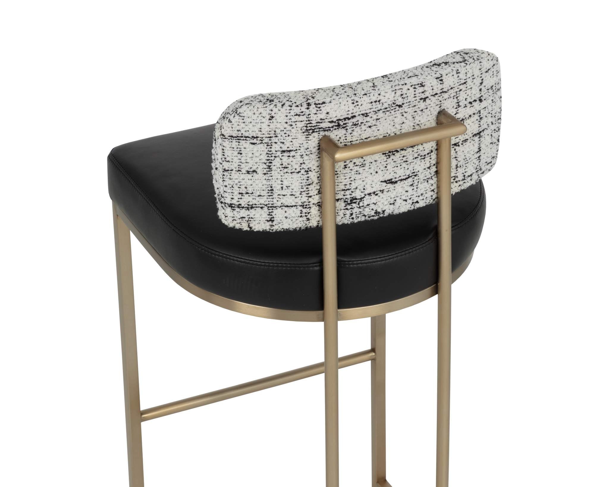 The Larissa Barstool brings together a beautiful display of mixed materials. A low seatback upholstered in halton birch fabric contrasts the dark tones of the seat upholstered in bravo black faux leather for an elevated aesthetic. The antique brass stainless steel frame features a handle on the back for a functional and stylish addition.