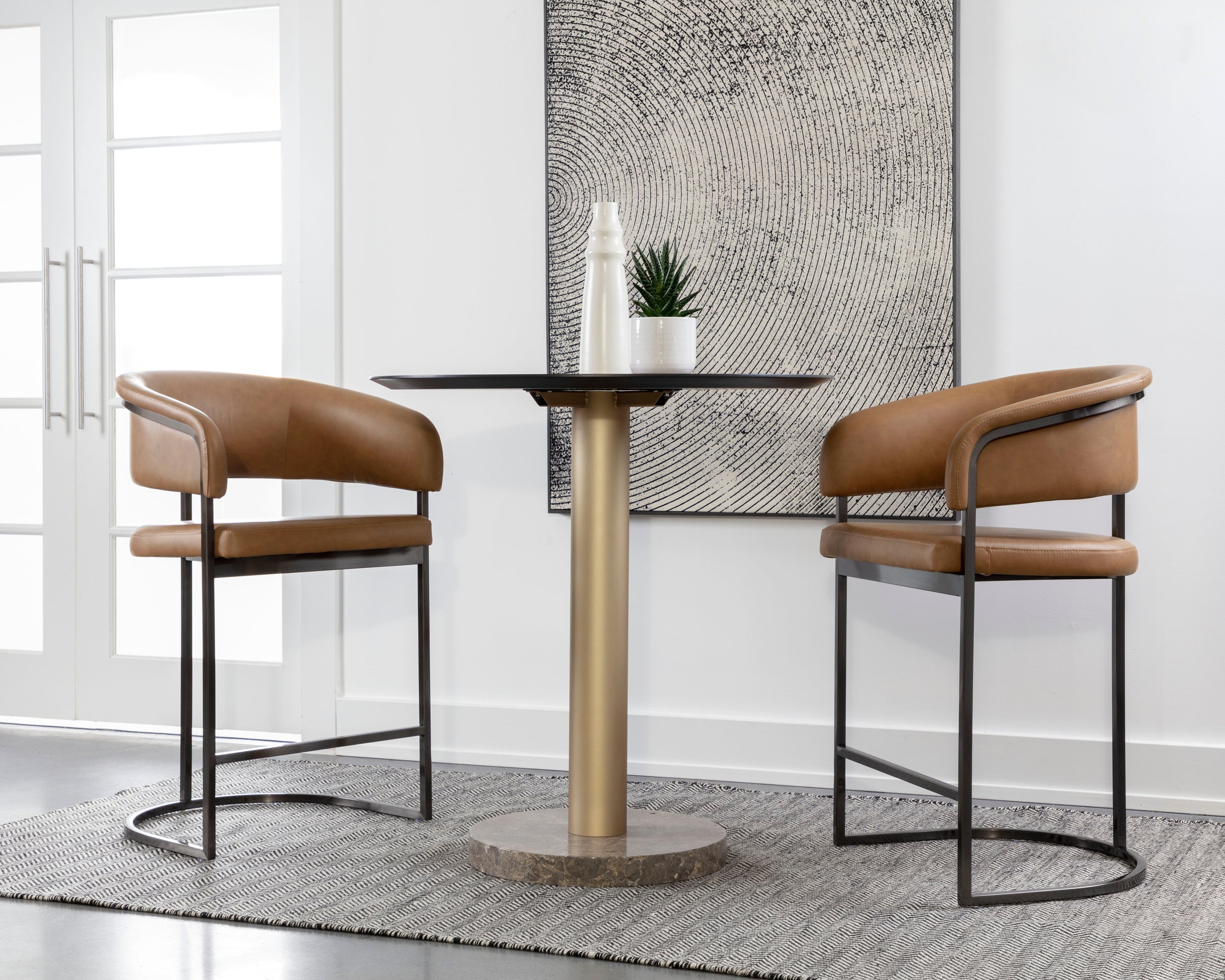 Uniting the beauty of sleek modern design with timeless elegance, the Marris Counter Stool is a great addition to any dining space. Stocked in smooth milliken cognac faux leather and completed with a cantilever frame in a gunmetal stainless steel finish. Handle With Care: This design has been crafted with faux leather. Faux leather is manufactured to reflect the natural characteristics of leather; as such, colour variations, markings, wrinkles, grooves, and light scratches are appreciated characteristics. No two pieces will be alike. Visit our Product Care page for more information on how to ensure the lasting beauty of this piece.