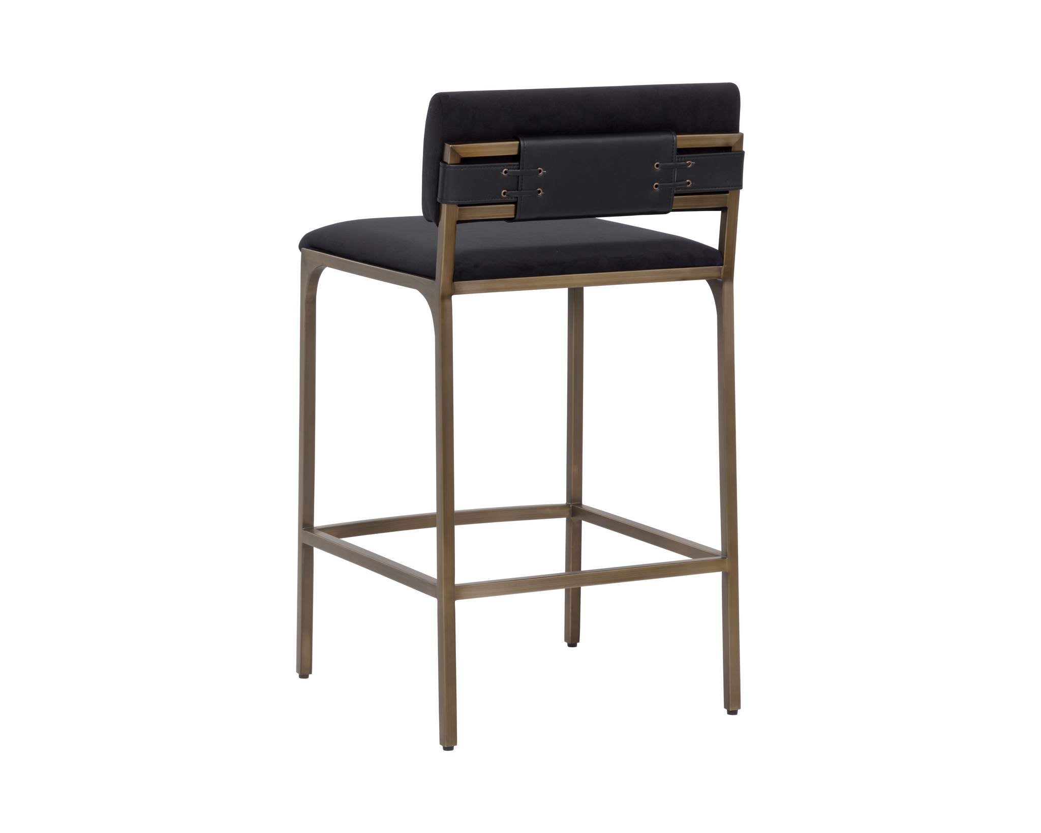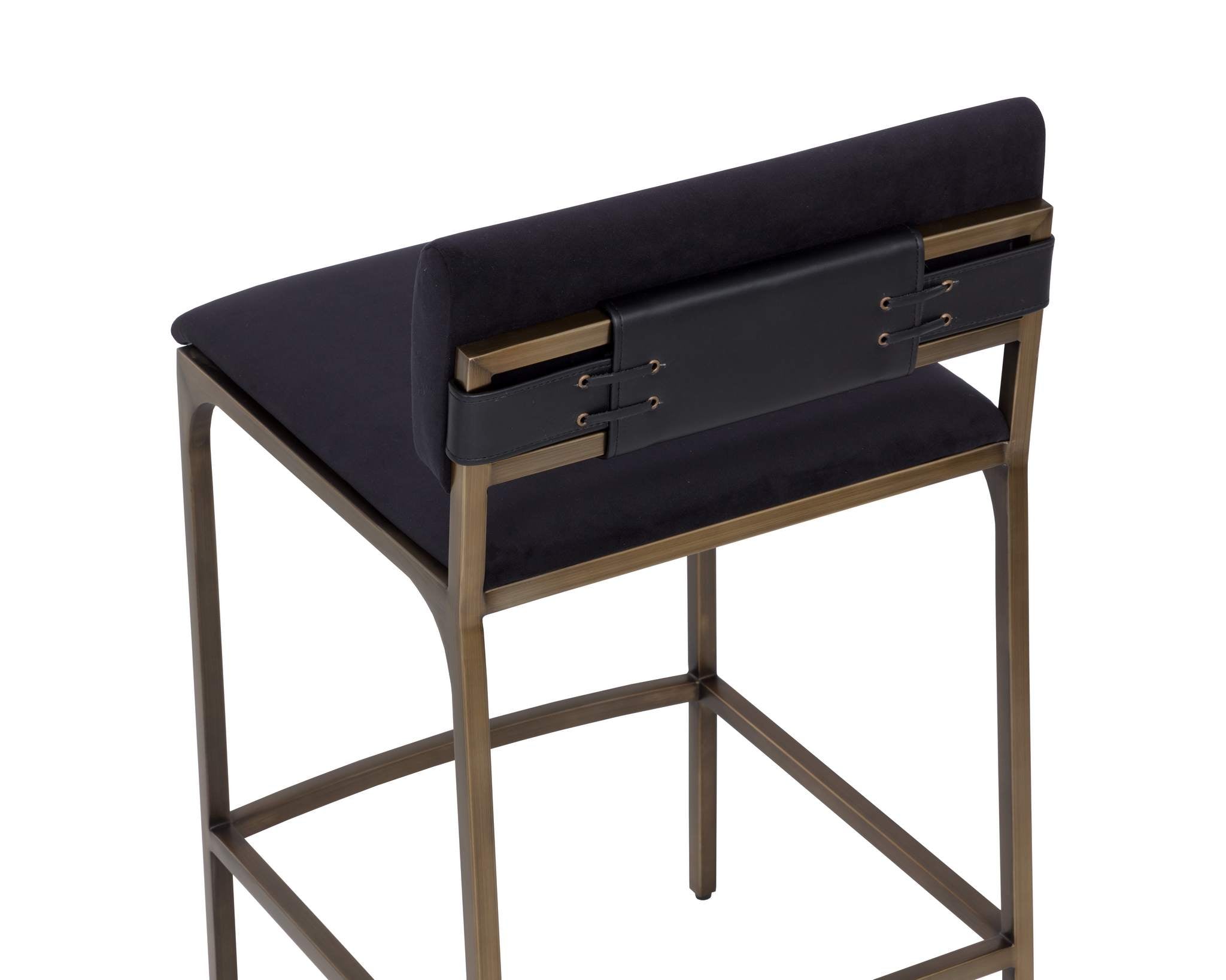 The untold beauty of the Mori Barstool lies in its unassuming details. The subtly extended seat and foam-padded backrest are upholstered in smooth abbington black fabric for enduring comfort. At the back, the gold powder-coated steel frame is elegantly wrapped in nappa black faux leather, accented with eyelets and rope detailing for a sophisticated touch.