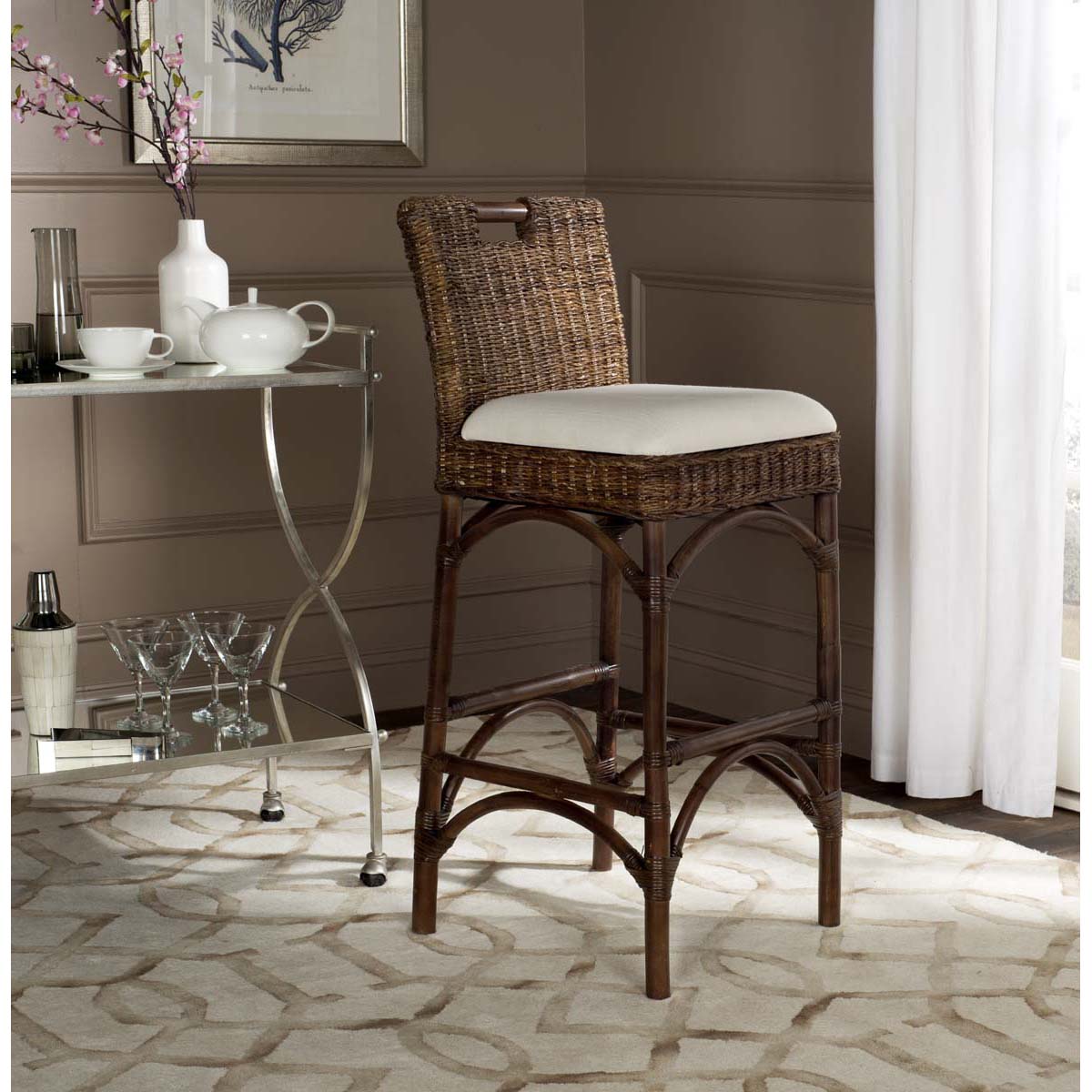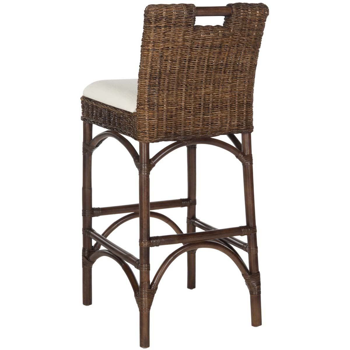 A transitional twist on Thonet styling, the dark brown rattan Freemont bar stool marries a contemporary seat back and a base with the bentwood curves of European bistro chairs. A comfy white poly cotton cushion invites lingering conversation in the kitchen.
