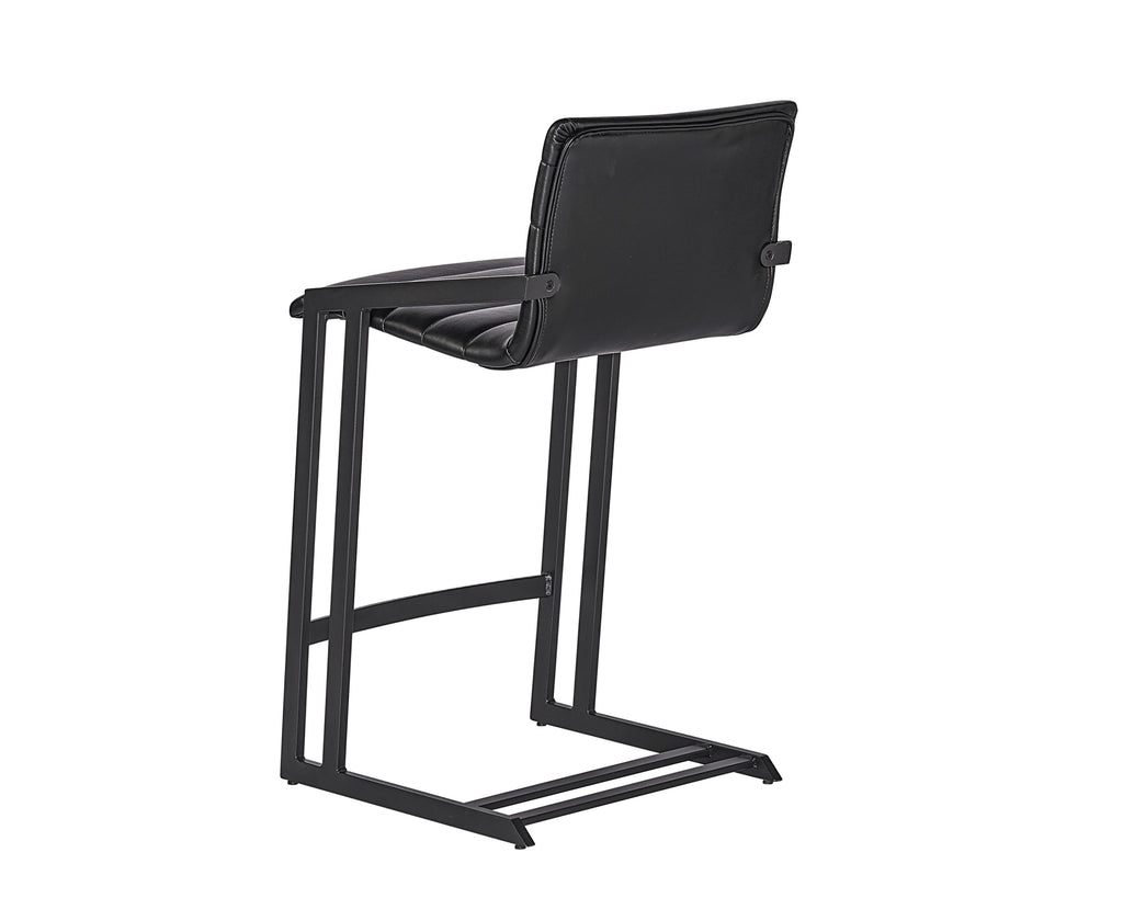 An industrial chic counter stool. Features horizontal channel tufting on the seatback with an exposed black steel frame. Stocked in cantina black bonded leather. Suitable for various dining, kitchen and bar spaces of all sizes. Handle with Care: This design has been crafted with bonded leather. Bonded leather is a blend of reconstituted leather and synthetic materials crafted to reflect the natural characteristics of leather; as such, colour variations, markings, wrinkles, grooves and light scratches are acceptable and appreciated characteristics. No two pieces are alike. Visit our Product Care page for more information on how to ensure the lasting beauty of this piece.