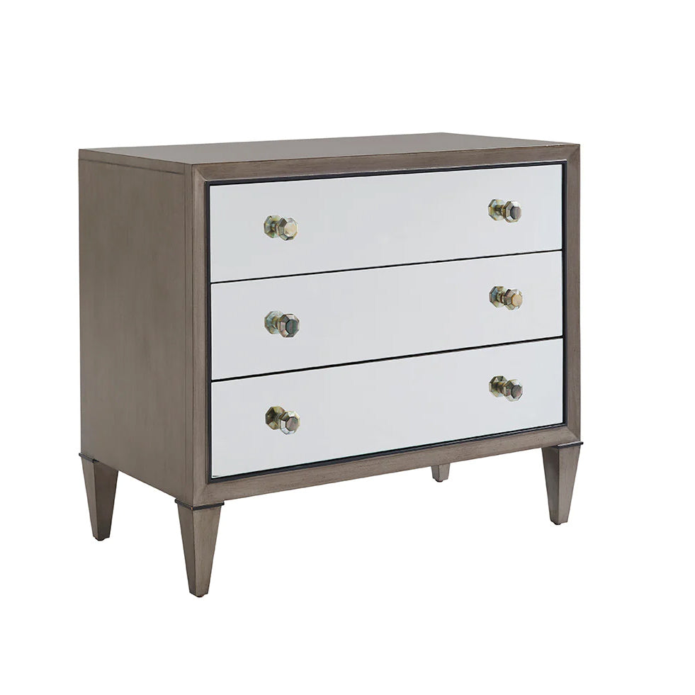 Bedside storage presents a touch of glam with mirrored drawer fronts and distinctive octagonal pulls made from abalone shell. The three full-extension self-closing drawers with silver gray painted interiors provide ample storage and a smooth surface. This case is the same as the Paloma nightstand, just dressed up for added interest. Ariana offers a high-fashion take on modern luxe living, blending a hand-glazed platinum finish with sophisticated accents like burnished silver leaf, platinum-finished stainless steel, elegant silver gray drawer interiors and polished silver marble with veining in shades of taupe and gray. Designs feature classic lines, with elements like raised panel doors, tapered legs and hand striping. Custom upholstery styles showcase fresh color palettes and tailoring details like decorative tapes and beaded fringe. The result is a lifestyle aesthetic that celebrates a chic, sophisticated interpretation of today's contemporary design. 3 full-extension self-closing drawers with mirrored drawer fronts.