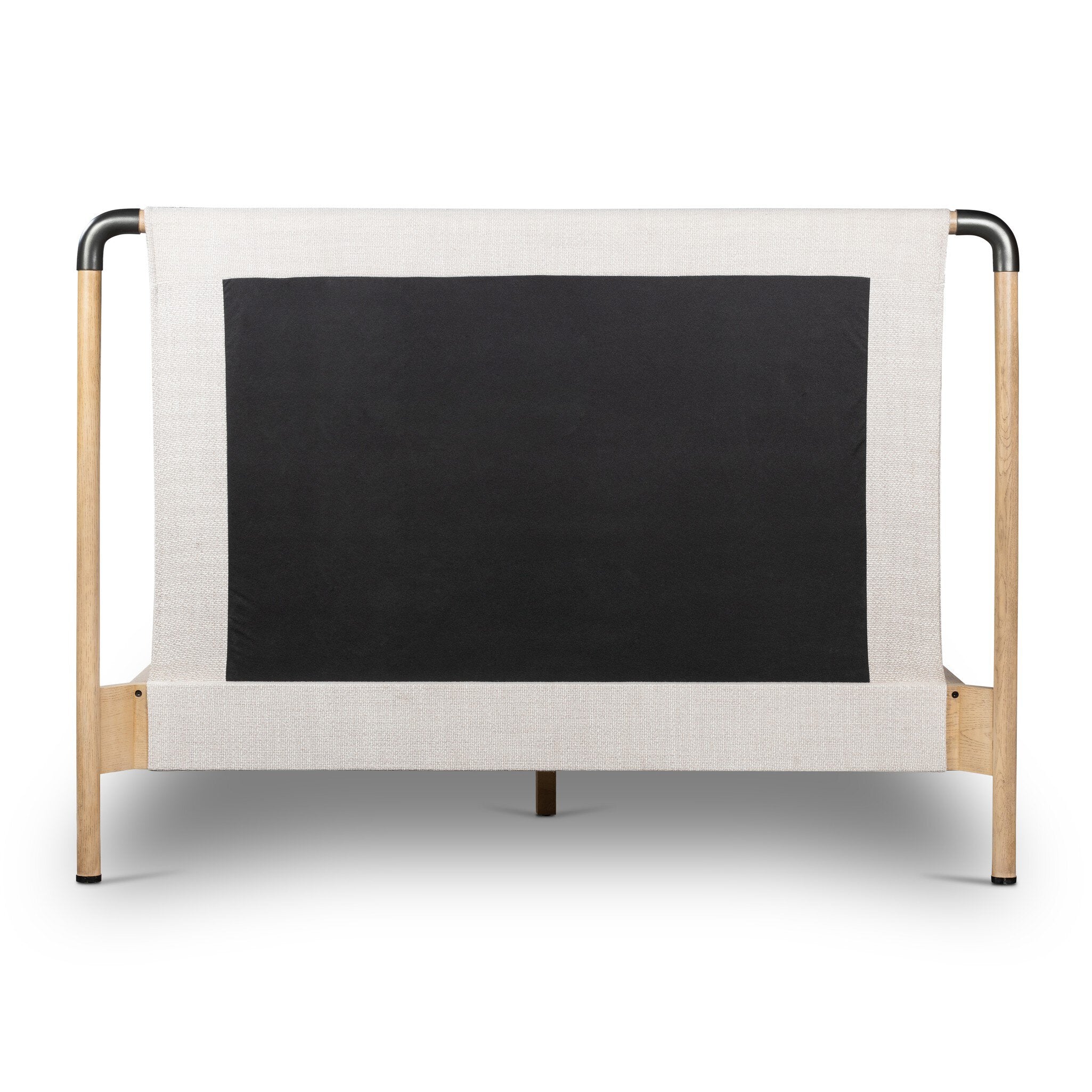 Mixed materials make the bed. Framed by solid oak with rounded iron corners, an upholstered, sling-style headboard brings a light, modern vibe to the bedroom. Performance fabrics are specially created to withstand spills, stains, high traffic and wear, ensuring long-term comfort and unmatched durability.