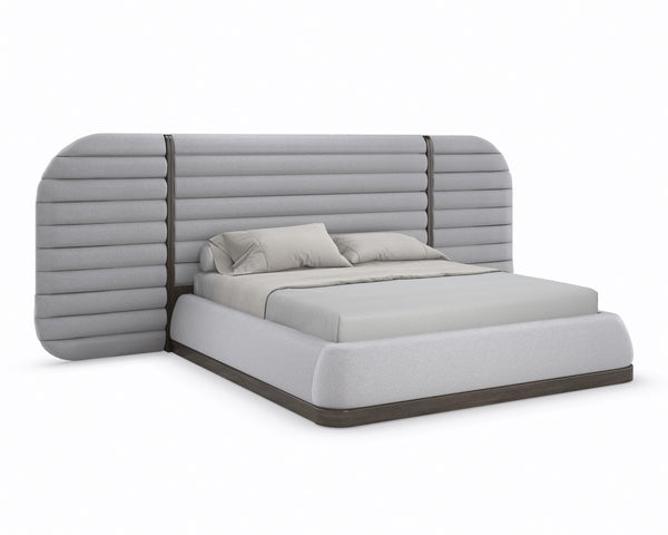 Architectural by design, yet soft around the edges, this channel-tufted bed makes a dramatic impact in a pebble gray billiard cloth fabric. Clean lines are accentuated by Sepia trim, warmly framing the headboard and surrounding platform base. A rounded ledge at the foot of the bed is perfect for sitting when slipping off your shoes and getting dressed. For added drama, fully upholstered wing panels let you extend the headboard on either side. Sold as a set, right and left wing panels are available to purchase separately.
