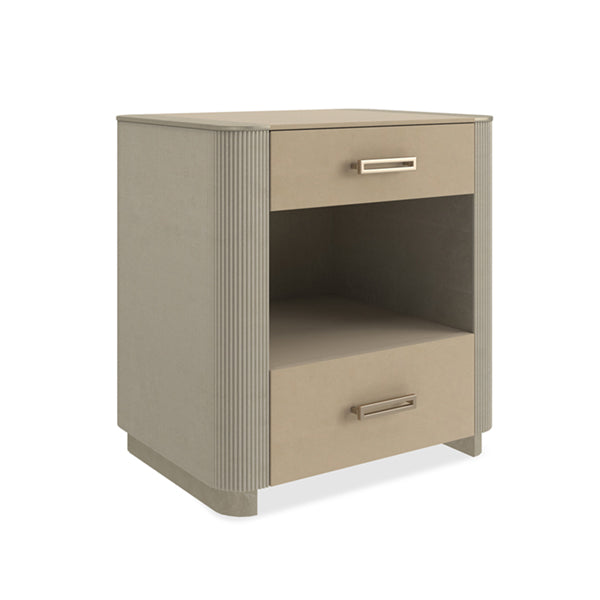 Cap the sides of your favorite bed with elegant nightstands that are just as dreamy. This 25-inch version boasts a fashion-forward design with a softly rounded profile accentuated by hand-applied Oracle leaf, exquisite fluted sides and vinyl wrapped drawer fronts. Lustrous from every angle, it features a sophisticated palette of finishes. Ring-pull hardware with the look of jewelry in Whisper of Gold adorn both the top and bottom drawers.
