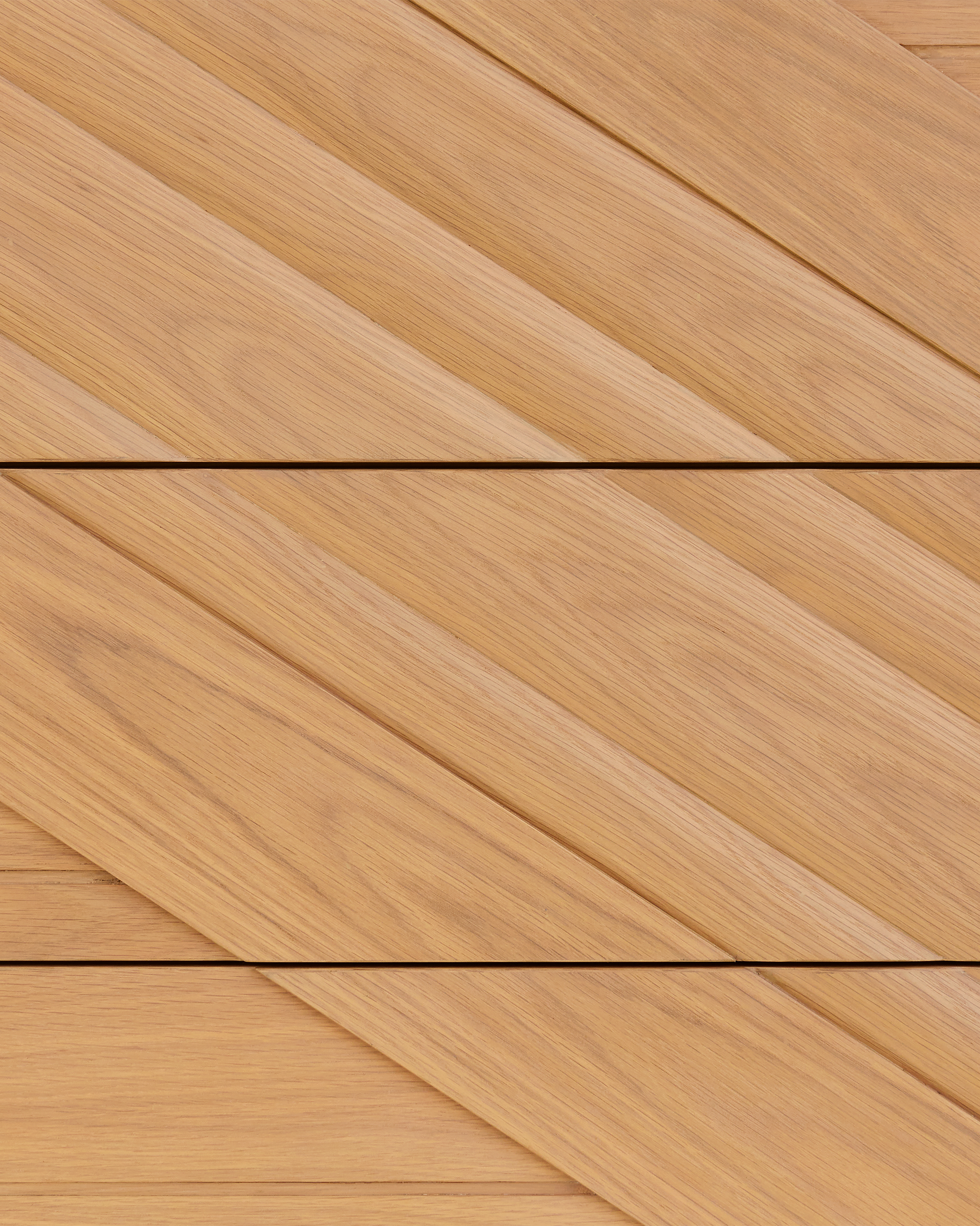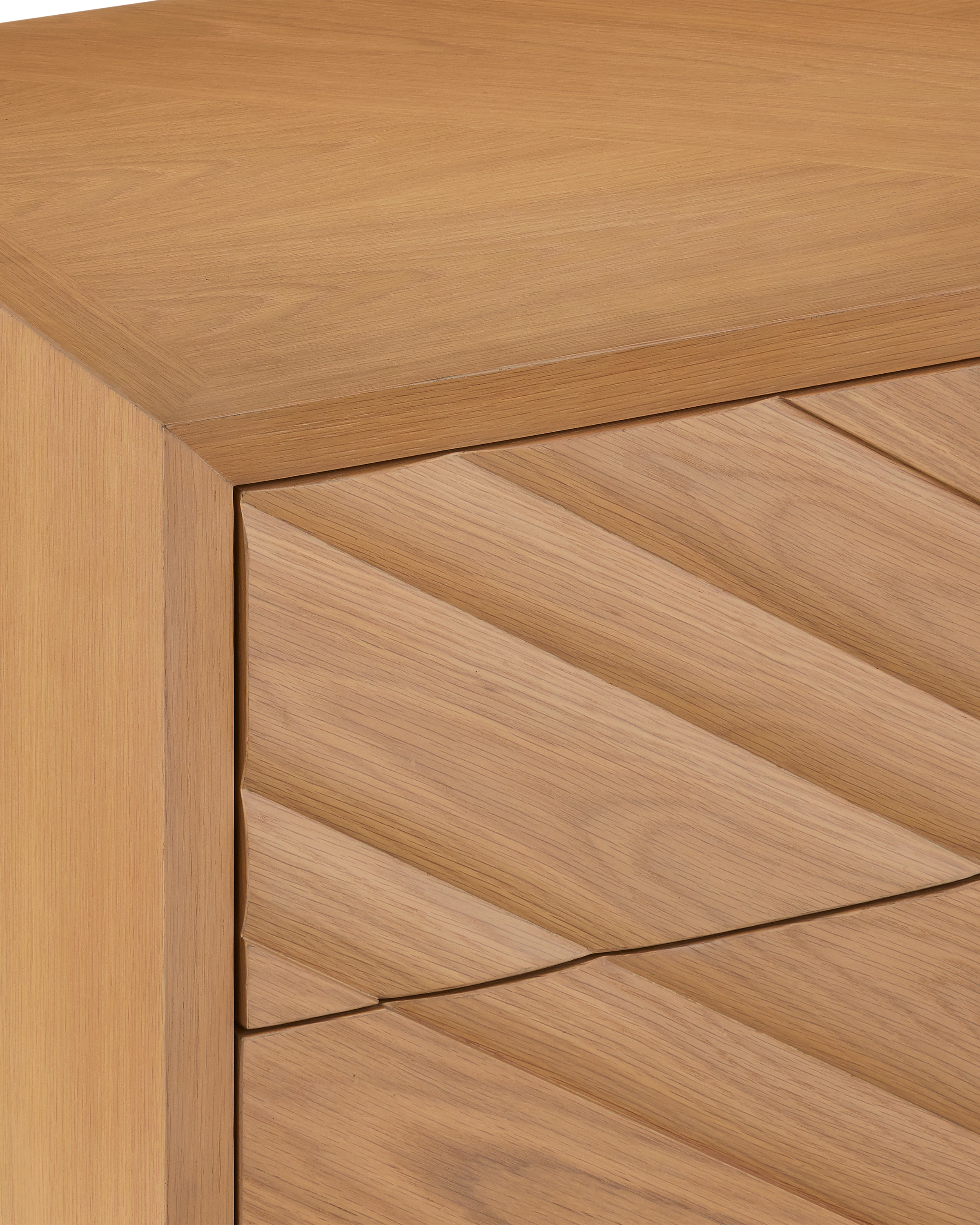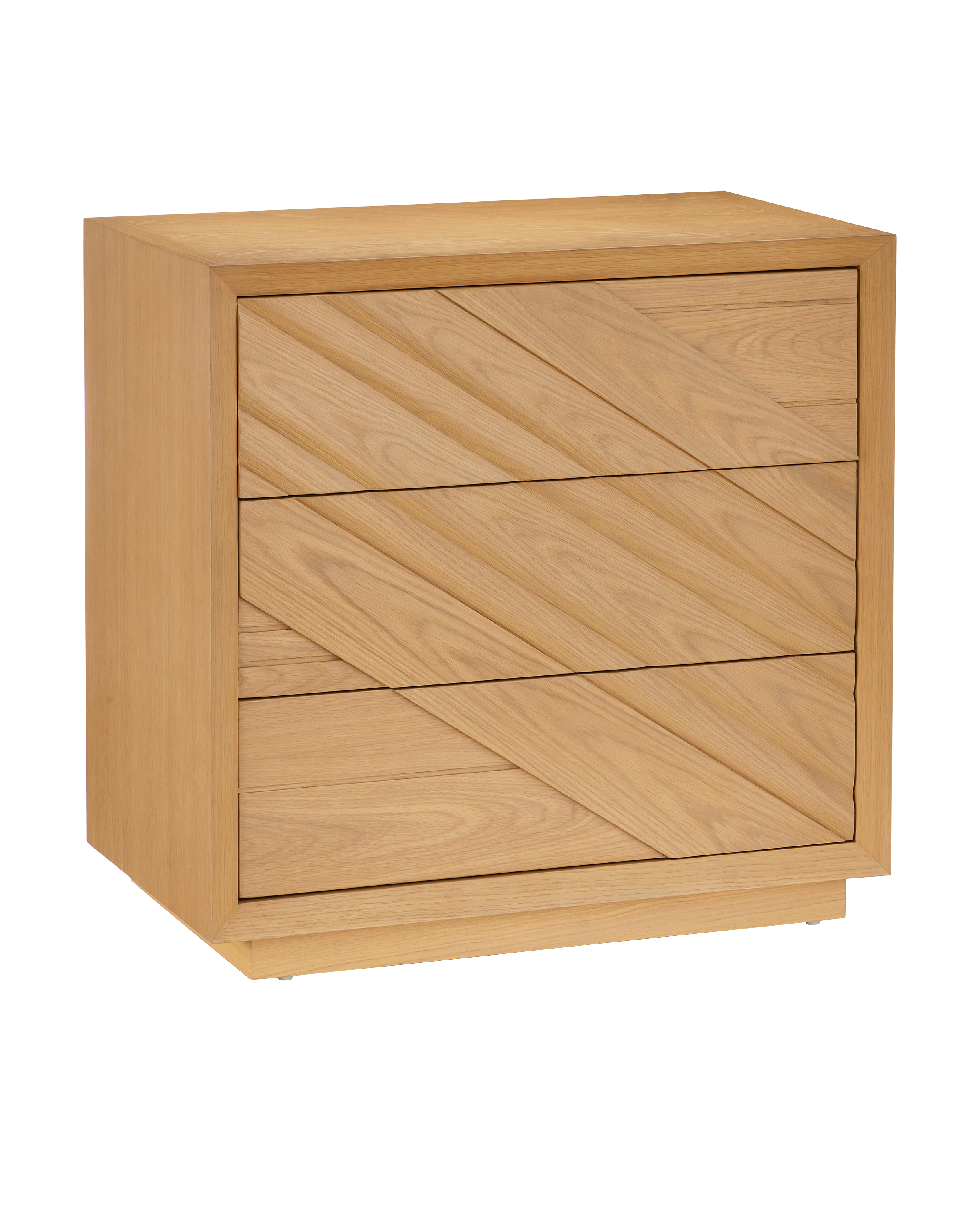 Made of white-oak solids and veneers in a light oak finish, the Margot Natural Oak Chest was inspired by the casual styleof California’s coastal communities. A number of outstanding features include a full chamfered profile edge on the face frame, and a multi-dimensional angled pattern on the drawers created with white oak crown veneers. There are generous-sized drawers with beige velvet liners, and the drawers are push to open and close.