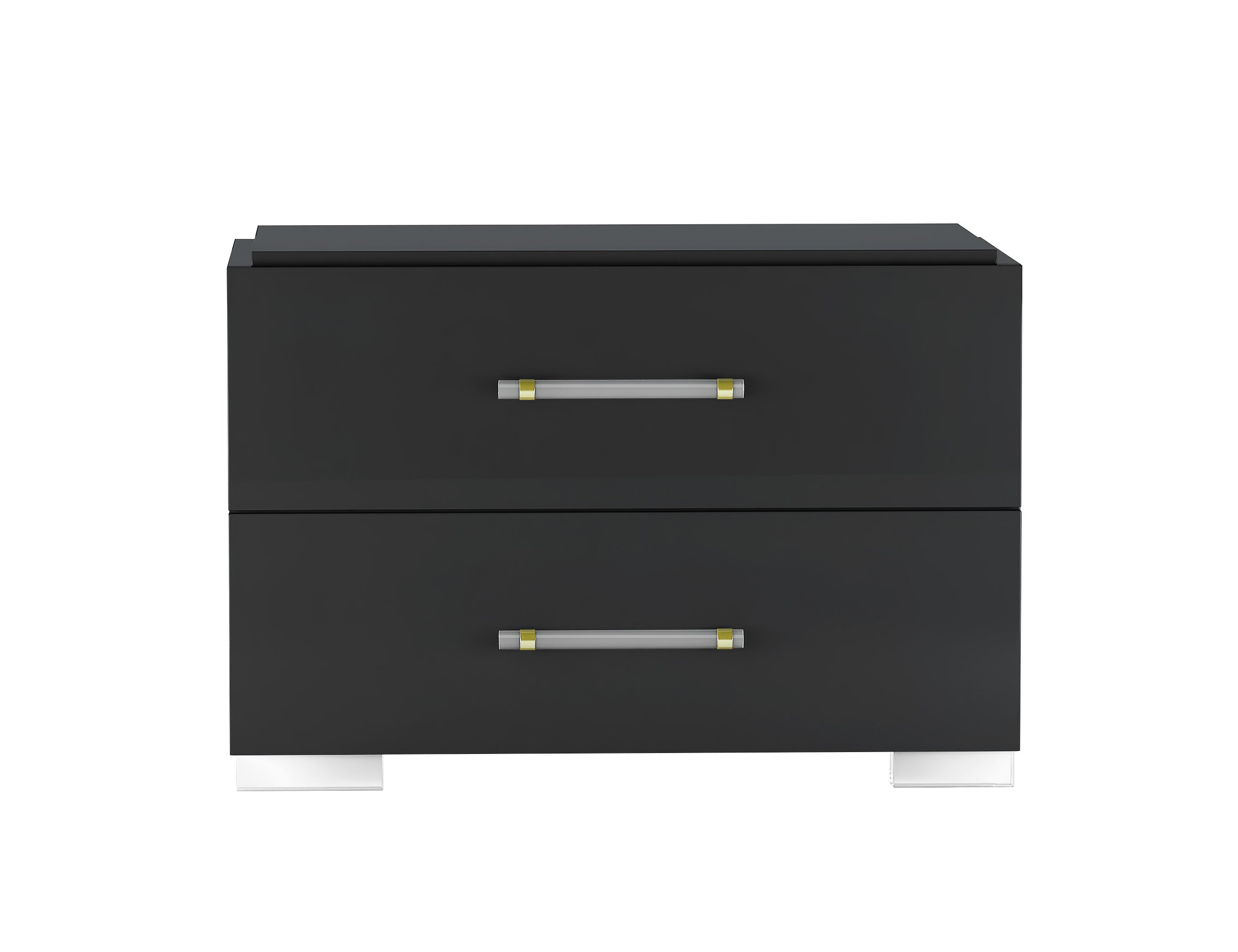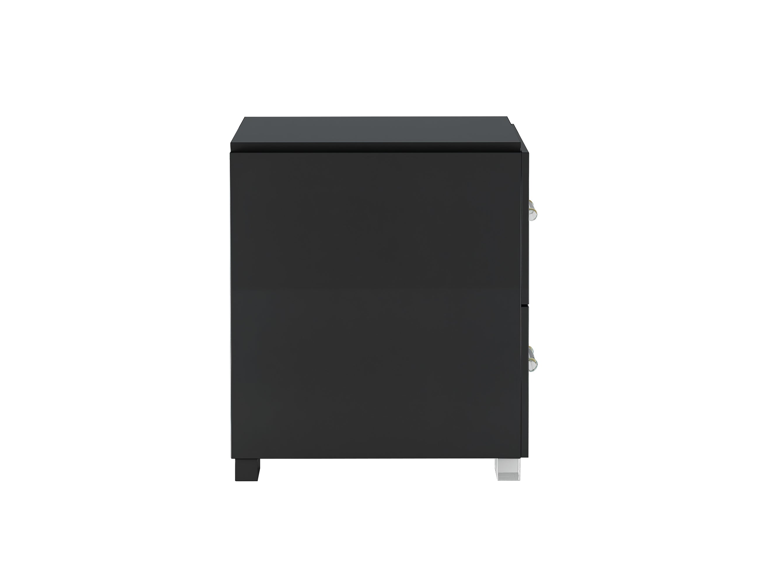This high gloss black nightstand features 2 drawers that fully extend on smooth glides. Acrylic drawer handles and feet with metal accent.