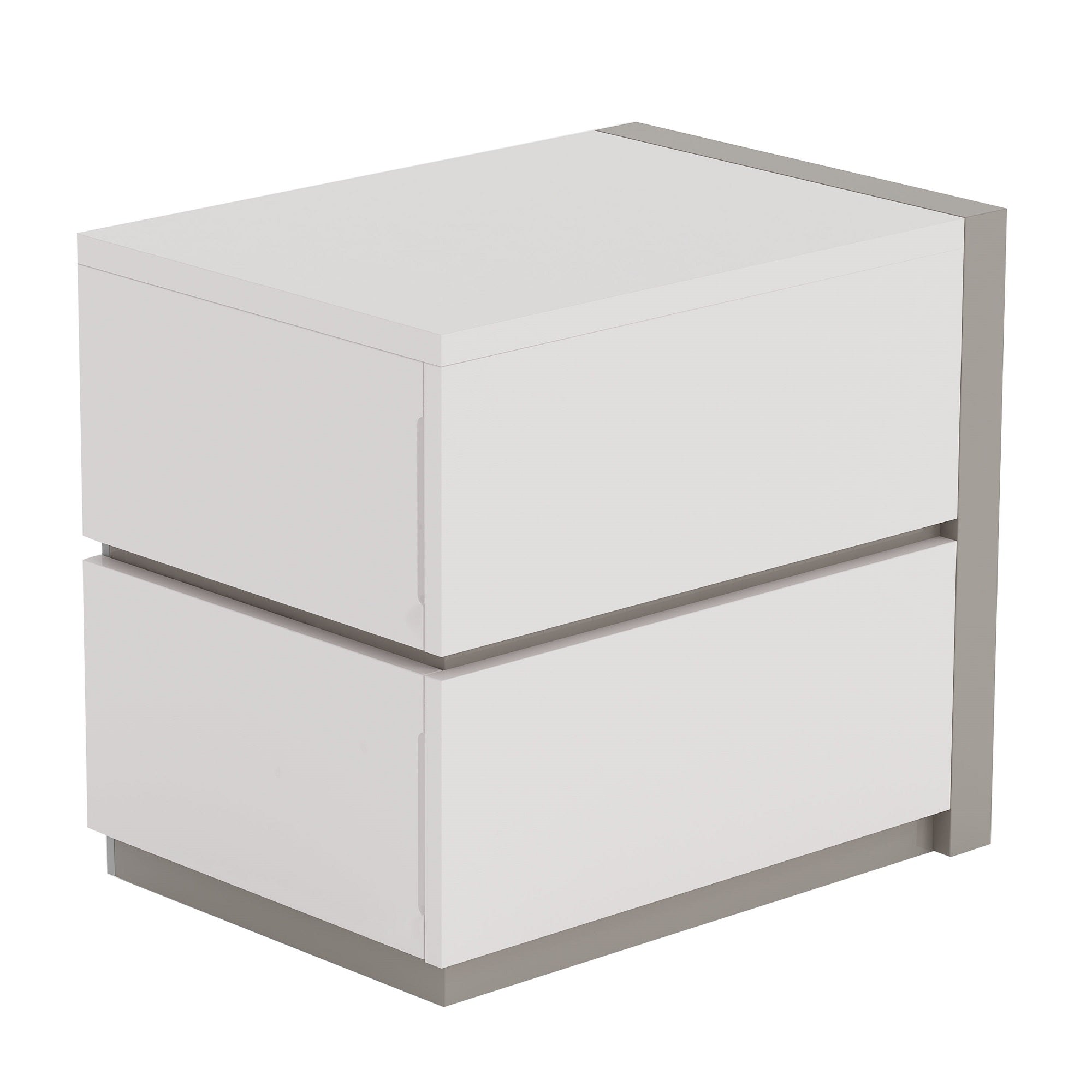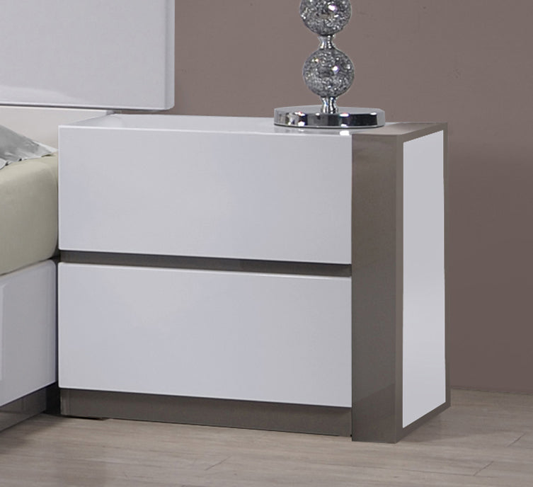 A gorgeous nightstand, featuring sleek, modern lines and all wood frame. The finish is a contemporary gloss white and gray, and it features two spacious drawers for storage and comes fully assembled.
