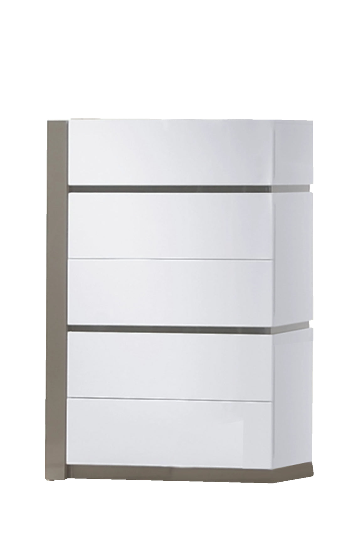 Modern bedroom set with bed, nightstand, dresser and mirror, all featuring a matching moisture-resistant high gloss 2-tone white and gray finish that combines looks and plenty of storage to create the perfect bedroom setting.