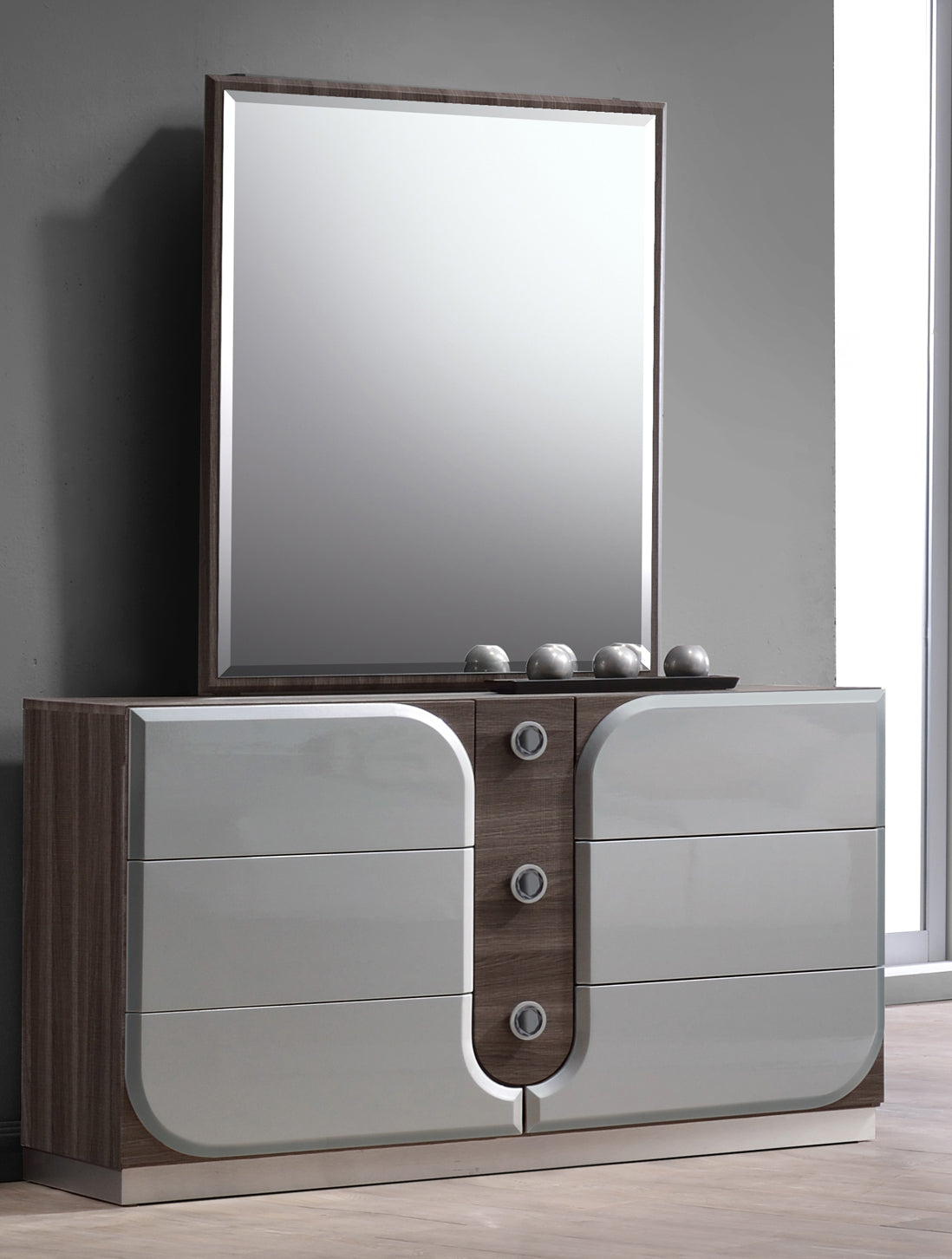 This 2-tone zebra wood and silver line framed mirror features glass w/ a bevel edge, and attaches to the dresser from the matching bedroom collection.