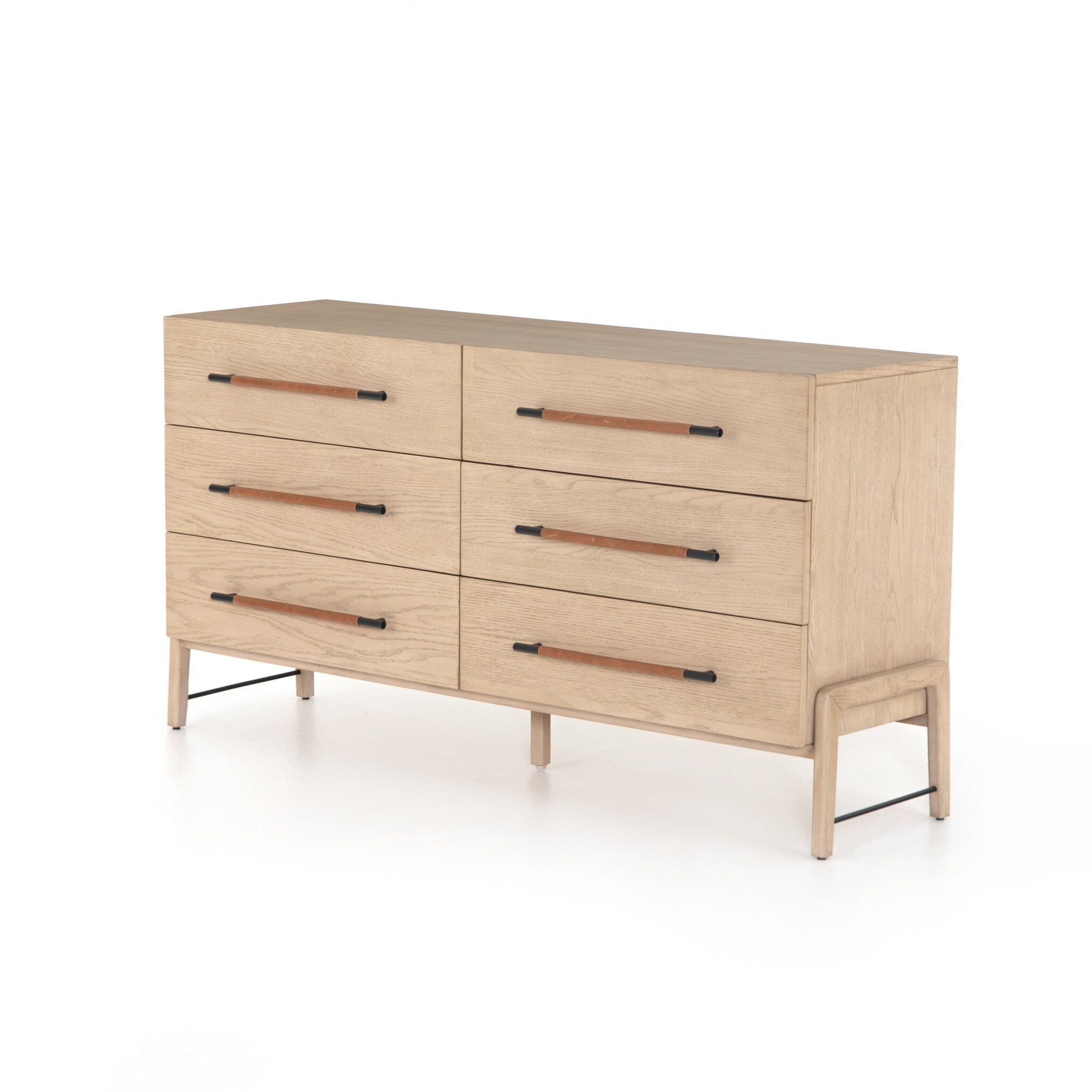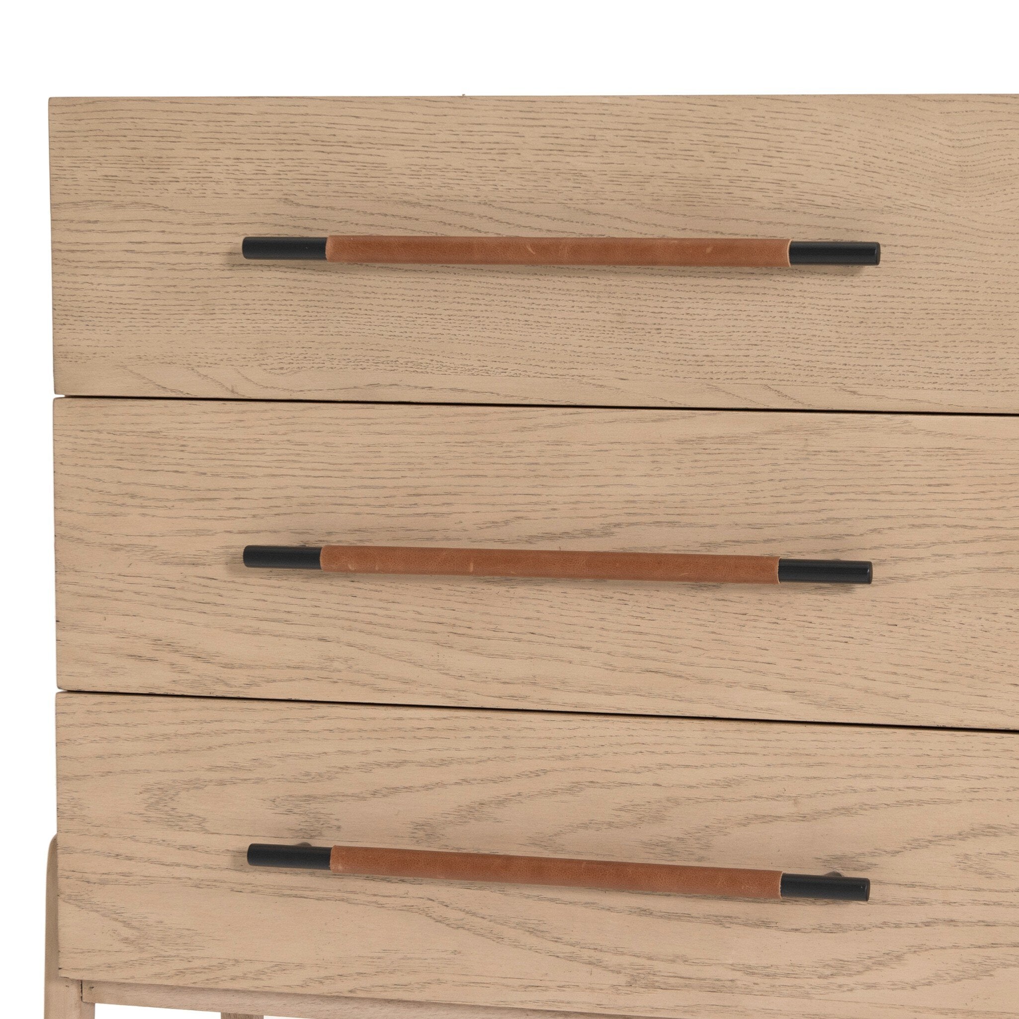 Light-finished oak forms a clean silhouette for six spacious drawers with iron hardware wrapped in tan top-grain leather. This item has been modified to comply with the STURDY Act. See a full list of modified products and data changes in the “STURDY Act†file in the Downloads section below.
