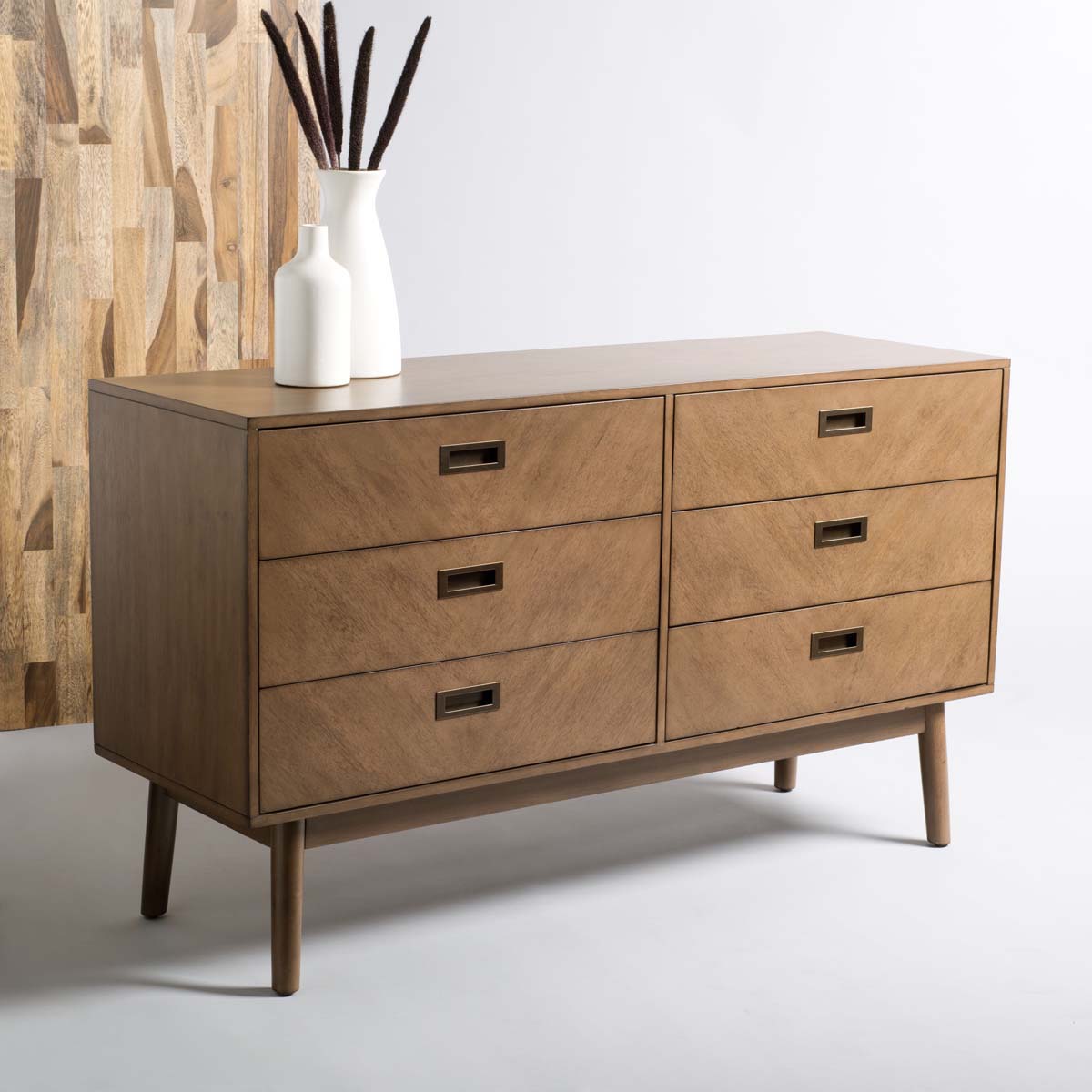 Mid Century chic meets contemporary class in this sophisticated Donald 6 Drawer Dresser. The herringbone inspired pattern on Donald?? solid wood frame in a wheat finish with an acacia veneer makes for a look that?? always in vogue. Subtle bronze pulls add a soft, glamorous touch.