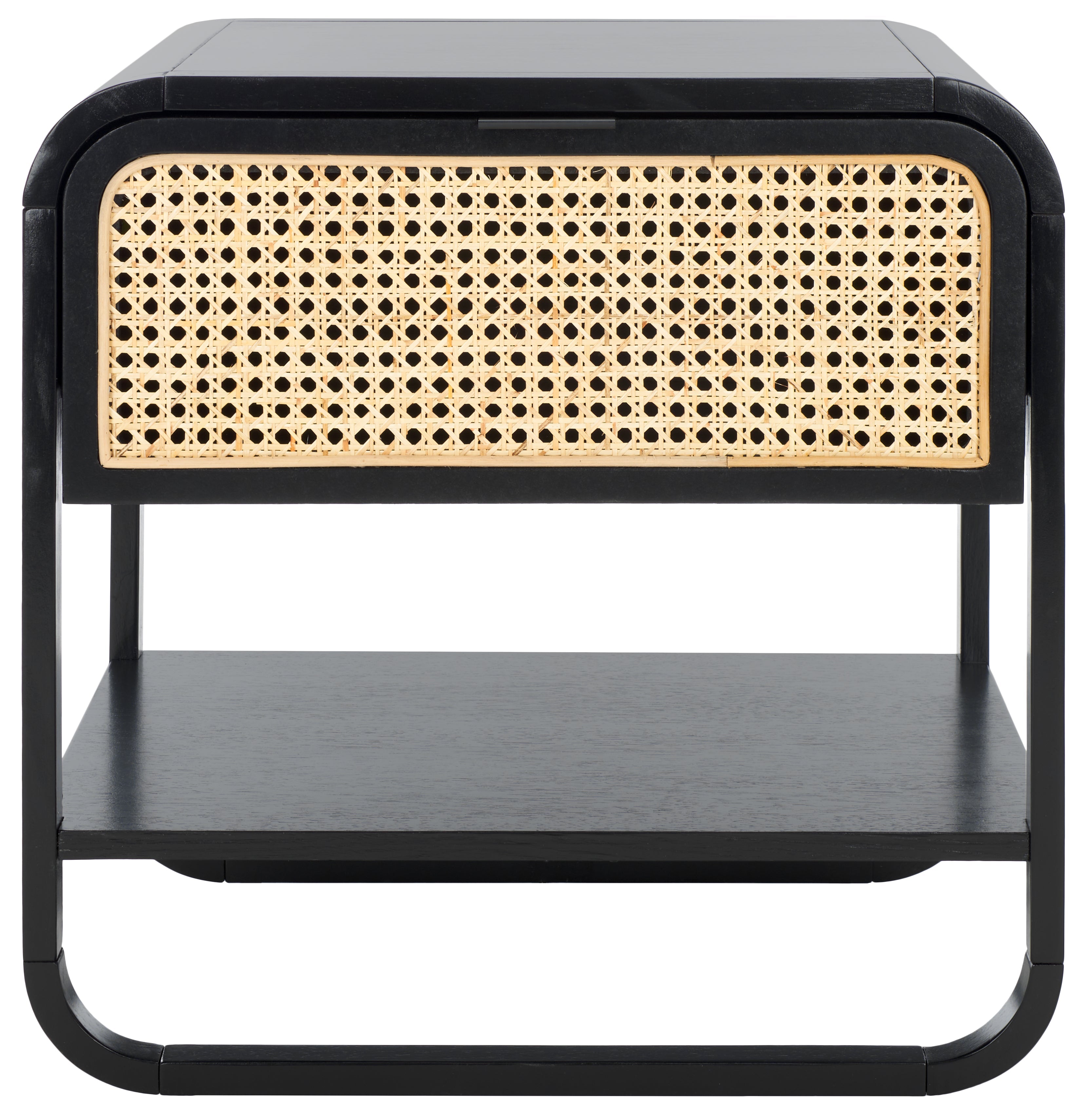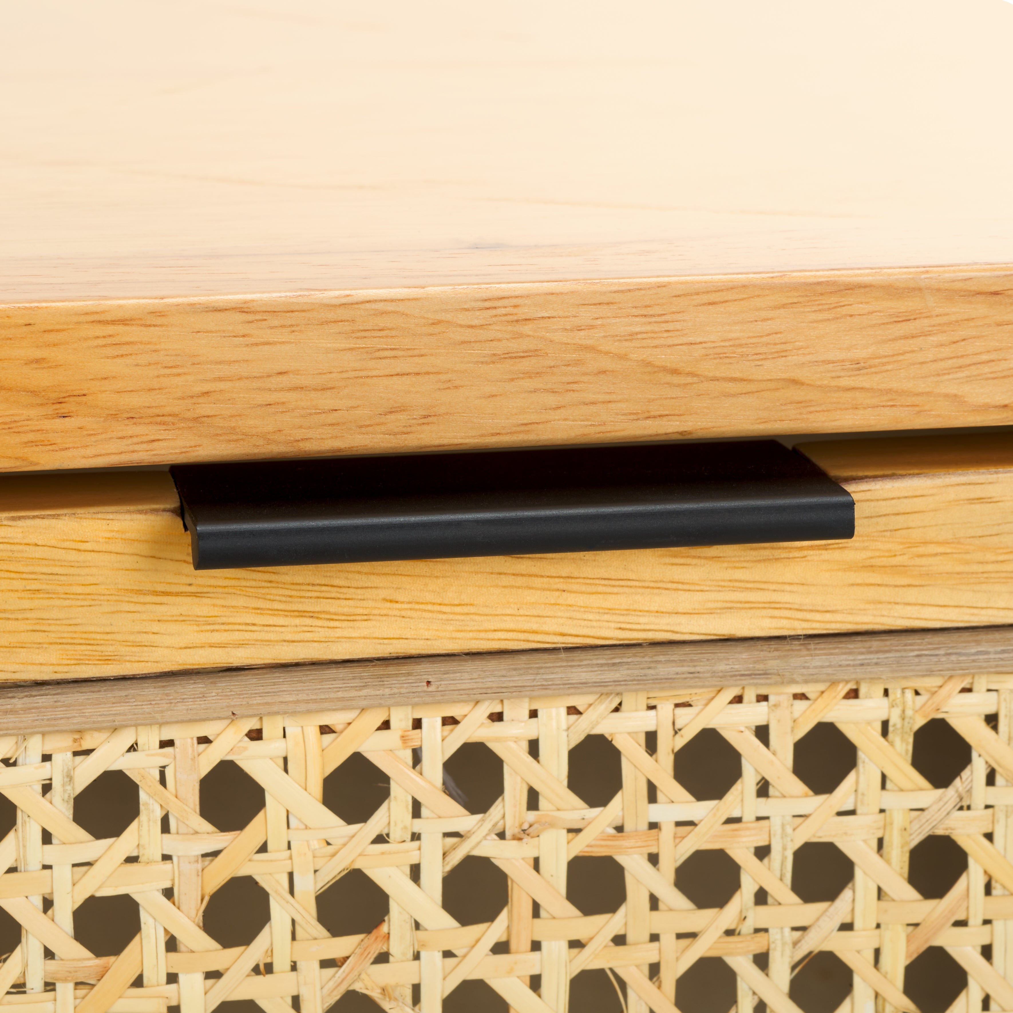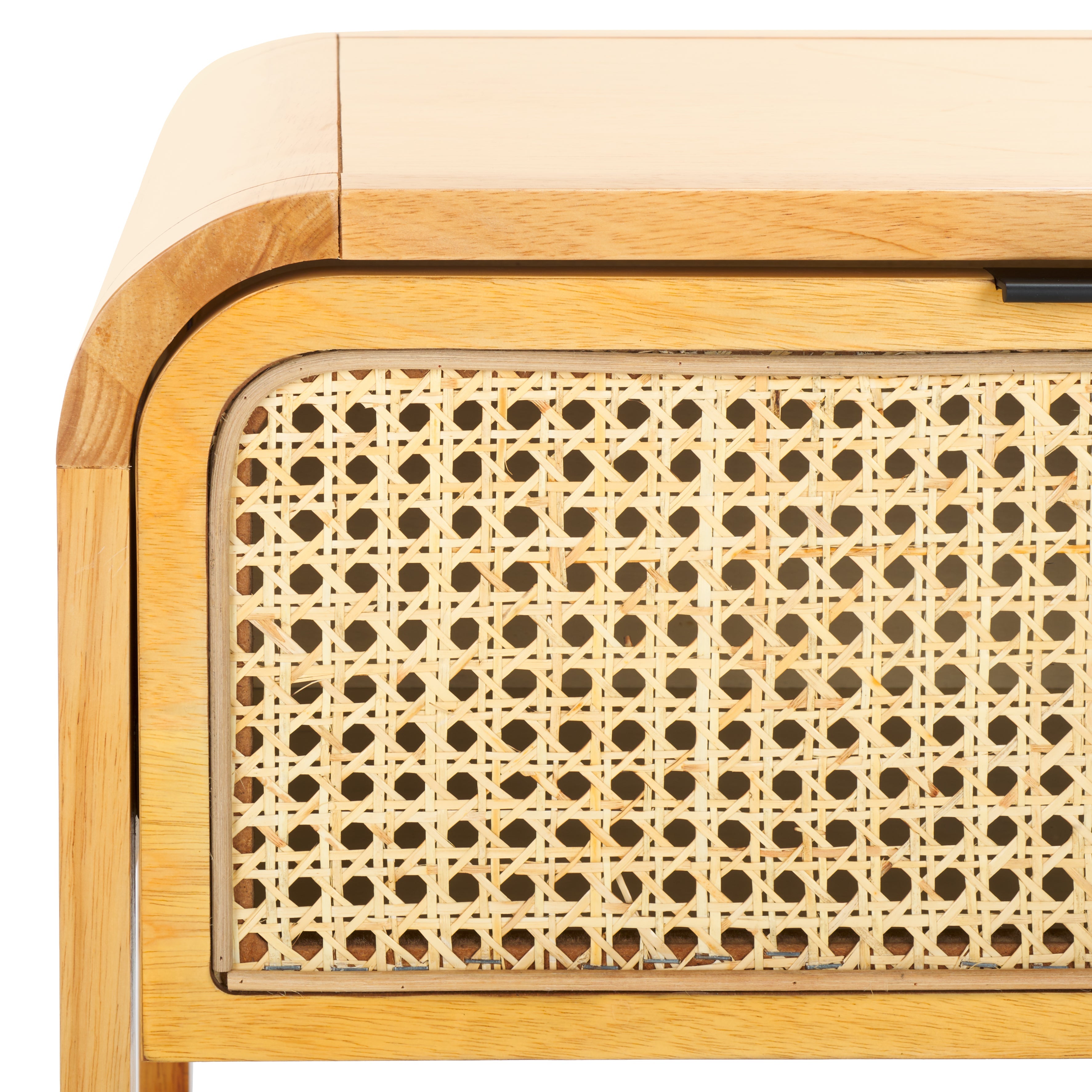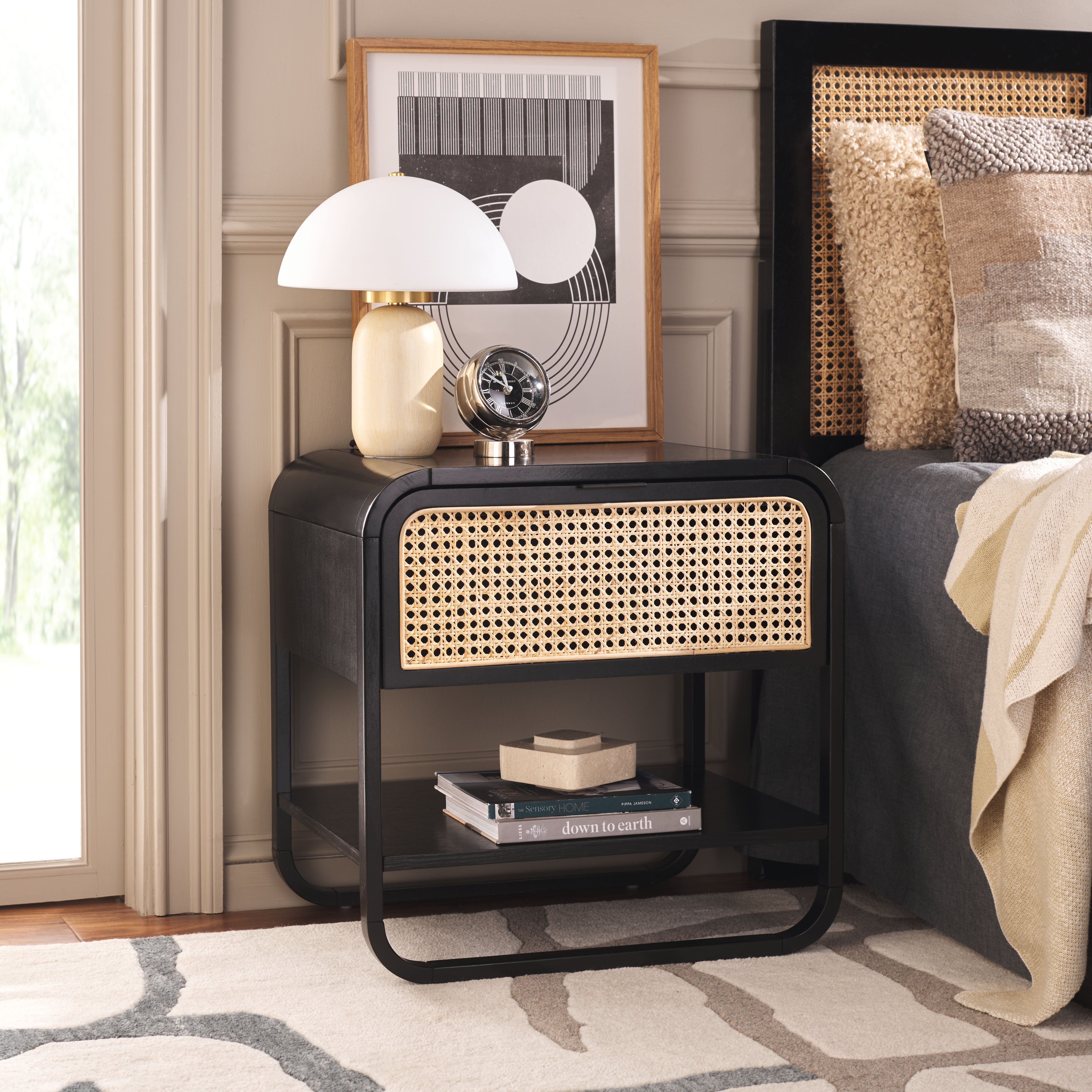 Give a chic and inviting update to your bedroom with our Yunis nightstand. The sleek and airy profile of the nightstand is accentuated with contrasting materials and textures. Woven rattan panels create a warm and breezy contrast with the sleek finish. Finished off with inviting curves and a beautifully tailored pull, our nightstand attains a relaxed and refined presence. It is crafted in solid wood with one drawer and an open shelf to keep your essentials organized and within easy reach.