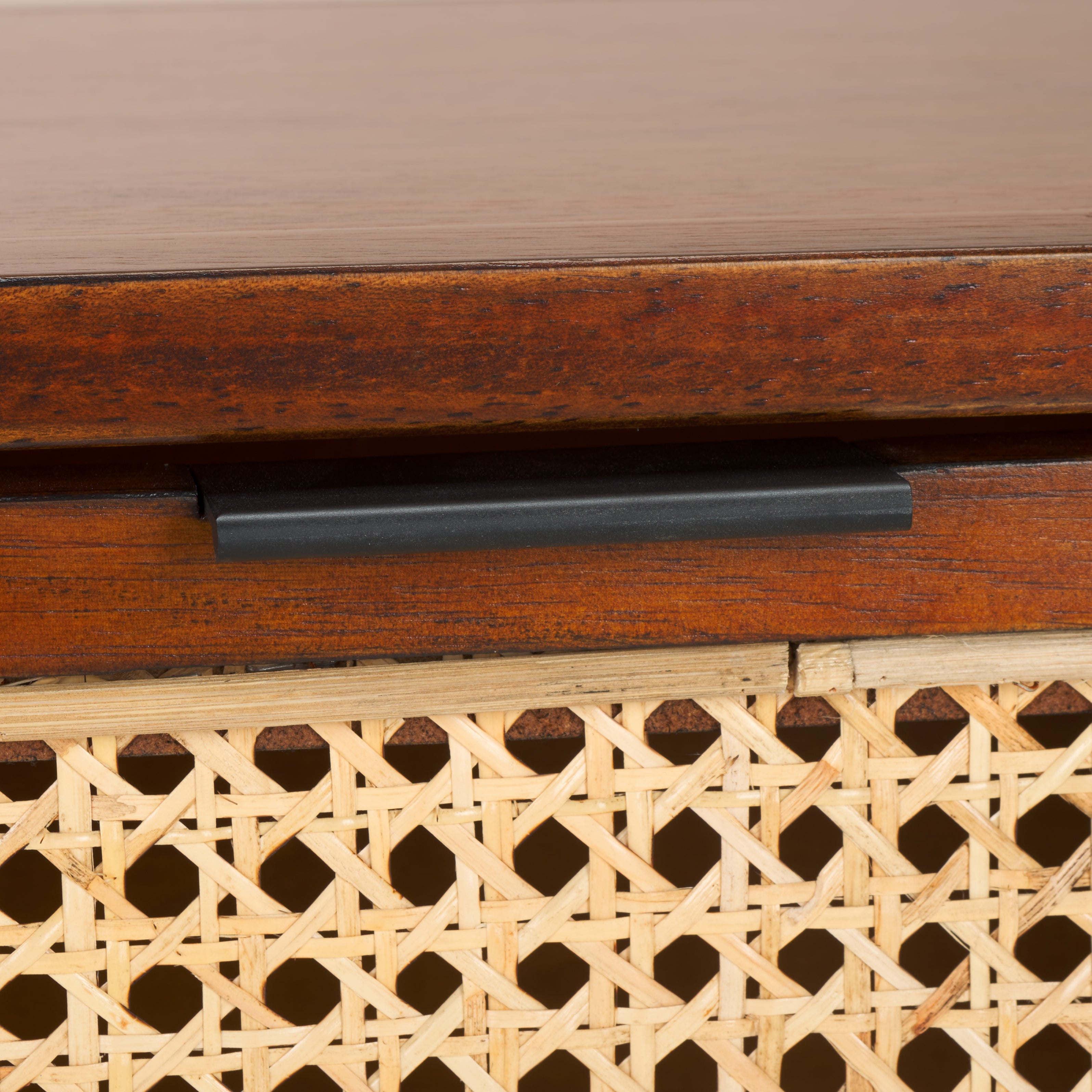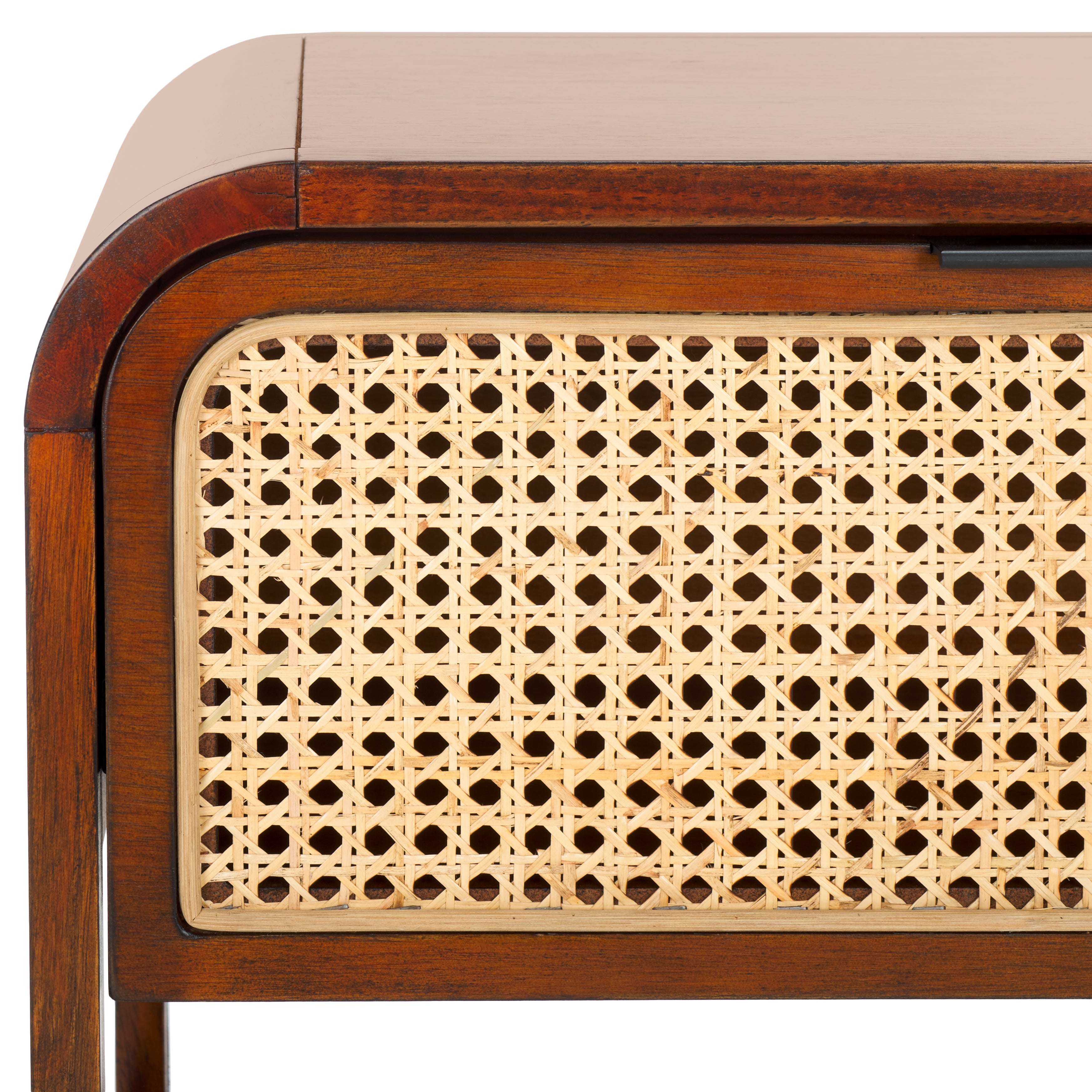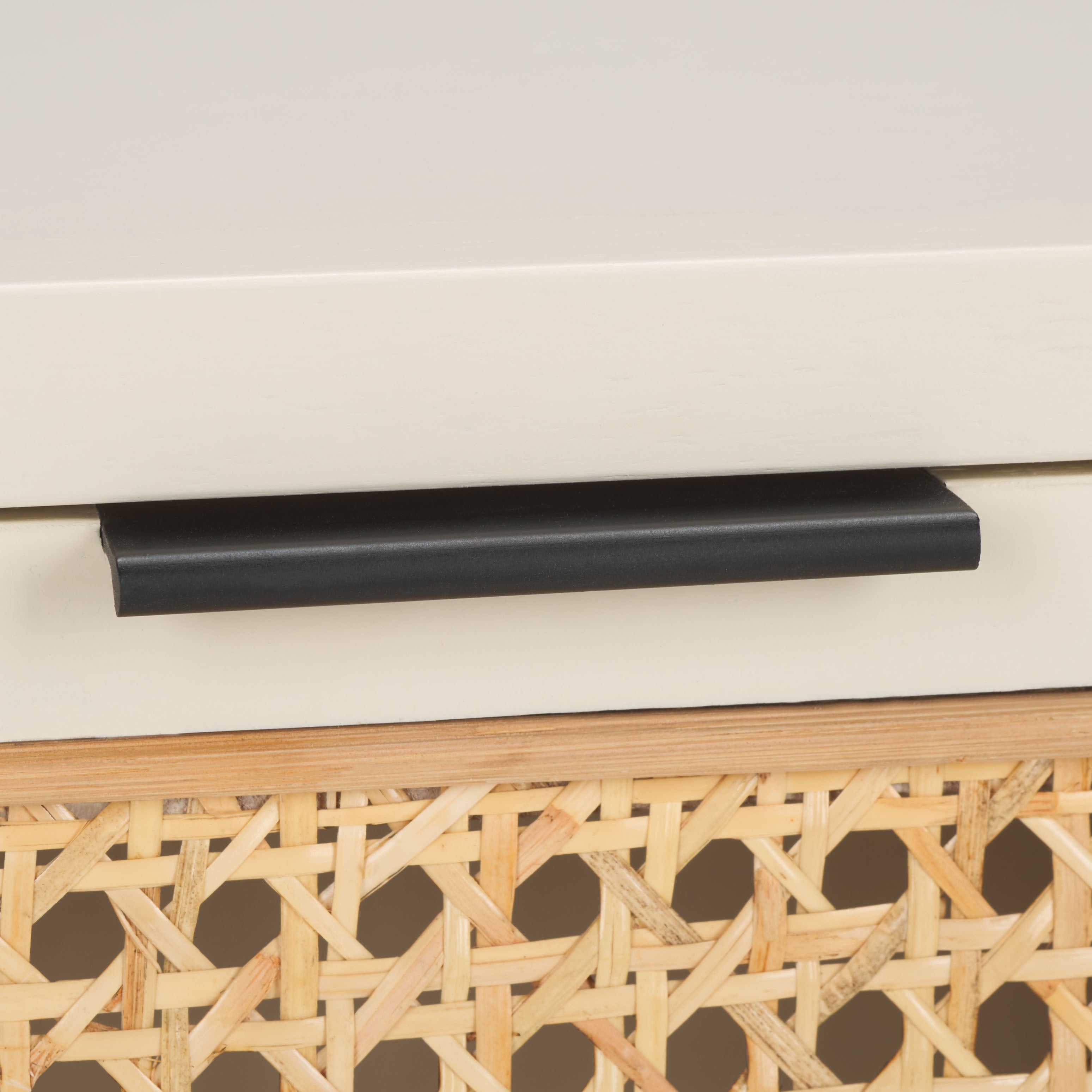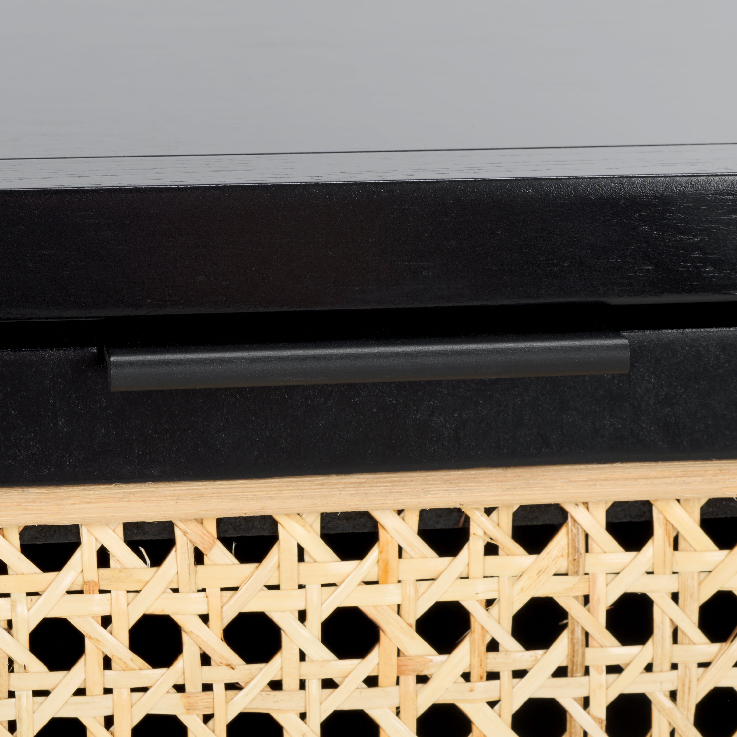 Give a chic and inviting update to your bedroom with our Yunis nightstand. The sleek and airy profile of the nightstand is accentuated with contrasting materials and textures. Woven rattan panels create a warm and breezy contrast with the sleek finish. Finished off with inviting curves and a beautifully tailored pull, our nightstand attains a relaxed and refined presence. It is crafted in solid wood with one drawer and an open shelf to keep your essentials organized and within easy reach.