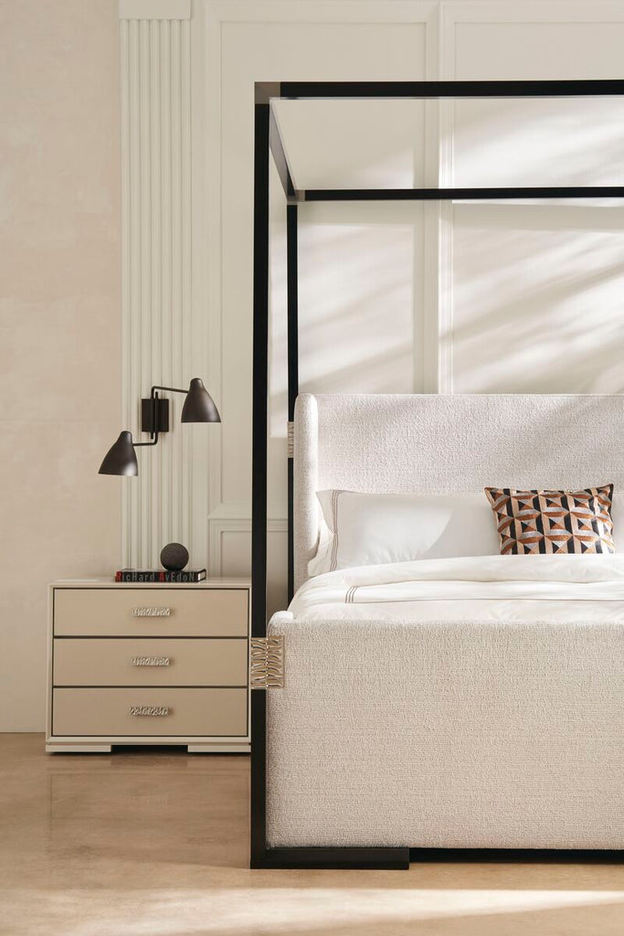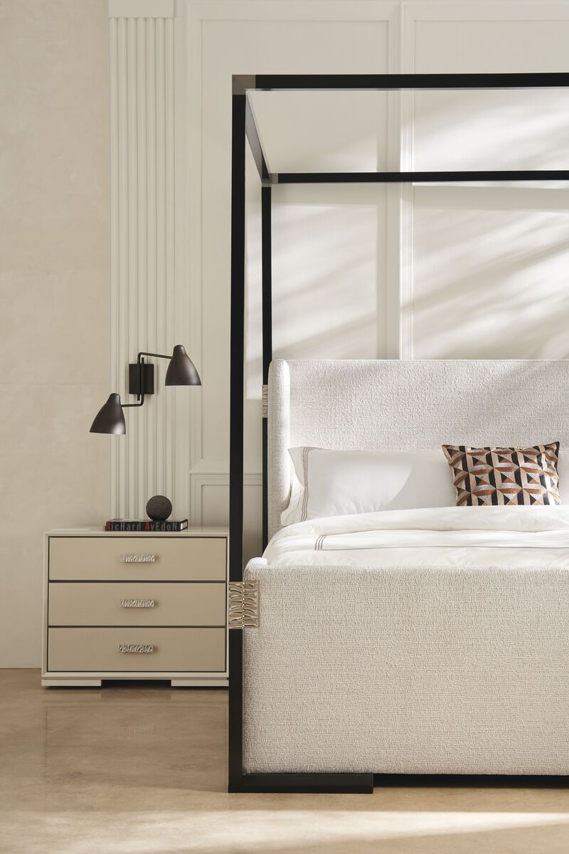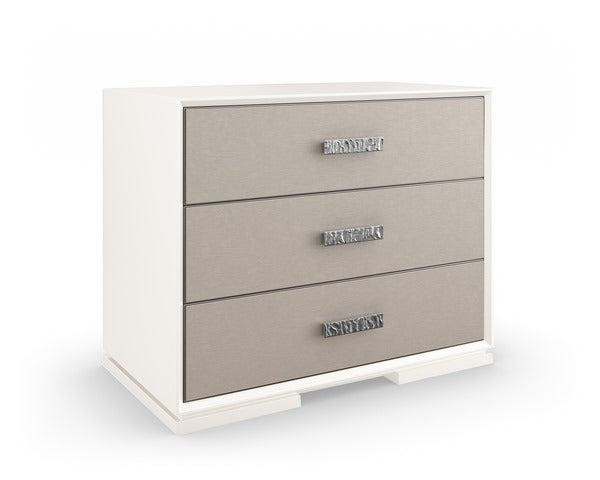A simple form elevated by luxe materials, this classic nightstand brings a hopeful glimmer and sensory experience to bedroom interiors. Inspired by a grand, vaulted dressing room seen by designers while in Milan, vinyl-wrapped drawer fronts are meant to emulate the striation and soft blush color of Venetian silk adorning closet doors. Undulated hardware in Brushed Stainless adds tactile appeal, complemented by a lacquered, Almond Milk finish. Three soft-close drawers offer ample space for neatly keeping bedside essentials.