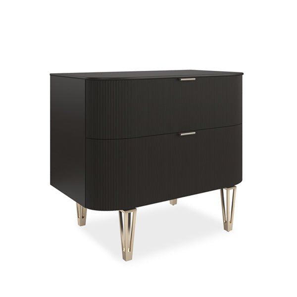No other nightstand will look the same after you’ve experienced the graceful elegance of this head-turner. A palette of DarkChocolate and Whisper of Gold highlight its rounded silhouette and fluted surfaces. This nightstand’s glimmering tapered metal feet in Whisper of Gold add an unforgettable finishing touch.