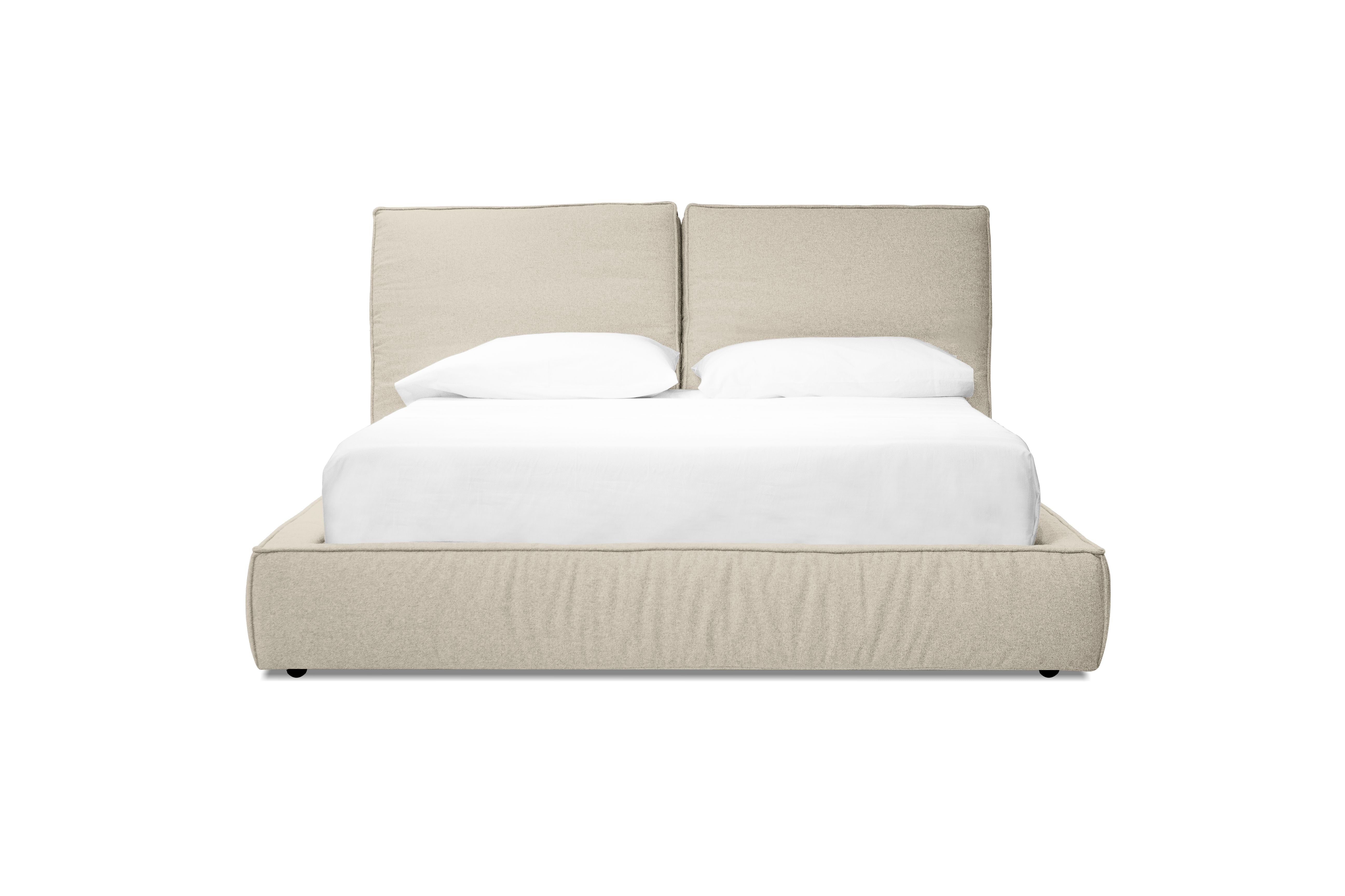The Bendo bed is a boxy linear bed , in line with Italian design . Covered in a soft linen look fabric that adds style to coziness.