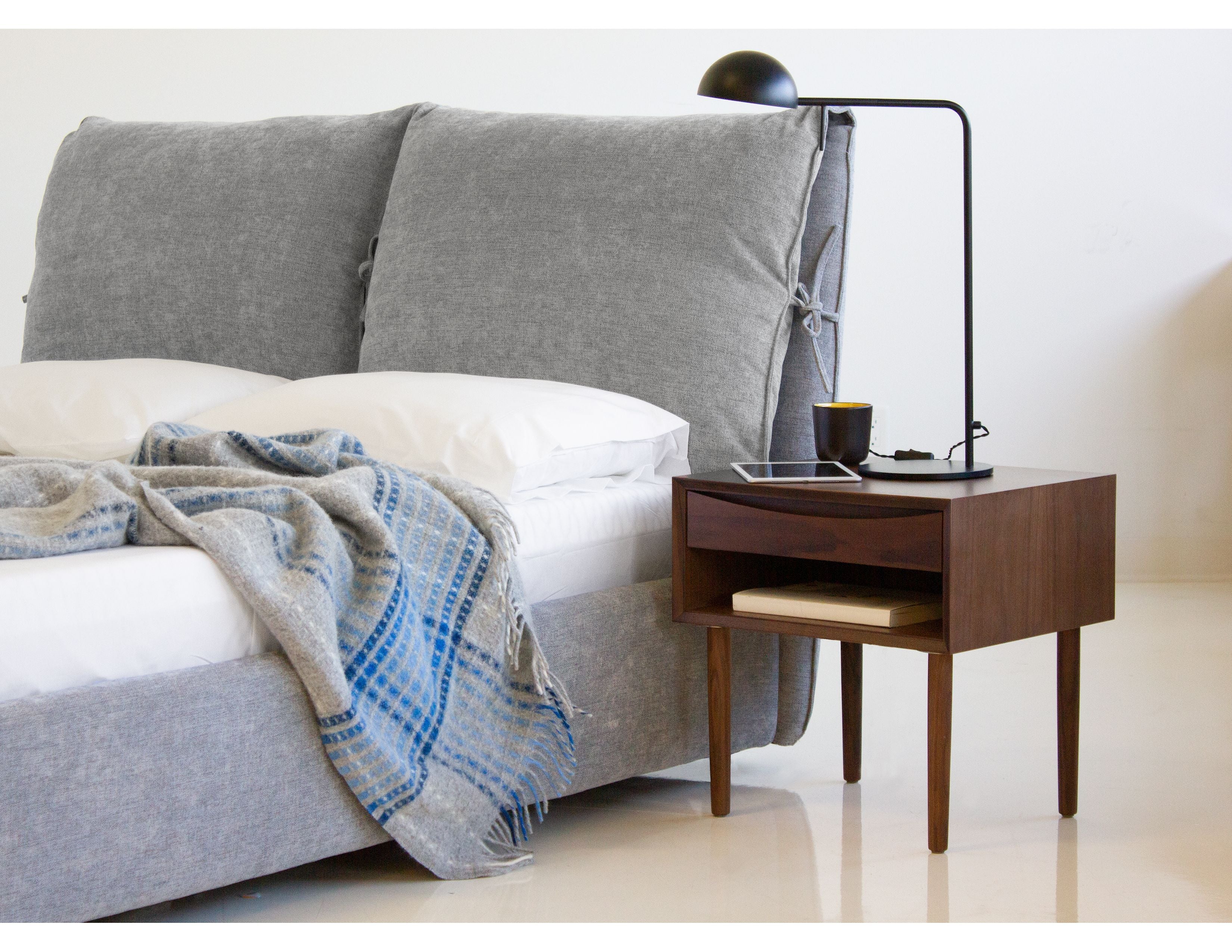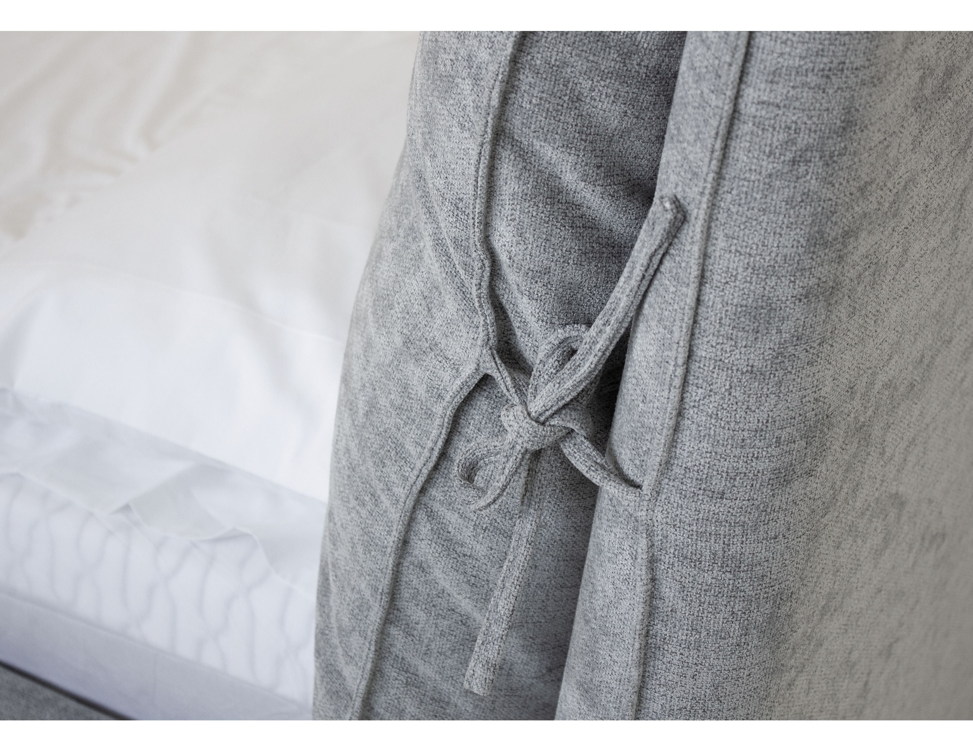 When you think of a feather bed and how luxurious the sleep will be, we instantly found the name for this bed; PLUME. The two extra large pillows are attached with tie-offs and make the perfect headboard to sit up in bed and watch TV, read a book or play on your phone. Available in two fashion colors of cream linen or heather grey Chenille.