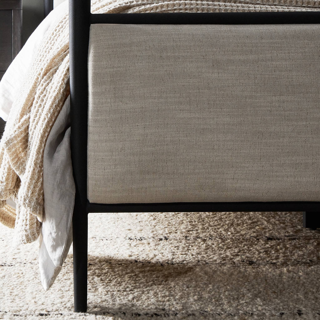 Streamlined and refined. Tapered at the top and bottom, this textured black iron canopy bed fashions a comfortable headboard upholstered in a classic cream hue for contrast.
