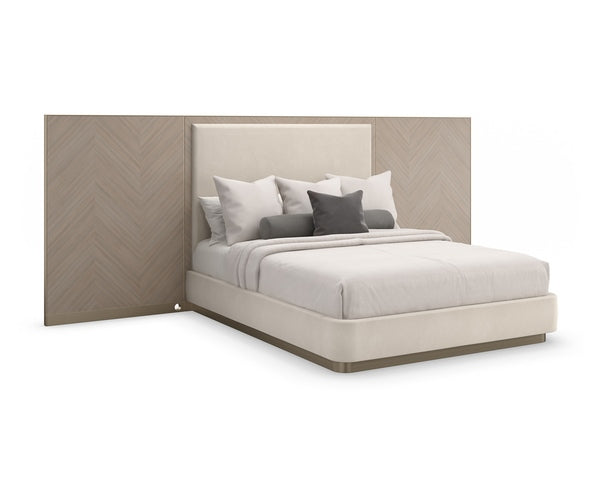 A storied collective of material and form, this classic bed introduces a calming neutral palette that is warm and inviting. Features paneled wings in Koto veneers with a Chevron pattern inspired by early Greek motifs, framing a parsons-style headboard dressed in a soft yet durable wool-like flannel. A metal spline in Brushed Gold lends separation and a hint of shimmer. Seemingly floating on a Brushed Gold plinth base, its sophisticated silhouette brings effortless elegance to bedroom interiors and guest suites.