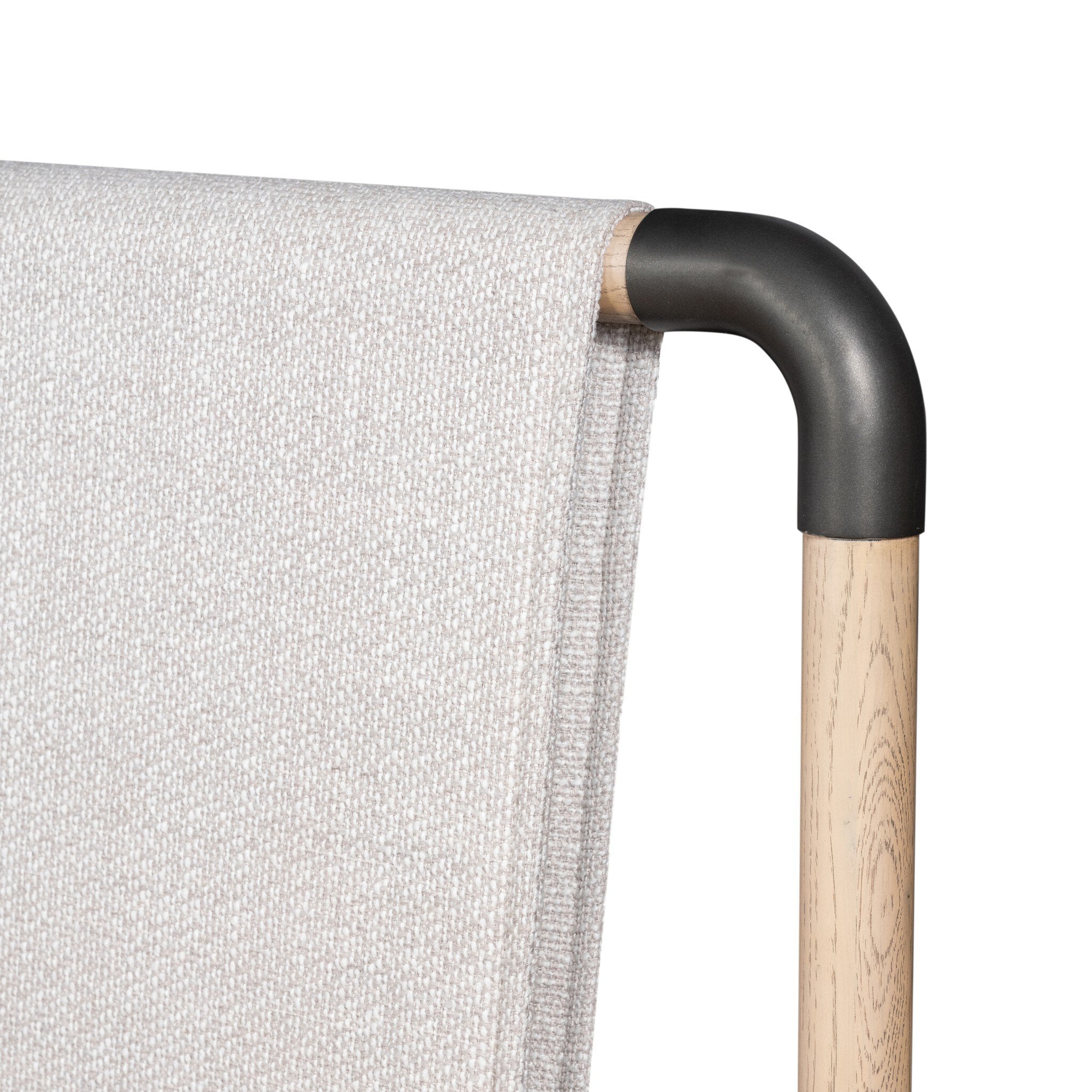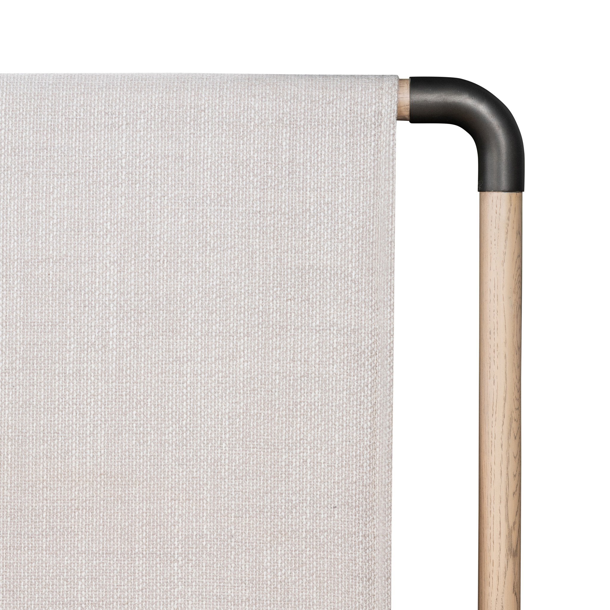 Mixed materials make the bed. Framed by solid oak with rounded iron corners, an upholstered, sling-style headboard brings a light, modern vibe to the bedroom. Performance fabrics are specially created to withstand spills, stains, high traffic and wear, ensuring long-term comfort and unmatched durability.