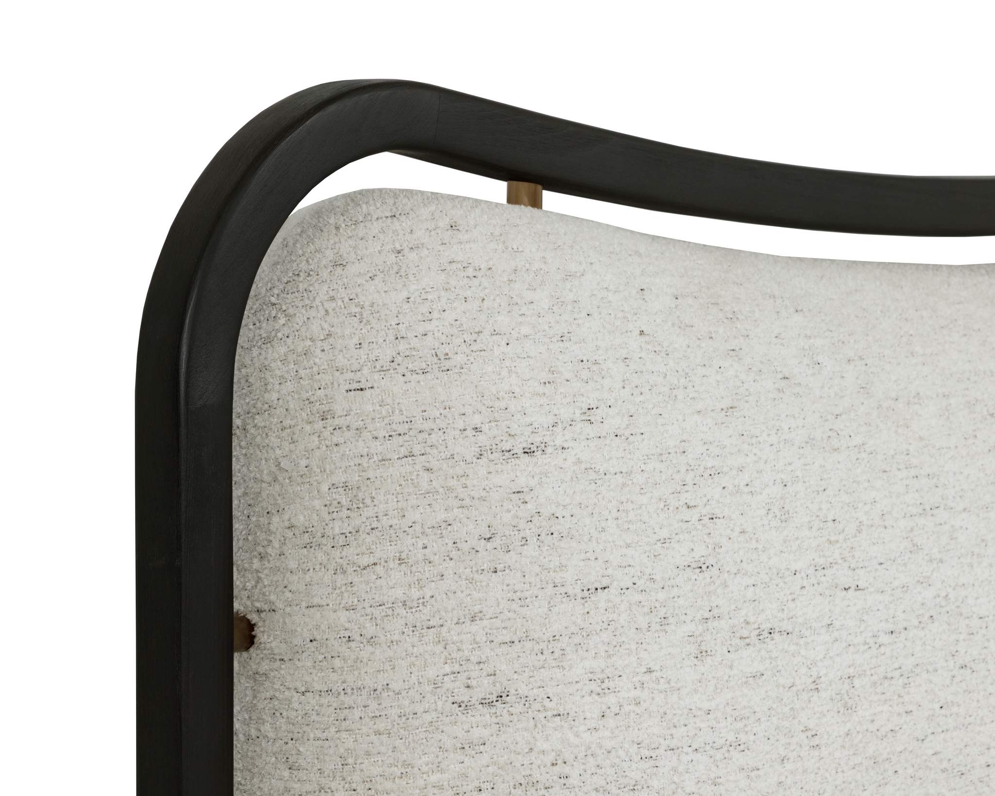 A subtle concave dip in both the headboard and footboard defines the sculptural profile of the Junia Bed. Upholstered in textured boucle, the frame is outlined in curved beech wood trim with decorative brushed gold metal connectors. This modern statement piece exudes versatile appeal for both residential and hospitality spaces.