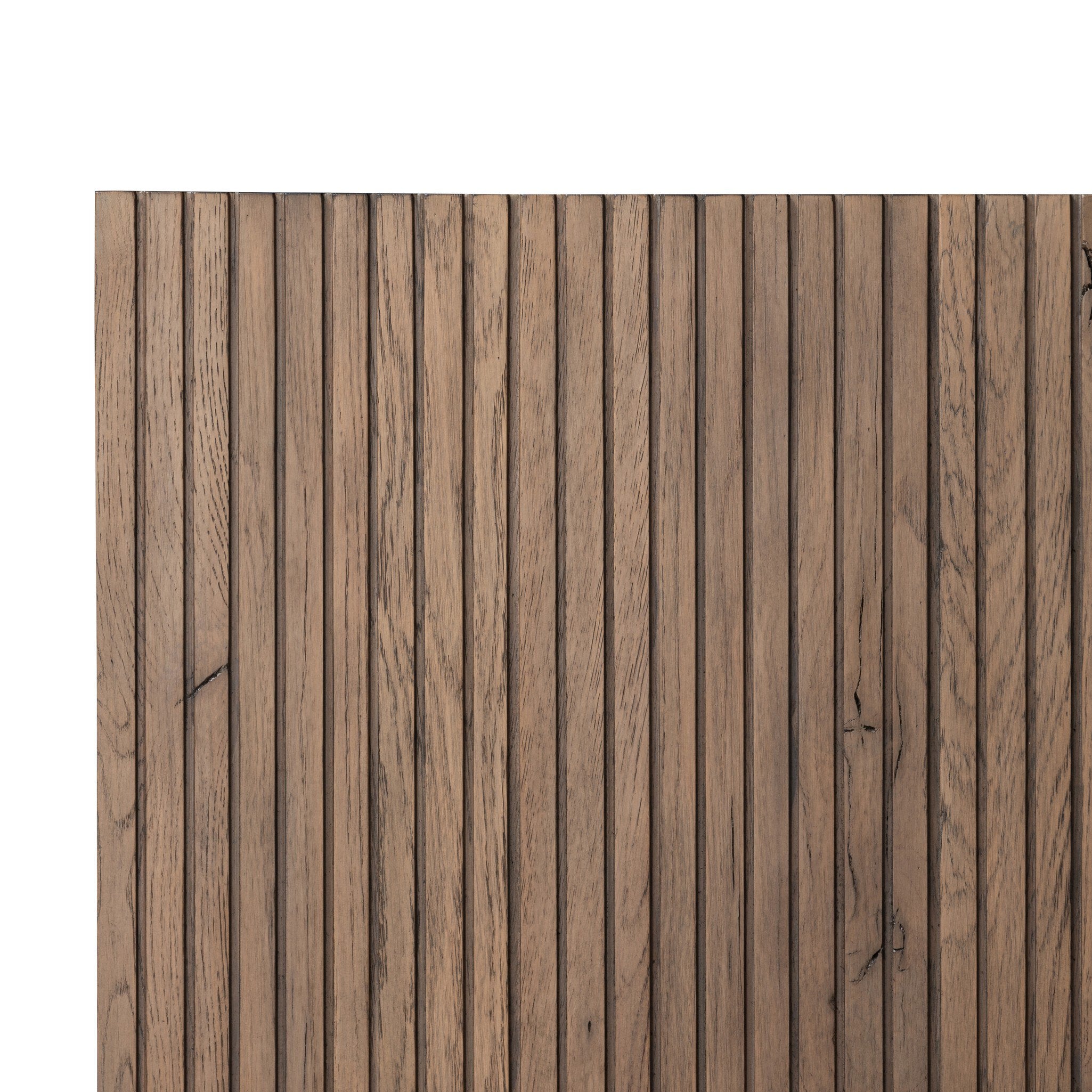 Designed by Thomas Bina and Ronald Sasson, a design partnership blending both modern minimalist and Brazilian influences. Crafted from a mix of solid oak and thick-cut oak veneer, this clean-lined bed features vertical reed detailing on the tall headboard and beautiful horizontal graining on the footboard for extra drama.
