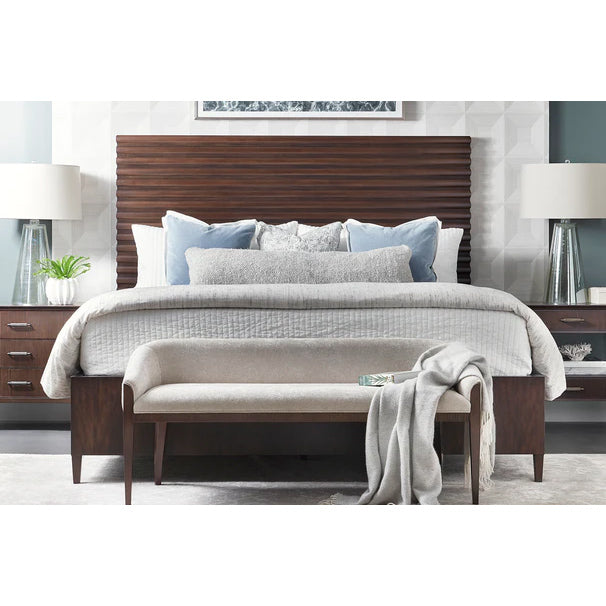 The Lido California King Bed, featuring a stunning horizontal channeled headboard, is crafted from Prima Vera in our deep Bistre finish and sits gracefully upon tapered leg. Side rail Apron clearance 5" (12,7cm); Front Rail apron clearance 5" (12,7cm); Floor to Box slat top 11" (28 cm)