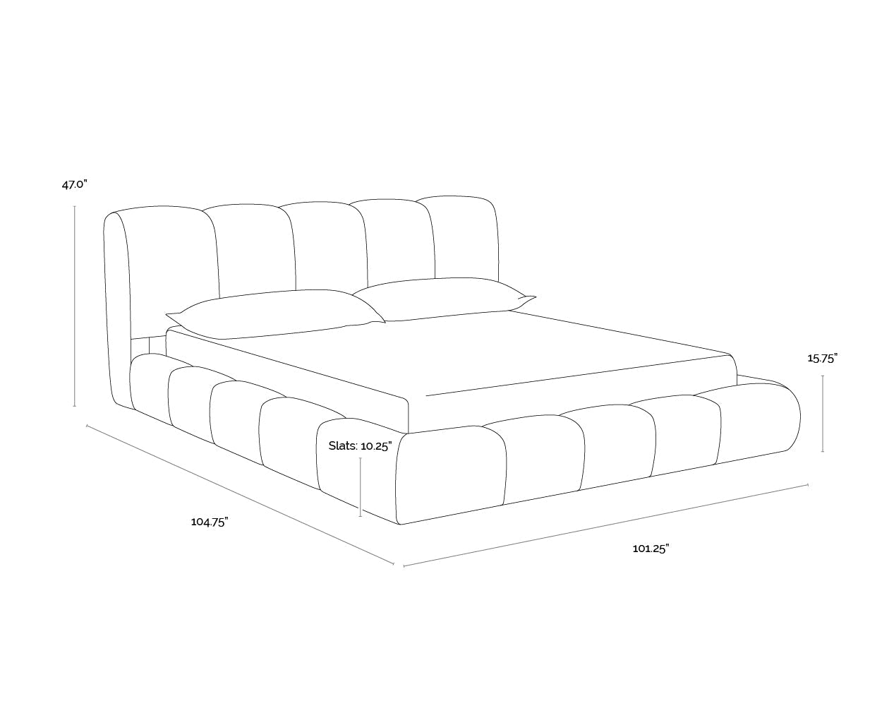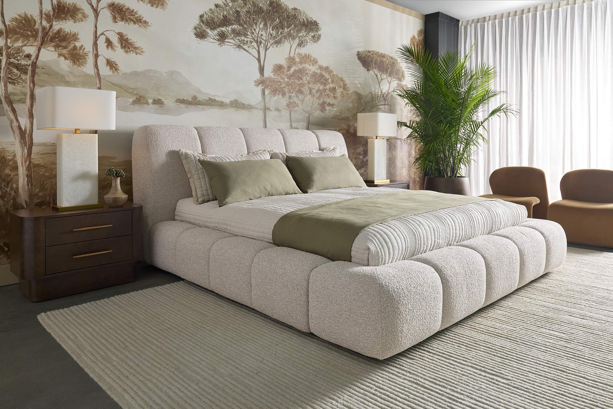 Embrace the luxuriously plush and cozy Olena Bed. A true statement piece that is generously cushioned and upholstered in our plush santa cruz oatmeal with vertical channels.