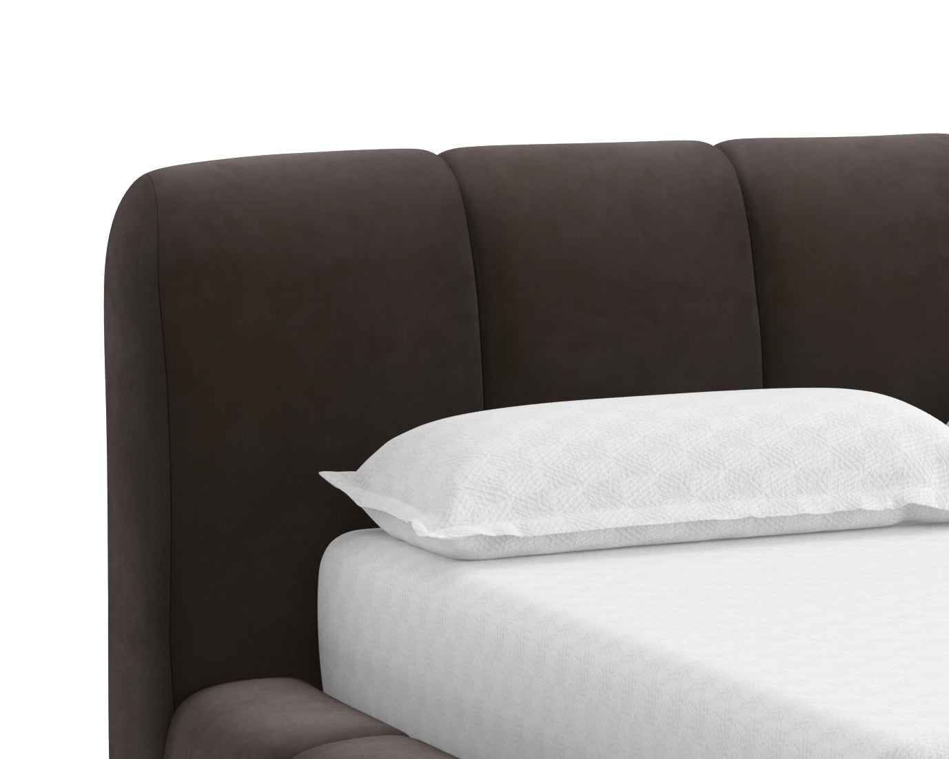 Embrace the luxuriously plush and cozy Olena Bed. A true statement piece that is generously cushioned and upholstered in smooth meg ash fabric with vertical channels. No box spring is required and folding slats are included.