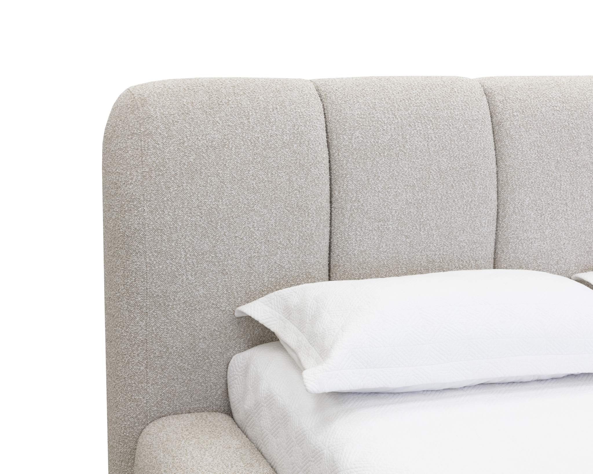 Embrace the luxuriously plush and cozy Olena Bed. A true statement piece that is generously cushioned and upholstered in our plush santa cruz oatmeal with vertical channels.