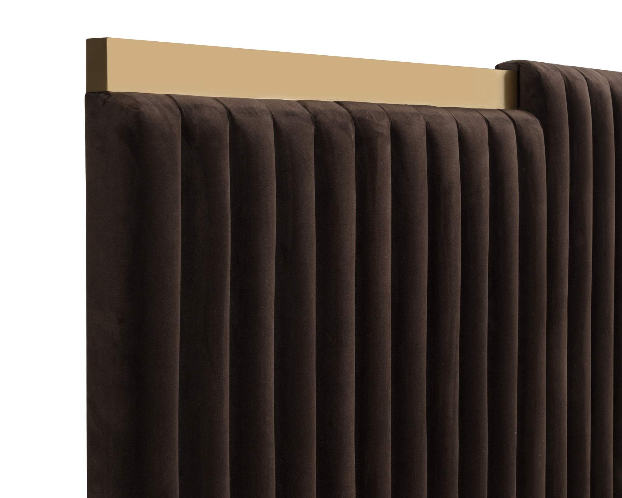 The Tarrant Bed is designed to make a statement. Featuring a large extended headboard in diamond mink fabric on brushed gold steel hardware. Vertical channel tufting on the front of the base and headboard adds visual intrigue to complete the piece.