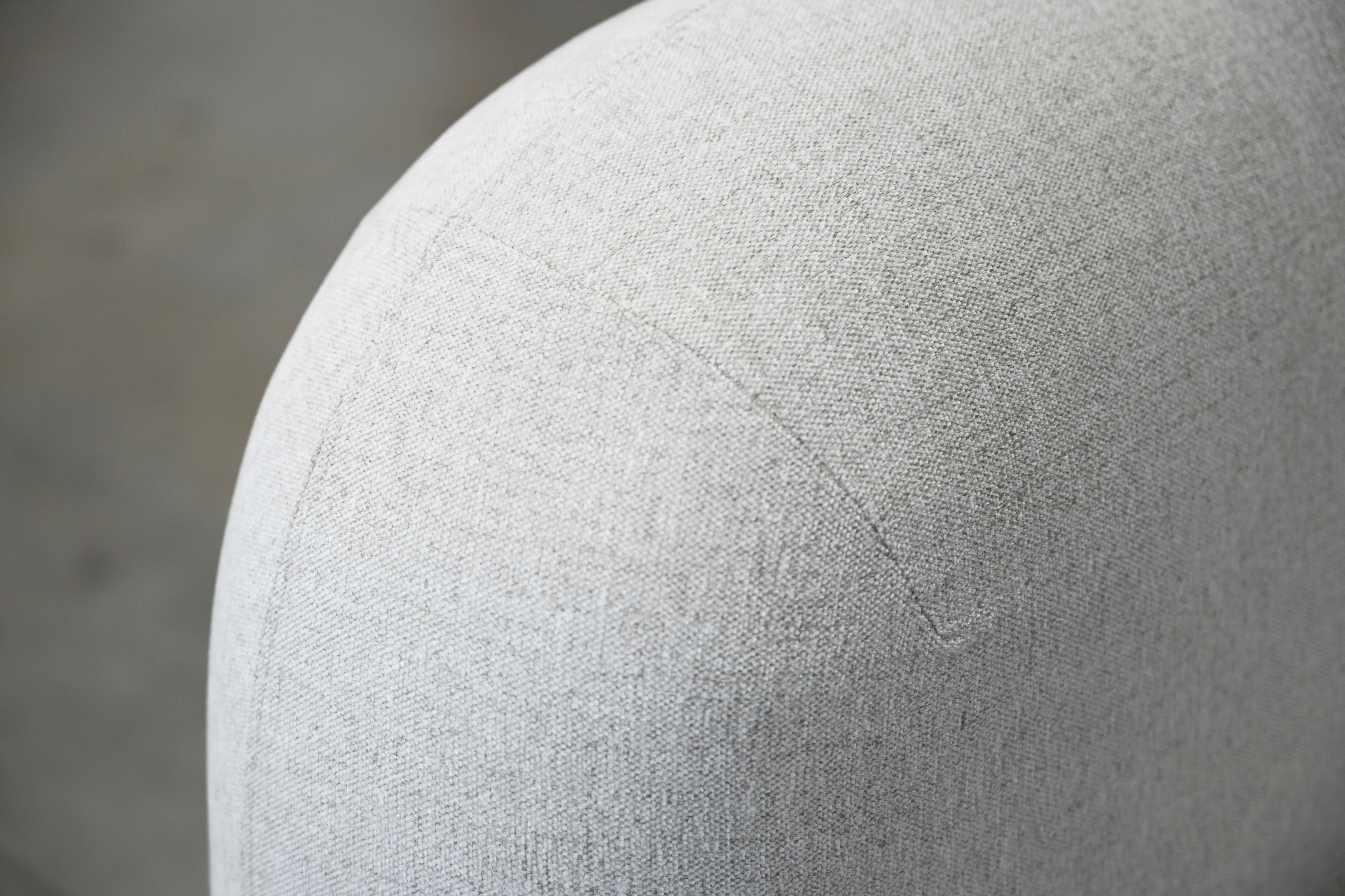 The Rubble Upholstered Bed is draped in a chic cream latte fabric. This bed exudes sleekness, with its slim profile frame and minimalist white oak legs, it presents a refined, uncluttered aesthetic.