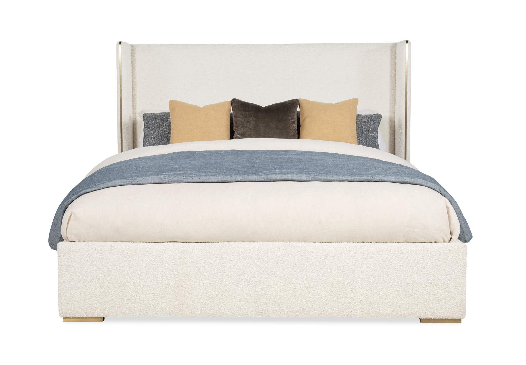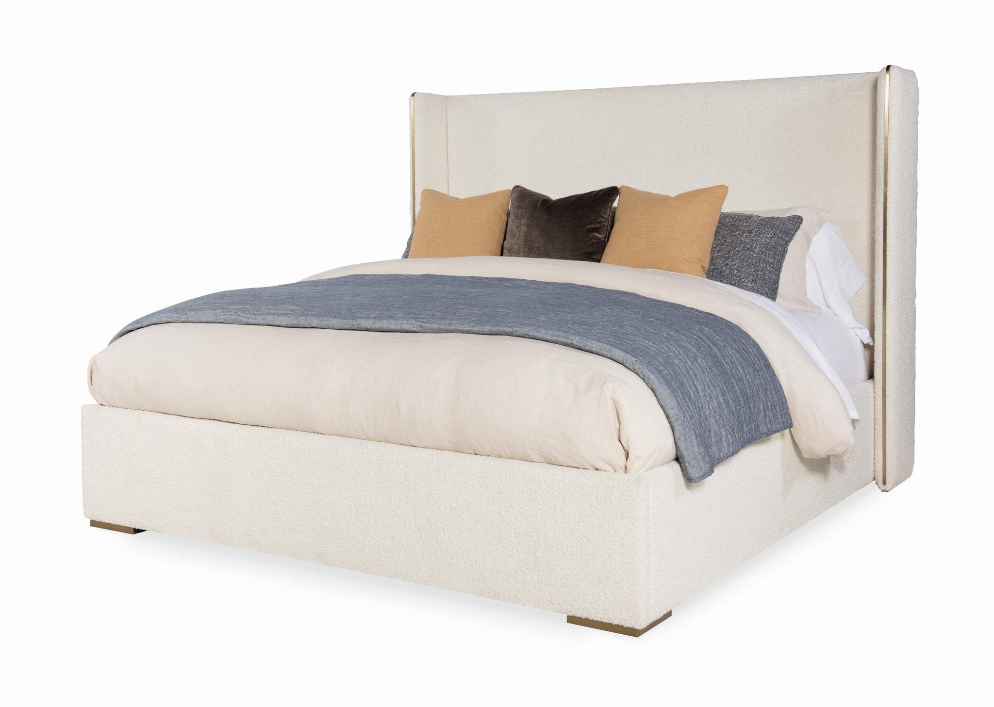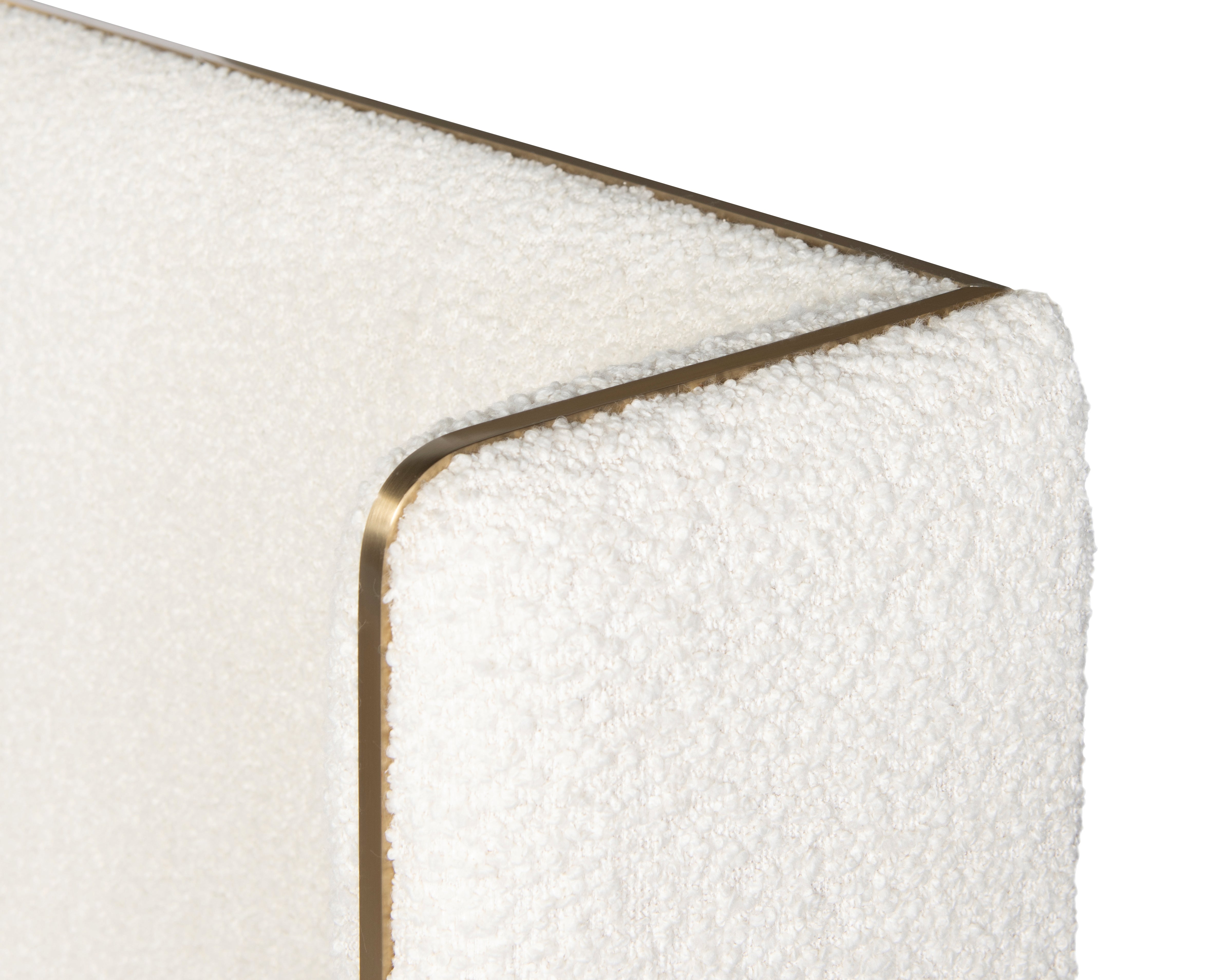 The Cadence Upholstered Wing Bed features a continuous Antique Brass trim detail that extends up from the wings across the top of the headboard. A dreamy, off white boucle fabric envelops the rails, headboard, and wings creating a soft silhouette.