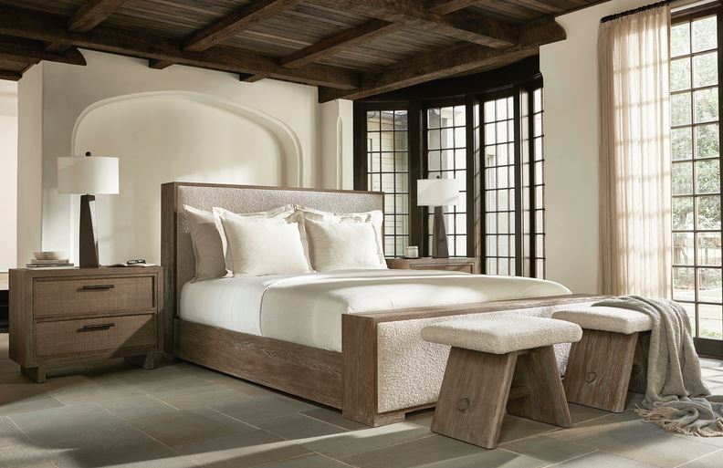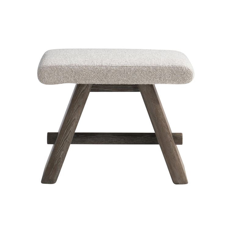 The Casa Paros bench's A-framed base is formed by two side panels and a dowel stretcher. The wooden base in Playa finish supports an upholstered seat to provide both form and function.