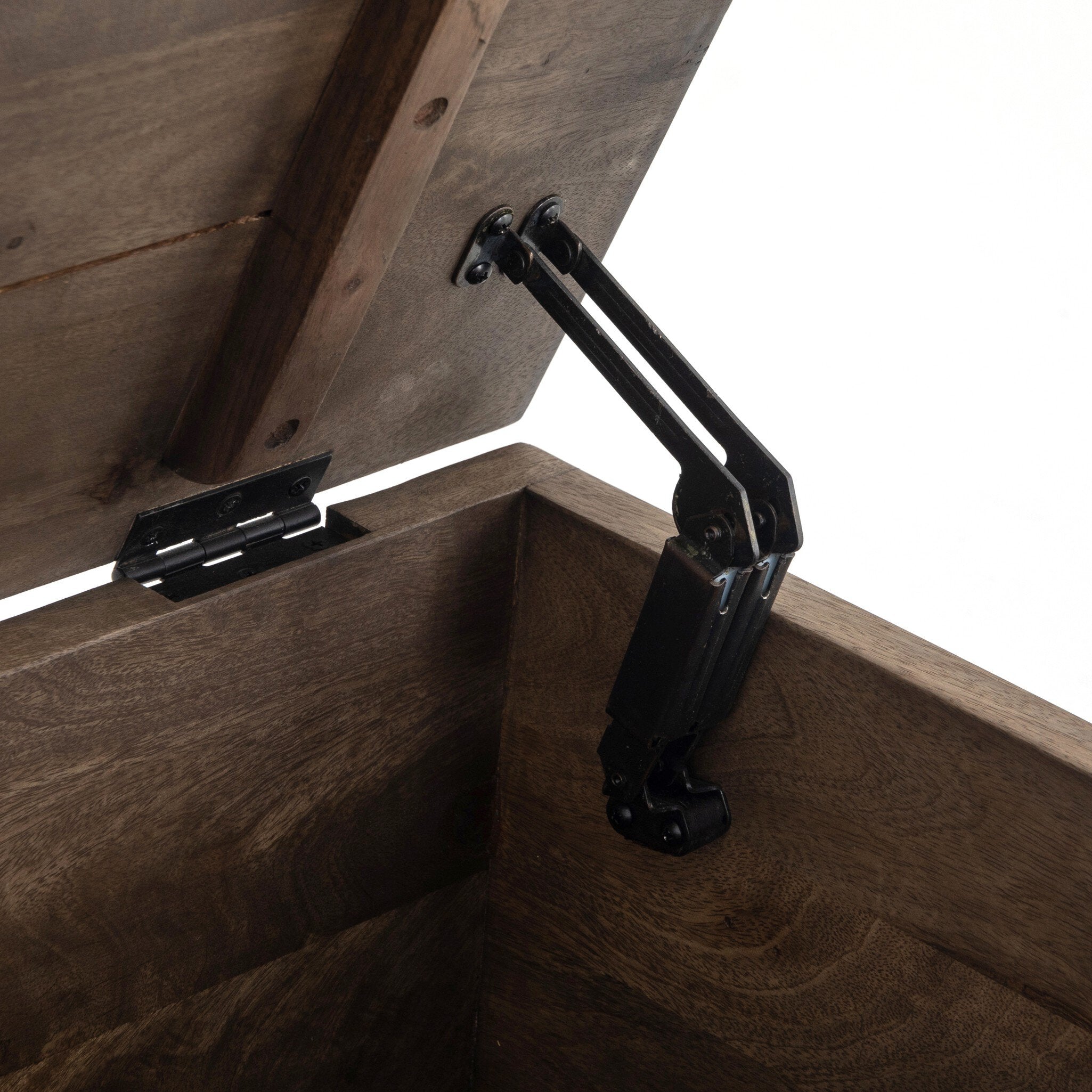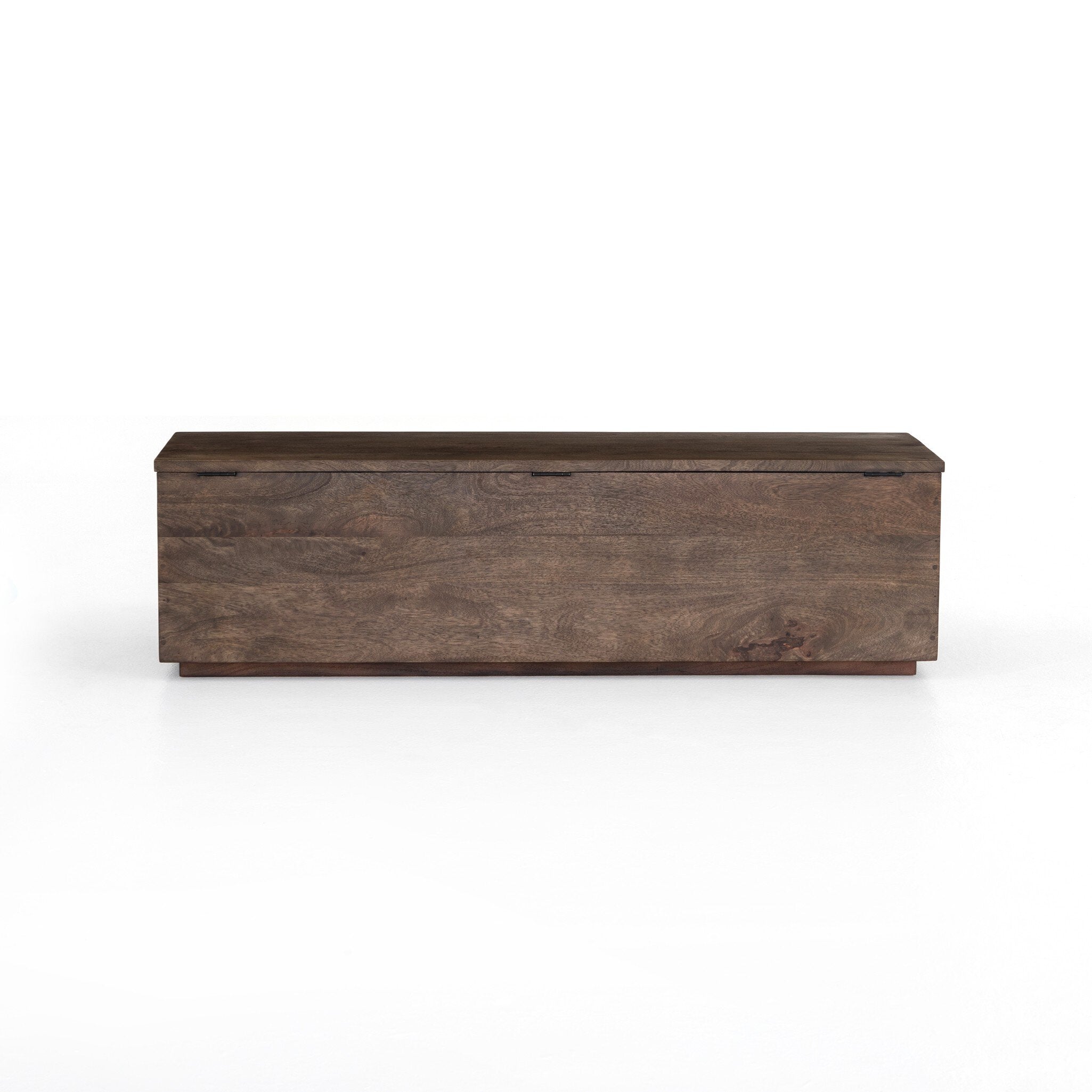 Solid mango adds depth to streamlined shaping. Aged brown tones reveal natural knots and graining for a distinctively found feel. Spacious trunk space perfect in entryway or at the foot of the bed. Plinth base adds a modern touch.