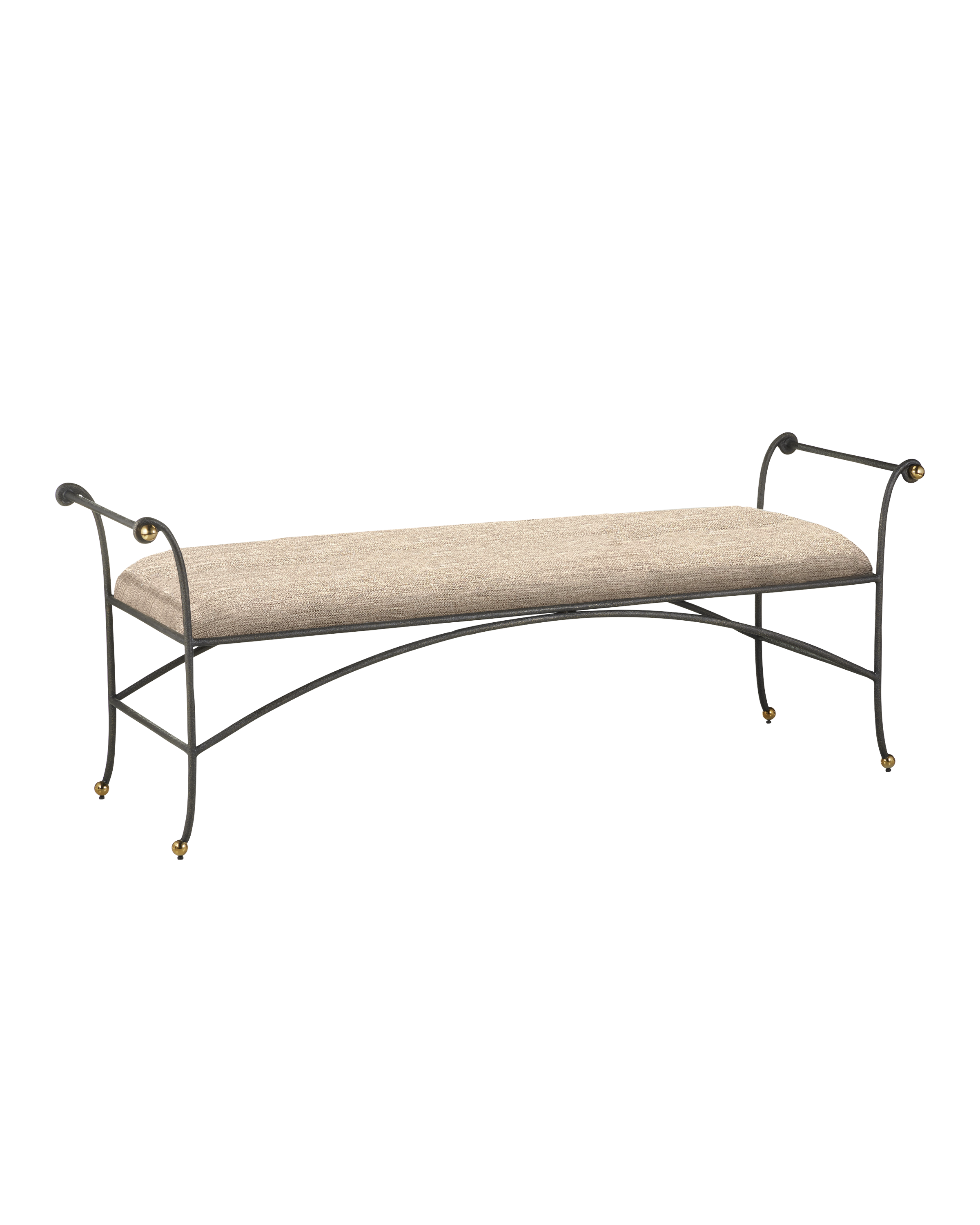 The Mabel Bench is a classic design constructed of textured steel, which has a light gold rub that shows through. Special accents are the polished brass stainless steel ball feet and arm details, as well as the way the stretchers arc up toward the seat. The upholstered top is covered in a woven brown-beige performance fabric, and the seat is a generous 55 inches wide.